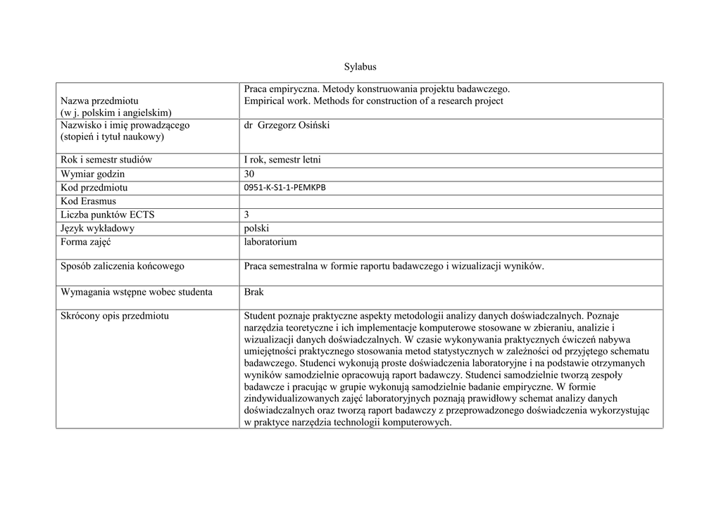 Sylabus Nazwa przedmiotu (w j. polskim i angielskim) Nazwisko i imię prowadzącego (stopień i tytuł naukowy) Praca empiryczna. Metody konstruowania projektu badawczego. Empirical work. Methods for construction of a research project dr Grzegorz Osiński Rok i semestr studiów Wymiar godzin Kod przedmiotu Kod Erasmus Liczba punktów ECTS Język wykładowy Forma zajęć I rok, semestr letni 30 Sposób zaliczenia końcowego Praca semestralna w formie raportu badawczego i wizualizacji wyników. Wymagania wstępne wobec studenta Brak Skrócony opis przedmiotu Student poznaje praktyczne aspekty metodologii analizy danych doświadczalnych. Poznaje narzędzia teoretyczne i ich implementacje komputerowe stosowane w zbieraniu, analizie i wizualizacji danych doświadczalnych. W czasie wykonywania praktycznych ćwiczeń nabywa umiejętności praktycznego stosowania metod statystycznych w zależności od przyjętego schematu badawczego. Studenci wykonują proste doświadczenia laboratoryjne i na podstawie otrzymanych wyników samodzielnie opracowują raport badawczy. Studenci samodzielnie tworzą zespoły badawcze i pracując w grupie wykonują samodzielnie badanie empiryczne. W formie zindywidualizowanych zajęć laboratoryjnych poznają prawidłowy schemat analizy danych doświadczalnych oraz tworzą raport badawczy z przeprowadzonego doświadczenia wykorzystując w praktyce narzędzia technologii komputerowych. 0951-K-S1-1-PEMKPB 3 polski laboratorium Pełny opis przedmiotu Zakres tematów (bloki tematyczne) Literatura (Obowiązkowa, ponadobowiązkowa) Po serii prostych doświadczeń eksperymentalnych, studenci nabywają umiejętności prawidłowego planowania procesu empirycznego. Poznają różnice pomiędzy różnymi schematami badawczymi i uczą się prawidłowego doboru narzędzi analizy danych eksperymentalnych. Praktycznie stosują wiedzę nabytą podczas wykładów w celu właściwego doboru schematu badawczego, zaplanowania odpowiedniej ilości grup badawczych ze szczególnym uwzględnieniem prawidłowego doboru grupy kontrolnej. Samodzielnie przeprowadzają eksperyment badawczy w starannie dobranych warunkach rzeczywistych ucząc się pełnej dbałości i rzetelności badawczej w czasie przeprowadzania badania. Na podstawie zebranych danych doświadczalnych z użyciem technologii komputerowych studenci dokonują analizy danych i określają parametry wyjściowe w odniesieniu do hipotezy zerowej. Samodzielnie konstruują pełny raport badawczy łącznie z wizualizacją wyników, który prezentują podczas zajęć jako podstawowy element zaliczenia przedmiotu. 1. Przeprowadzenie prostego doświadczenia pomiarowego. Zastosowanie standardowego rozkładu normalnego do zbioru zmiennych losowych otrzymanych w wyniku pomiaru. Szacowanie błedu. Określenie zmiennych zależnych i niezależnych. 2. Opracowanie analizy statystycznej z samodzielnie zebranego materiału doświadczalnego. 3. Utworzenie zespołów badawczych oraz określenie tematyki badawczej oraz sformułowanie hipotezy zerowej. 4. Dobór właściwych metod analizy statystycznej w celu analizy otrzymanych wyników doświadczenia. 5. Opracowanie raportu badawczego na podstawie samodzielnie przeprowadzonego doświadczenia. Argumentacja o słuszności bądź odrzuceniu hipotezy zerowej. 6. Opracowanie prezentacji raportu badawczego łącznie z wizualizacją wyników. Obowiązkowa: Bedyńska, S., Brzezicka, A. (2008). Statystyczny dorogowskaz. Wydawnictwo Szkoły Wyższej Psychologii Społecznej ACADEMIKA. Bielski, A., Ciuryło, R. (2005). Podstawy metod opracowania pomiarów. Toruń: Wydawnictwo UMK. Ponadobowiązkowa: Francuz, P., Mackiewicz, R. (2007). Liczby nie wiedzą skąd pochodzą. Przewodnik po metodologii i statystyce nie tylko dla psychologów. Lublin: Wydawnictwo KUL. Maruszewski, T. (2000). Pamięć jako podstawowy mechanizm przechowywania doświadczenia. W: J.Strelau (red.), Psychologia. Podręcznik akademicki. Tom 2, str. 137-164, Gdańsk: GWP. Anderson, J.R. (1987). Metodologies for studying human knowledge. Behavioral and Brain Science, 10, 467-505. (tłumaczenie artykułu + komentarze w: Z.Chlewiński, Psychologia poznawcza. Metodologia badania wiedzy ludzkiej, str. 27-124.). Nęcka, E. (2000). Procesy uwagi. W: J.Strelau (red.), Psychologia. Podręcznik akademicki. Tom 2, str. 77-96, Gdańsk: GWP. Oliver, P. (1999). Jak pisać prace uniwersyteckie. Warszawa: Wydawnictwo Literackie Cele (z punktu widzenia nauczyciela) Odniesienie do kierunkowy ch efektów kształcenia Efekty kształcenia Odniesienie do obszarowych efektów kształcenia Metody i środki dydaktyczne Kryteria i forma oceny 1. Nabycie umiejętności planowania doświadczenia z uwzględnieniem prawidłowego stosowania metod statystycznych. K_U06 K_W15 Student/ka potrafi określić rózne rodzaje zmiennych, umie zastosować odpowiedni schemat badawczy oraz przeprowadzić analizę statystyczną na podstawie samodzielnie uzyskanych danych. P1A_W01 X1A_U01 Ćwiczenie laboratoryjne z samodzielną pracą obliczeniową 2. Nabycie umiejętności rzetelnej pracy empirycznej ze szczególnym uwzględnieniem podstawowych zasad bezpieczeństwa. K_W08 K_K05 Student/ka wie jak przeprowadzić rzetelną pracę empiryczną, umie dobrać właściwe narzędzia pomiarowe, dba o zachowanie podstawowych zasad bezpieczeństwa podczas pracy laboratoryjnej. H1A_W07 H1A_W09 H1A_K02 P1A_K03 Ćwiczenie Ocena punktowa laboratoryjne w trakcie z samodzielną dyskusji pracą eksperymental ną. Raport statystyczny z samodzielnie wykreślonym rozkładem zmiennej losowej. 3. Ćwiczenie umiejętności współpracy w grupie w celu przeprowadzenia projekty badawczego. 4. Analiza zebranych danych doświadczalnych, utworzenie raportu badawczego, prezentacja wyników. K_K02 K_K04 K_K05 K_K06 K_W15 K_U06 K_K04 K_K02 Student/ka nabywa umiejętności współpracy w grupie, rozumie konieczność podziału kompetencji i zadań w celu osiągniecia prawidłowego efektu końcowego. H1A_K01 P1A_K03 H1A_K0