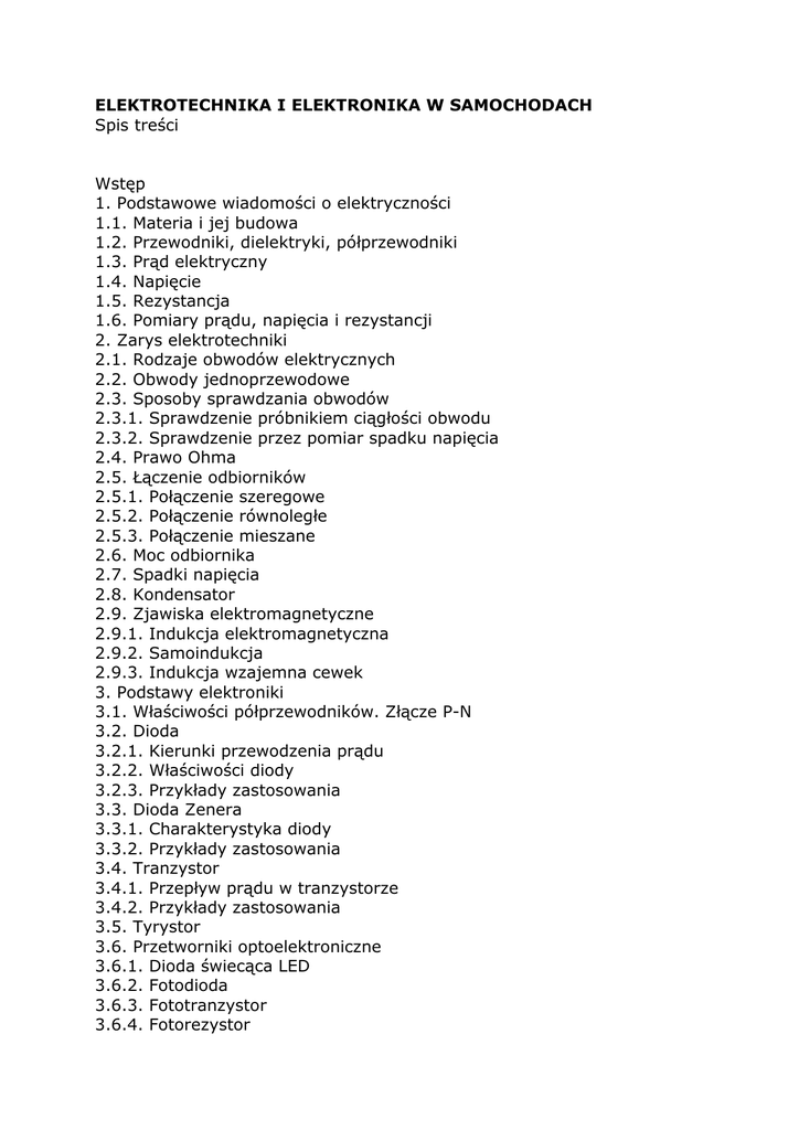 ELEKTROTECHNIKA I ELEKTRONIKA W SAMOCHODACH Spis treści Wstęp 1. Podstawowe wiadomości o elektryczności 1.1. Materia i jej budowa 1.2. Przewodniki, dielektryki, półprzewodniki 1.3. Prąd elektryczny 1.4. Napięcie 1.5. Rezystancja 1.6. Pomiary prądu, napięcia i rezystancji 2. Zarys elektrotechniki 2.1. Rodzaje obwodów elektrycznych 2.2. Obwody jednoprzewodowe 2.3. Sposoby sprawdzania obwodów 2.3.1. Sprawdzenie próbnikiem ciągłości obwodu 2.3.2. Sprawdzenie przez pomiar spadku napięcia 2.4. Prawo Ohma 2.5. Łączenie odbiorników 2.5.1. Połączenie szeregowe 2.5.2. Połączenie równoległe 2.5.3. Połączenie mieszane 2.6. Moc odbiornika 2.7. Spadki napięcia 2.8. Kondensator 2.9. Zjawiska elektromagnetyczne 2.9.1. Indukcja elektromagnetyczna 2.9.2. Samoindukcja 2.9.3. Indukcja wzajemna cewek 3. Podstawy elektroniki 3.1. Właściwości półprzewodników. Złącze P-N 3.2. Dioda 3.2.1. Kierunki przewodzenia prądu 3.2.2. Właściwości diody 3.2.3. Przykłady zastosowania 3.3. Dioda Zenera 3.3.1. Charakterystyka diody 3.3.2. Przykłady zastosowania 3.4. Tranzystor 3.4.1. Przepływ prądu w tranzystorze 3.4.2. Przykłady zastosowania 3.5. Tyrystor 3.6. Przetworniki optoelektroniczne 3.6.1. Dioda świecąca LED 3.6.2. Fotodioda 3.6.3. Fototranzystor 3.6.4. Fotorezystor 4. Podstawy układów cyfrowych 4.1. Układy scalone analogowe 4.2. System dwójkowy 4.3. Układy scalone cyfrowe 4.4. Podstawowe funkcje logiczne 4.5. Samochodowe urządzenia cyfrowe 4.5.1. Zadania urządzenia cyfrowego 4.5.2. Czujniki pomiarowe 4.5.3. Elementy wykonawcze 4.5.4. Przetworniki C/A i A/C 4.6. Mikrokomputer 4.6.1. Pamięć ROM, RAM 4.6.2. Mikroprocesor CPU 4.7. Elektroniczne urządzenia sterujące 4.8. System wymiany danych. Magistrala CAN 5. Schematy obwodów elektrycznych 5.1. Symbole graficzne i oznaczenia 5.2. Posługiwanie się schematami elektrycznymi 6. Źródła energii elektrycznej 6.1. Alternator 6.1.1. Budowa alternatora 6.1.2. Działanie alternatora 6.1.3. Alternator kompaktowy 6.2. Regulatory napięcia 6.2.1. Regulator wibracyjny 6.2.2. Regulator elektroniczny 6.3. Akumulator 6.3.1. Przeznaczenie i budowa akumulatora 6.3.2. Procesy chemiczne w akumulatorze ołowiowym 6.3.3. Siła elektromotoryczna i napięcie akumulatora 6.3.4. Pojemność akumulatora 6.3.5. Samowyładowanie 6.3.6. Sprawdzanie akumulatora 6.3.7. Sposoby ładowania akumulatorów 7. Rozruch silnika spalinowego 7.1. Obwód rozruchowy 7.2. Rozrusznik z zębnikiem śrubowo-przesuwnym 7.3. Rozrusznik z reduktorem 7.4. Rozrusznik z przekładnią planetarną 8. Układy zapłonowe 8.1. Klasyczny akumulatorowy układ zapłonowy 8.1.1. Budowa i działanie układu 8.1.2. Elementy układu zapłonowego 8.2. Układy zapłonowe tranzystorowe 8.2.1. Układ zapłonowy tranzystorowy 8.2.2. Układ zapłonowy tyrystorowy 8.2.3. Bezstykowe sterowanie układów zapłonowych 8.3. Układ zapłonowy elektroniczny 9. Elektroniczne układy wtryskowe 9.1. Zalety elektronicznego wtrysku paliwa 9.2. Wtrysk elektroniczny w silnikach z zapłonem iskrowym 9.3. Układ wtryskowy sterowany ciśnieniem w kanale dolotowym 9.3.1. Obwód zasilania paliwem 9.3.2. Obwód dolotu powietrza 9.3.3. Obwód sterowania 9.4. Układ wtryskowy sterowany ilością zasysanego powietrza 9.4.1. Obwód zasilania paliwem 9.4.2. Obwód dolotu powietrza 9.4.3. Obwód sterowania 9.5. Zintegrowany układ wtryskowo-zapłonowy 9.5.1. Wtrysk paliwa 9.5.2. Zapłon elektroniczny 9.5.3. Sterowanie układem 9.6. Elektroniczny wtrysk bezpośredni w silnikach z zapłonem samoczynnym 9.6.1. Metody wtrysku bezpośredniego 9.6.2. Układ wtryskowy Common Rail 10. Samodiagnoza 10.1. Urządzenia sterujące z samodiagnozą 10.2. Diagnozowanie układu ze sterownikiem 11. Układy bezpieczeństwa i dynamiki jazdy 11.1. Układ przeciwblokujący ABS 11.2. Układ przeciwpoślizgowy ASR 11.3. Układ stabilizacji toru jazdy ESP 11.4. Układy EDS, BAS, EBV, MSR, ACC 12. Układy bezpieczeństwa biernego 12.1. Poduszki powietrzne, kurtyny gazowe 12.2. Elementy składowe poduszek powietrznych 12.3. Napinacze pasów bezpieczeństwa 13. Układy komfortu jazdy 13.1. Klimatyzacja 13.2. Ogrzewanie dodatkowe 13.3. Centralny zamek, sterowanie elektrycznymi podnośnikami szyb i lusterkami zewnętrznymi 13.4. Sterowanie wycieraczkami 13.5. Czujnik deszczu 13.6. Wspomaganie parkowania 13.7. Regulacja fotela z pamięcią 13.8. Ściemniane lusterka wsteczne 13.9. Sygnalizacja niskiego ciśnienia w oponach 13.10. Zdalne sterowanie otwieraniem i zamykaniem samochodu 13.11. Blokada rozruchu (immobiliser) 13.12. Autoalarm 13.13. Sterowanie automatyczną skrzynią biegów 13.14. Tempomat 13.15. Wspomaganie układu kierowniczego 13.16. Nawigacja GPS 14. Oświetlenie 14.1. Zadania oświetlenia 14.2. Oświetlenie zewnętrzne i wewnętrzne 14.3. Reflektory główne 14.4. Oświetlenie przy pomocy lamp wyładowczych (ksenonowych) 14.5. Reflektory przeciwmgłowe 14.6. Kierunkowskazy, światła awaryjne 14.7. Oświetlenie tyłu pojazdu 14.8. Ustawianie świateł 14.9. Dynamiczne doświetlenie zakrętów 14.10. Doświetlanie zakrętów przez reflektory przeciwmgłowe przednie 14.11. Nowoczesne tendencje w rozwoju oświetlenia 15. Zestawy wskaźników i urządzenia kontrolno-pomiarowe 15.1. Szybkościomierz 15.2. Obrotomierz 15.3. Wskaźnik temperatury płynu chłodzącego 15.4. Wskaźnik poziomu paliwa i rezerwy paliwa w zbiorniku 15.5. Wskaźnik kontrolny ciśnienia oleju 15.6. Kontrolka poziomu płynu chłodniczego 15.7. Kontrolka poziomu płynu hamulcowego 15.8. Kontrolka zużycia klocków hamulcowych 15.9. Kontrolka ładowania alternatora 15.10. Przerywacz kierunkowskazów 15.11. Komputer pokładowy 16. Oscyloskop w diagnostyce samochodowej 16.1. Zasada działania oscyloskopu 16.2. Tester z oscyloskopem 16.3. Diagnozowanie. Przebiegi sygnałów 16.3.1. Diagnozowanie układu zapłonowego 16.3.2. Diagnozowanie układu alternatora 16.3.3. Przebieg sygnałów 17. Ochrona środowiska – czystość spalin 17.1. Emisja spalin, skła