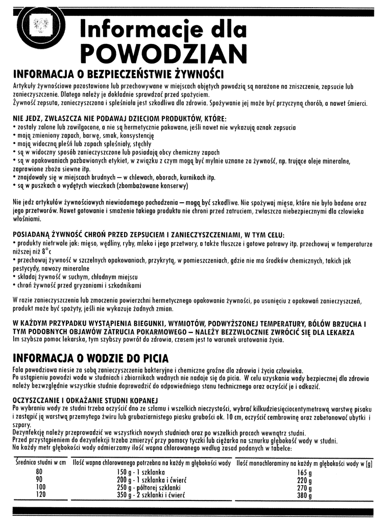 Informacie dla POWODZIAN INFORMACJA O BEZPIECZEŃSTWIE ŻYWNOŚCI Artykuły żywnościowe pozostawione lub przechowywane w miejscach objętych powodziq sq narażone no zniszczenie, zepsucie lub zanieczyszczenie. Dlatego należy je dokładnie sprawdzać przed spożyciem. Żywność zepsuta, zanieczyszczono i spleśniało jest szkodliwo dla zdrowia. Spożywanie jej może być przyczyn q chorób, a nawet śmierci. NIE JEDZ, ZWŁASZCZA NIE PODAWAJ DZIECIOM PRODUKTÓW, KTÓRE: • zostały zalane lub zawilgocone, a nie sq hermetycznie pakowane, jeśli nawet nie wykazujq oznak zepsucia • majq zmieniony zapach, barwę, smok, konsystencję • majq widocznq pleśń lub zapach spleśniały, stęchły • sq w widoczny sposób zanieczyszczone lub posiadajq obcy chemiczny zapach • sq w opakowaniach pozbawionych etykiet, w zwiqzku z czym mogq być mylnie uznane za żywność, np. trujqce oleje mineralne, zaprawione zboża siewne itp. • znajdowały się w miejscach brudnych - w chlewach, oborach, kurnikach itp. • sq w puszkach o wydętych wieczkach (zbombażowane konserwy) Nie jedz artykułów żywnościowych niewiadomego pochodzenia - mogq być szkodliwe. Nie spożywaj mięso, które nie było badane oraz jego przetworów. Nawet gotowanie i smażenie takiego produktu nie chroni przed zatruciem, zwłaszcza niebezpiecznymi dla człowieka włośniami. POSIADANĄ ŻYWNOŚĆ CHROŃ PRZED ZEPSUCIEM I ZANIECZYSZCZENIAMI, W TYM CELU: • produkty nietrwałe jak: mięso, wędliny, ryby, mleko i jego przetwory, o także tłuszcze i gotowe potrawy itp. przechowuj w temperaturze niższej niż 80 c • przechowuj żywność w szczelnych opakowaniach, przykrytll.t w pomieszczeniach, gdzie nie mo środków chemicznych, takich jak pestycydy, nawozy mineralne • składaj żywność w suchym, chłodnym miejscu • chroń żywność przed gryzoniami i szkodnikami W razie zanieczyszczenia lub zmoczenia powierzchni hermetycznego produkt może być spożyty, jeśli nie wykazuje żadnych zmian. opakowania żywności, po usunięciu z opakowań zanieczyszczeń, W KAŻDYM PRZYPADKU WYSTĄPIENIA BIEGUNKI, WYMIOTÓW, PODWYŻSZONEJ TEMPERATURY, BÓLÓW BRZUCHA I TYM PODOBNYCH OBJAWÓW ZATRUCIA POKARMOWEGO - NALEŻY BEZZWŁOCZNIE ZWRÓCIĆ SIĘ DLA LEKARZA Im szybsza pomoc lekarsko, tym szybszy powrót do zdrowia, czasem jest to warunek uratowania życia. INFORMACJA O WODZIE DO PICIA Folo powodziowo niesie za sobq zanieczyszczenia bakteryjne i chemiczne groźne dla zdrowia i życia człowieka. Po ustqpieniu powodzi wodo w studniach i zbiornikach wodnych nie nadaje się do picia. W celu uzyskania wody bezpiecznej należy bezwzględnie wszystkie studnie doprowadzić do odpowiedniego stanu technicznego oraz oczyścić je i odkazić. dla zdrowia OCZYSZCZANIE I ODKAŻANIE STUDNI KOPANEJ Po wybraniu wody ze studni trzeba oczyścić dno ze szlamu i wszelkich nieczystości, wybrać kilkudziesięciocentymetrowq warstwę pisaku i zastqpić jq warstwq przemytego żwiru lub gruboziarnistego piasku grubości ok. 10 cm, oczyścić cembrowinę oraz zabetonować ubytki i szpary. Dezynfekcję należy przeprowadzić we wszystkich nowych studniach oraz po wszelkich procach wewnqtrz studni. Przed przystqpieniem do dezynfekcji trzeba zmierzyć przy pomocy tyczki lub ciężarka na sznurku głębokość wody w studni. Na każdy metr głębokości wody odmierzamy ilość wapno chlorowanego według zasad podanych w tabelce: Średnico studni w cm Ilość wapno chlorowanego potrzebno no każdy m głębokości wody Ilość monochloraminy na każdy m głębokości wody w [g] 80 150 g - I szklanka 165 g 90 220 g 200 g-l szklanka i ćwierć 100 250 g - półtorej szklanki 270 g 120 350 g - 2 szklanki i ćwierć 380 g ...... ,e '. • i W przypadku stosowania roztworu podchlorynu sodu należy szklankę takiej samej objętości jak dla wapna chlorowanego lub dawki wymienionej w tabelce w gramach dwukrotnie zwiększyć. Aby prawidłowo przeprowadzić dezynfekcję wody należy: • do wiadra z wodą dodać 2 płaskie łyżeczki od herbaty wapna chlorowanego i płynem tym wyszorować cembrowinę • po ponownym napełnieniu studni wodq, odmierzoną według tabeli ilość wapna chlorowanego dokładnie rozetrzeć w wiadrze z niewielką ilością wody (na papkę podobną do śmietany), dopełnić wiadro wodq, rozmieszać, po czym całą zawartość wlać do studni • wodę w studni zamieszać tyczką lub przez nabieranie wiadrem czerpanym i wlewanie z powrotem • po 24 godzinach wybieroć wodę aż do zaniku zapachu chloru UWAGA: Środki odkażające należy przechowywać w suchym i ciemnym pomieszczeniu w naczyniu drewnianymi lub szklonym. ODKAŻANIE STUDZIEŃ WIERCONYCH I ABISYŃSKICH W przypadku studni wierconej wymieszanie roztworu odkażającego nastręcza duże trudności. Dlatego w wyjątkowych wypadkach odkaża się je wprowadzając roztwór za pomocą specjalnej pompy. Zazwyczaj w przypadku zanieczyszczenia studni dokładnie się ją przepłukuje przez długotrwałe pompowanie. ODKAŻANIE WEWN~TRZNEJ CZ~ŚCI POMPY ABiSyŃSKIEJ Przeprowadza się w następuiący sposób: 4 gromy wapno chlorowanego (1 czubato łyżeczka) albo 7 mi podchlorynu sodu ( l 1/2 łyżeczki) rozpuścić w dwóch kubkach wody. Zdiąć kolumienkę studni, nalać do rury przygotowany roztwór, nałożyć kolumienkę, pompować aż do ukazania się wody w wylocie pompy, pozostawić no 24 godziny, następnie pompować aż do zaniku zapachu chloru w wodzie. Po wykonaniu czyszczenia i odkażania studni, wodo z niej powinno być zbadano przez najbliższą stację sanitarno - epidemiologicznq, która wyda orzeczenie, czy wodo może być używano do picia i potrzeb gospodarnych. ODKAŻANIE WODY Każdą niepewną wodę przeznaczoną do picia należy odkażać. Dzięki zniszczeniu bakterii, o w szczególności zarazków chorób zakaźnych przewodu pokarmowego, staje się ona bezpieczno dla zdrowia. Odkażanie wody możno przeprowadzić różnymi środkami i sposobami: • najprostszym i
