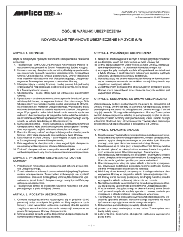 OGÓLNE WARUNKI UBEZPIECZENIA INDYWIDUALNE TERMINOWE UBEZPIECZENIE NA ŻYCIE (UR) ARTYKUŁ 4. WYGAŚNIĘCIE UBEZPIECZENIA U¿yte w niniejszych ogólnych warunkach ubezpieczenia okreœlenia oznaczaj¹: 1. Towarzystwo – AMPLICO LIFE Pierwsze Amerykañsko-Polskie Towarzystwo Ubezpieczeñ na ¯ycie i Reasekuracji Spó³ka Akcyjna, 2. Umowa – umowê ubezpieczenia, na któr¹ sk³adaj¹ siê postanowienia niniejszych ogólnych warunków ubezpieczenia, Szczegó³owa Umowa Ubezpieczenia, umowa podstawowa, umowy dodatkowe oraz wszelkie oœwiadczenia woli Ubezpieczaj¹cego, Ubezpieczonego oraz Towarzystwa zwi¹zane z zawarciem Umowy, 3. Ubezpieczaj¹cy – osobê fizyczn¹, osobê prawn¹ lub jednostkê organizacyjn¹ nieposiadaj¹c¹ osobowoœci prawnej, która zawar³a z Towarzystwem Umowê, 4. Ubezpieczony – osobê, której ¿ycie lub zdrowie jest przedmiotem Umowy, 5. Uposa¿ony – osobê uprawnion¹ do otrzymania œwiadczeñ, przewidzianych Umow¹, na wypadek œmierci Ubezpieczonego. O ile Ubezpieczony nie wska¿e inaczej, osob¹ uprawnion¹ do otrzymania œwiadczeñ jest ma³¿onek Ubezpieczonego. W przypadku braku ma³¿onka œwiadczenie to zostanie wyp³acone dzieciom Ubezpieczonego. W przypadku braku dzieci œwiadczenie zostanie wyp³acone rodzicom Ubezpieczonego. W przypadku braku rodziców œwiadczenie to zostanie wyp³acone Spadkobiercom Ubezpieczonego w czêœciach, w jakich dziedzicz¹ po Ubezpieczonym. 6. Suma ubezpieczenia – kwotê wskazan¹ w Szczegó³owej Umowie Ubezpieczenia, która okreœla maksymalne zobowi¹zanie Towarzystwa w przypadku zajœcia zdarzenia ubezpieczeniowego, 7. Rocznica Umowy – dzieñ ka¿dego kolejnego roku obowi¹zywania Umowy, który dat¹ odpowiada dniu wejœcia w ¿ycie Umowy, 8. Data wejœcia w ¿ycie Umowy – datê wejœcia w ¿ycie oznaczon¹ w Szczegó³owej Umowie Ubezpieczenia, 9. Data wygaœniêcia ubezpieczenia – datê wygaœniêcia ubezpieczenia opisan¹ w Szczegó³owej Umowie Ubezpieczenia, 10. Zdolnoœæ ubezpieczeniowa – wszystkie warunki, jakie musi spe³niæ osoba ubezpieczana, aby dosz³o do zawarcia umowy ubezpieczenia. ARTYKUŁ 2. PRZEDMIOT UBEZPIECZENIA I ZAKRES OCHRONY 1. Przedmiotem niniejszego ubezpieczenia jest ochrona ¿ycia i zdrowia Ubezpieczonego. 2. Z zastrze¿eniem odmiennych postanowieñ niniejszych ogólnych warunków ubezpieczenia, Towarzystwo zobowi¹zuje siê wyp³aciæ œwiadczenie okreœlone Szczegó³ow¹ Umow¹ Ubezpieczenia Uposa¿onemu, je¿eli œmieræ Ubezpieczonego nast¹pi przed Dat¹ wygaœniêcia ubezpieczenia. 3. Towarzystwo potr¹ci ze œwiadczeñ wszelkie nale¿noœci od Ubezpieczaj¹cego z tytu³u niniejszej Umowy. ARTYKUŁ 3. POCZĄTEK UBEZPIECZENIA 1. Ochrona ubezpieczeniowa rozpoczyna siê o godzinie 00.00 pierwszej doby po up³ywie 24 godzin od Daty wejœcia w ¿ycie Umowy i pod warunkiem op³acenia nale¿nej sk³adki zgodnie z ogólnymi warunkami ubezpieczenia niniejszej Umowy oraz zapisami Szczegó³owej Umowy Ubezpieczenia. 2. Umowa zostaje zawarta w dniu dorêczenia Ubezpieczaj¹cemu dokumentu potwierdzaj¹cego jej zawarcie. 1. Niniejsza Umowa wygasa w ka¿dym z nastêpuj¹cych przypadków: a) po dziesiêciu latach od Daty wejœcia w ¿ycie Umowy lub b) w dniu odpowiadaj¹cym Dacie wejœcia w ¿ycie Umowy, nastêpuj¹cym bezpoœrednio po 75 urodzinach Ubezpieczonego, lub c) w przypadku, gdy nast¹pi³a wyp³ata któregokolwiek ze œwiadczeñ z tytu³u Umowy, z zastrze¿eniem odmiennych zapisów ogólnych warunków ubezpieczenia umowy dodatkowej. 2. Ubezpieczaj¹cy ma prawo wypowiedzieæ Umowê w formie pisemnej w dowolnym momencie ze skutkiem na najbli¿szy termin wymagalnoœci nastêpnej sk³adki. 3. Z zastrze¿eniem bezwzglêdnie obowi¹zuj¹cych przepisów prawa Umowa mo¿e przewidywaæ inne zdarzenia, których skutkiem jest wygaœniêcie Umowy. ARTYKUŁ 5. ODSTĄPIENIE OD UMOWY UBEZPIECZENIA Ubezpieczaj¹cy bêd¹cy osob¹ fizyczn¹ ma prawo do odst¹pienia od Umowy w ci¹gu 30 dni od daty jej zawarcia. Ubezpieczaj¹cy bêd¹cy przedsiêbiorc¹ ma prawo do odst¹pienia od Umowy w ci¹gu 7 dni od daty jej zawarcia. W przypadku odst¹pienia od Umowy Towarzystwo zwróci Ubezpieczaj¹cemu sk³adkê po potr¹ceniu jej czêœci za okres, w którym udziela³o ochrony ubezpieczeniowej. Zwrot sk³adki nast¹pi w terminie 30 dni od daty otrzymania przez Towarzystwo pisemnego oœwiadczenia Ubezpieczaj¹cego o odst¹pieniu od Umowy. ARTYKUŁ 6. OPŁACANIE SKŁADEK 1. Sk³adkê ustala Towarzystwo z uwzglêdnieniem rodzaju oraz wysokoœci udzielanej ochrony ubezpieczeniowej, okresu ubezpieczenia, poziomu ryzyka ubezpieczeniowego, w tym wieku i p³ci Ubezpieczonego, oraz op³at i kosztów zawarcia i obs³ugi Umowy. 2. Sk³adki p³atne s¹ za rok z góry, w kolejne Rocznice Umowy. Mo¿na je równie¿ op³acaæ za okresy krótsze w równych ratach uzgodnionych wczeœniej przez Ubezpieczaj¹cego i Towarzystwo. 3. Ubezpieczaj¹cy zobowi¹zany jest do zap³aty Towarzystwu sk³adek z tytu³u ubezpieczenia w wysokoœci okreœlonej Szczegó³ow¹ Umow¹ Ubezpieczenia zgodnie z poni¿szymi postanowieniami. 4. Ubezpieczaj¹cemu, który nie op³aci sk³adki w terminie wymagalnoœci, przys³uguje dodatkowa prolongata terminu p³atnoœci, liczona od dnia wymagalnoœci sk³adki (okres karencji): a) 60-dniowy okres karencji pocz¹wszy od trzeciego miesi¹ca obowi¹zywania Umowy w przypadku sk³adki op³acanej miesiêcznie, b) 30-dniowy okres karencji pocz¹wszy od drugiej nale¿nej sk³adki w przypadku sk³adki op³acanej pó³rocznie lub rocznie. 5. Niezap³acenie sk³adki w okresie karencji powoduje wygaœniêcie Umowy bez potrzeby uprzedniego powiadomienia Ubezpieczaj¹cego. 6. W razie œmierci Ubezpieczonego w okresie karencji suma œwiadczeñ przewidzianych do wyp³aty zgodnie z Umow¹ zostanie pomniejszona o sk³adki nale¿ne i niezap³acone w terminie. 7. Towarzystwo nie ma obowi¹zku wysy³ania Ubezpieczaj¹cemu wezwañ do op³acania sk³adek. Wys³anie takiego wezwania nie mo¿e byæ uznane za przy