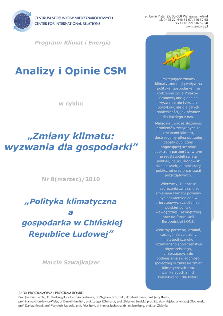 Program: Klimat i Energia Analizy i Opinie CSM w cyklu: „Zmiany klimatu: wyzwania dla gospodarki” Nr 8(marzec)/2010 „Polityka klimatyczna a gospodarka w Chińskiej Republice Ludowej” Marcin Szwajkajzer Postępujące zmiany klimatyczne mają wpływ na politykę, gospodarkę i na codzienne życie Polaków. Stanowią one globalne wyzwanie nie tylko dla polityków, ale dla całych społeczności, jak również dla każdego z nas. Mając na uwadze złożoność problemów związanych ze zmianami klimatu, dostrzegamy pilną potrzebę debaty publicznej angażującej szerokie spektrum partnerów, w tym przedstawicieli świata polityki, nauki, środowisk biznesowych, administracji publicznej oraz organizacji pozarządowych. Wierzymy, że szanse i zagrożenia związane ze zmianami klimatu powinny być odzwierciedlone w priorytetowych założeniach polskiej polityki wewnętrznej i zewnętrznej oraz na forum Unii Europejskiej i ONZ. Widzimy potrzebę działań, szczególnie ze strony instytucji szeroko rozumianego społeczeństwa obywatelskiego, zmierzających do podniesienia świadomości społecznej w zakresie zmian klimatycznych oraz wynikających z nich konsekwencji dla Polski. Polityka klimatyczna a gospodarka w Chińskiej Republice Ludowej Od końca lat 70’ głównym celem rządu Chińskiej Republiki Ludowej (ChRL) jest rozwój gospodarczy. Przez lata, aż do dziś utrzymywano wysoki 10% wzrost PKB. Przy takim tempie rozwoju krajowe źródła szybko stały się niewystarczające i Chiny zostały zmuszone do importu surowców energetycznych, w tym ropy naftowej. Tym samym, Chiny wkroczyły na nową dla siebie drogę uzależnienia rozwoju gospodarczego od czynników zewnętrznych. Największą ofiarę za rozwój Chin poniosło środowisko naturalne. W sposób niekontrolowany przez lata zanieczyszczano rzeki, nieodpowiednio gospodarowano odpadami, dbając jedynie o dodatni wzrost gospodarczy. W samym roku 2005, chińska gospodarka wyemitowała do atmosfery 7,5 mld ton gazów cieplarnianych, wyprzedzając tym samym Stany Zjednoczone, uchodzące za największego emitenta tych gazów1. Skutki zaniechań z przeszłości stają się obecnie coraz poważniejszym problemem Państwa Środka. Logika wydarzeń zdaje się być następująca: zmiany klimatu wpływają na rozwój Chin, a rozwój Chin wpływa na zmiany klimatu. Rządzący nie zrezygnują z dalszego rozwoju, zatem nie pozostaje nic innego jak zminimalizowanie negatywnego wpływu, jaki wywiera on na środowisko, w tym na klimat. Z powodu położenia geograficznego Chiny są bardzo podatne na negatywne konsekwencje zmian klimatu. Większość społeczeństwa żyje na terenach nizinnych oraz na terenach zagrożonych zalaniem w przypadku podniesienia się poziomu wody. Wszelkie anomalie pogodowe mogą wywołać kataklizmy na dużą skalę i zagrozić załamaniem rozwoju gospodarki. Instytucje odpowiedzialne za politykę klimatyczną Przed rokiem 1998, instytucją odpowiedzialną za prace nad polityką klimatyczną była Chińska Administracja Meteorologiczna2 (CAM). Wspólnie z Chińską Akademią Nauk3 przygotowywała raporty o konsekwencjach zmian klimatycznych. Naukowcy tych instytucji uczestniczyli w pierwszych Spotkaniach Stron Konwencji Klimatycznej UNFCCC4 (Conference of the Parties - COP). Jednak, w obliczu coraz bardziej odczuwalnych skutków 1 CRS Report of Congress, China’s Greenhouse Gas Emissions and Mitigation Policies, September 10, 2008. 2 ang. China Meteorological Administration. 3 ang. Chinese Academy of Science. 4 ang. United Nations Framework Convention on Climate Change. 1 zmian klimatu i intensyfikacji anomalii pogodowych oraz wpływu tych czynników na chińską gospodarkę, kompetencje w działań i obowiązków w tych obszarach zostały podniesione w hierarchii administracji państwowej. Obecnie najważniejszym urzędem zajmującym się polityką klimatyczną jest Narodowa Komisja Rozwoju i Reform5 (NKRR). Jest ona jedną z najpotężniejszych instytucji państwowych w Chinach, odpowiadającą za administrację oraz planowanie chińskiej gospodarki bezpośrednio przed Radą Państwa6. W ramach NKRR został wydzielony Departament ds. Zmian Klimatu do którego zadań należy analiza wpływu zmian klimatu na rozwój społeczny i gospodarczy Chin oraz tworzenie ogólnonarodowych strategii7. W ramach NKRR dochodzi do intensywnej współpracy pomiędzy departamentem odpowiedzialnym za klimat a Biurem Energii. Obie komórki rozwijane są prawie równolegle. W roku 2005 utworzono Główne Narodowe Biuro ds. Energii, będące częścią Rady Państwa. Dwa lata później założony został Centralny Narodowy Komitet ds. Zmian Klimatu8 (CNKZK). Przewodniczącym Komitetu jest premier Wen Jiabao, który wraz z pozostałymi 20 ministerstwami oraz urzędami państwowymi9 koordynuje jego prace. Celem prac CNKZK jest międzyresortowa koordynacja strategii i polityki klimatycznej. Na poziomie instytucjonalnym chińska polityka klimatyczna jest tworzona równolegle z polityka energetyczną. Obie stały się jednymi z najważniejszych polityk wewnętrznych ChRL. Skutki globalnego ocieplenia Globalne ocieplenie było długo ignorowane przez chińskich polityków. Jednakże w ciągu ostatnich lat, przeprowadzone badania10 5 ang. National Development and Reform Commission. NKRR odpowiada m.in. za realizacje planów pięcioletnich. 7 http://www.ccchina.gov.cn/en/ - strona internetowa poświęcona chińskiej polityce przeciwdziałania zmianom klimatycznym. 8 Ang. National Leading Committee on Climate Change. 9 Pełna lista.: Rada Państwa, Ministerstwo Spraw Zagranicznych, Narodowa Komisja Rozwoju i Reform (National Development and Reform Commission), Ministerstwo Nauki i Technologii, Ministerstwo Przemysłu i Technologii Informacyjnej, Ministerstwo Finansów, Ministerstwo Gospodarki Ziemią i Zasobami, Ministerstwo Ochrony Środowiska, Ministerstwo Budownictwa i Rozwoju Miast i Obszarów Wiejskich, Ministerstwo Transportu, Ministerstwo