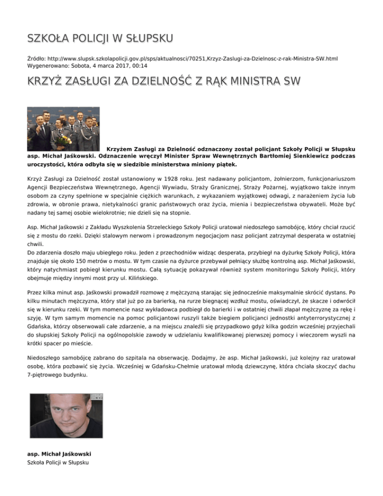 SZKOŁA POLICJI W SŁUPSKU Źródło: http://www.slupsk.szkolapolicji.gov.pl/sps/aktualnosci/70251,Krzyz-Zaslugi-za-Dzielnosc-z-rak-Ministra-SW.html Wygenerowano: Sobota, 4 marca 2017, 00:14 KRZYŻ ZASŁUGI ZA DZIELNOŚĆ Z RĄK MINISTRA SW Krzyżem Zasługi za Dzielność odznaczony został policjant Szkoły Policji w Słupsku asp. Michał Jaśkowski. Odznaczenie wręczył Minister Spraw Wewnętrznych Bartłomiej Sienkiewicz podczas uroczystości, która odbyła się w siedzibie ministerstwa miniony piątek. Krzyż Zasługi za Dzielność został ustanowiony w 1928 roku. Jest nadawany policjantom, żołnierzom, funkcjonariuszom Agencji Bezpieczeństwa Wewnętrznego, Agencji Wywiadu, Straży Granicznej, Straży Pożarnej, wyjątkowo także innym osobom za czyny spełnione w specjalnie ciężkich warunkach, z wykazaniem wyjątkowej odwagi, z narażeniem życia lub zdrowia, w obronie prawa, nietykalności granic państwowych oraz życia, mienia i bezpieczeństwa obywateli. Może być nadany tej samej osobie wielokrotnie; nie dzieli się na stopnie. Asp. Michał Jaśkowski z Zakładu Wyszkolenia Strzeleckiego Szkoły Policji uratował niedoszłego samobójcę, który chciał rzucić się z mostu do rzeki. Dzięki stalowym nerwom i prowadzonym negocjacjom nasz policjant zatrzymał desperata w ostatniej chwili. Do zdarzenia doszło maju ubiegłego roku. Jeden z przechodniów widząc desperata, przybiegł na dyżurkę Szkoły Policji, która znajduje się około 150 metrów o mostu. W tym czasie na dyżurce przebywał pełniący służbę kontrolną asp. Michał Jaśkowski, który natychmiast pobiegł kierunku mostu. Całą sytuację pokazywał również system monitoringu Szkoły Policji, który obejmuje między innymi most przy ul. Kilińskiego. Przez kilka minut asp. Jaśkowski prowadził rozmowę z mężczyzną starając się jednocześnie maksymalnie skrócić dystans. Po kilku minutach mężczyzna, który stał już po za barierką, na rurze biegnącej wzdłuż mostu, oświadczył, że skacze i odwrócił się w kierunku rzeki. W tym momencie nasz wykładowca podbiegł do barierki i w ostatniej chwili złapał mężczyznę za rękę i szyję. W tym samym momencie na pomoc policjantowi ruszyli także biegiem policjanci jednostki antyterrorystycznej z Gdańska, którzy obserwowali całe zdarzenie, a na miejscu znaleźli się przypadkowo gdyż kilka godzin wcześniej przyjechali do słupskiej Szkoły Policji na ogólnopolskie zawody w udzielaniu kwalifikowanej pierwszej pomocy i wieczorem wyszli na krótki spacer po mieście. Niedoszłego samobójcę zabrano do szpitala na obserwację. Dodajmy, że asp. Michał Jaśkowski, już kolejny raz uratował osobę, która pozbawić się życia. Wcześniej w Gdańsku-Chełmie uratował młodą dziewczynę, która chciała skoczyć dachu 7-piętrowego budynku. asp. Michał Jaśkowski Szkoła Policji w Słupsku (pobierz) Teleexpress fragmenty wydania z 26 maja 2013 roku Panorama TVP3 Gdańsk fragmenty wydania z 24 maja 2013 roku (3.2.2014) Ocena: 0/5 (0) Tweetnij