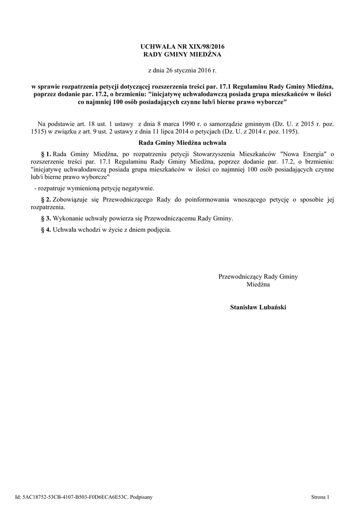 UCHWAŁA NR XIX/98/2016 RADY GMINY MIEDŹNA z dnia 26 stycznia 2016 r. w sprawie rozpatrzenia petycji dotyczącej rozszerzenia treści par. 17.1 Regulaminu Rady Gminy Miedźna, poprzez dodanie par. 17.2, o brzmieniu: "inicjatywę uchwałodawczą posiada grupa mieszkańców w ilości co najmniej 100 osób posiadających czynne lub/i bierne prawo wyborcze" Na podstawie art. 18 ust. 1 ustawy z dnia 8 marca 1990 r. o samorządzie gminnym (Dz. U. z 2015 r. poz. 1515) w związku z art. 9 ust. 2 ustawy z dnia 11 lipca 2014 o petycjach (Dz. U. z 2014 r. poz. 1195). Rada Gminy Miedźna uchwala § 1. Rada Gminy Miedźna, po rozpatrzeniu petycji Stowarzyszenia Mieszkańców "Nowa Energia" o rozszerzenie treści par. 17.1 Regulaminu Rady Gminy Miedźna, poprzez dodanie par. 17.2, o brzmieniu: "inicjatywę uchwałodawczą posiada grupa mieszkańców w ilości co najmniej 100 osób posiadających czynne lub/i bierne prawo wyborcze" - rozpatruje wymienioną petycję negatywnie. § 2. Zobowiązuje się Przewodniczącego Rady do poinformowania wnoszącego petycję o sposobie jej rozpatrzenia. § 3. Wykonanie uchwały powierza się Przewodniczącemu Rady Gminy. § 4. Uchwała wchodzi w życie z dniem podjęcia. Przewodniczący Rady Gminy Miedźna Stanisław Lubański Id: 5AC18752-53CB-4107-B503-F0D6ECA6E53C. Podpisany Strona 1 Załącznik do Uchwały Nr XIX/98/2016 Rady Gminy Miedźna z dnia 26 stycznia 2016 r. Uzasadnienie W dniu 17 listopada 2015 r. do Przewodniczącego Rady Gminy Miedźna złożona została petycja przez Stowarzyszenie Mieszkańców „Nowa Energia” o rozszerzenie treści paragrafu 17 ust. 1 Regulaminu Rady Gminy Miedźna, stanowiącego załącznik nr 2 do uchwały Nr XLVIII/332/2014 Rady Gminy Miedźna z dnia 24 czerwca 2014 r. w sprawie uchwalenia Statutu Gminy Miedźna, który brzmi: „Inicjatywę uchwałodawczą posiada każdy z radnych oraz Wójt, chyba że przepisy prawa stanowią inaczej”, poprzez dodanie paragrafu 17 ust. 2 o brzmieniu: „Inicjatywę uchwałodawczą posiada grupa mieszkańców w ilości co najmniej 100 osób posiadających czynne lub/i bierne prawo wyborcze”. W dniu 26 listopada 2015 r. Przewodniczący Rady zapoznał z powyższą petycją wszystkich radnych na wspólnym posiedzeniu Komisji. Zgodnie z wnioskiem Rady przekazano petycję Komisji Samorządu, Handlu, Praworządności i Bezpieczeństwa Publicznemu, celem dokonania analizy. W dniu 21 grudnia 2015 r. Komisja Samorządu, Handlu, Praworządności i Bezpieczeństwa Publicznego działająca w imieniu Rady Gminy Miedźna dokonała szczegółowej analizy petycji stwierdzając, że złożoną petycję należy rozpatrzyć negatywnie ustalając co następuje: Mając na uwadze art. 11 ustawy o samorządzie gminnym, który stanowi, że „Mieszkańcy gminy podejmują rozstrzygnięcia w głosowaniu powszechnym (poprzez wybory i referendum) lub za pośrednictwem organów gminy” oraz zgodnie z delegacją art. 23 § 1 ww. ustawy, który stanowi, że „Radny obowiązany jest kierować się dobrem wspólnoty samorządowej gminy. Radny utrzymuje stałą więź z mieszkańcami oraz ich organizacjami, a w szczególności przyjmuje zgłaszane przez mieszkańców gminy postulaty i przedstawia je organom gminy do rozpatrzenia, nie jest jednak związany instrukcjami wyborców”., oraz zgodnie z treścią § 17 ust. 1 Regulaminu Rady Gminy Miedźna stwierdzić należy, że katalog podmiotów posiadających inicjatywę uchwałodawczą w istniejącym systemie prawnym jest wystarczający. Rada Gminy wskazuje również, że za takim rozstrzygnięciem przemawia także funkcjonujący ustrój wewnętrzny Gminy Miedźna, który pozwala mieszkańcom wpływać na wszelkie decyzje poprzez organy jednostek pomocniczych gminy tj. zebranie wiejskie czy sołtysów. W związku z powyższym złożona przez Stowarzyszenie Mieszkańców „Nowa Energia” petycja i zawarty w niej wniosek nie zasługuje na uwzględnienie. W tym stanie rzeczy Rada Gminy Miedźna powyższą petycję rozpatruje negatywnie. Id: 5AC18752-53CB-4107-B503-F0D6ECA6E53C. Podpisany Strona 1