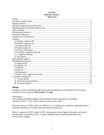 UT 90A Miernik cyfrowy. Spis treści Wstęp.......................................................................................................................................... 1 Zawartość opakowania ............................................................................................................... 2 Bezpieczeństwo .......................................................................................................................... 2 Zasady bezpiecznego uŜytkowania ............................................................................................ 2 Międzynarodowe symbole elektryczne ...................................................................................... 3 Opis miernika ............................................................................................................................. 3 Przełącznik obrotowy................................................................................................................. 3 Przyciski funkcyjne .................................................................................................................... 4 Symbole na wyświetlaczu .......................................................................................................... 4 Pomiary ...................................................................................................................................... 4 A Pomiary napięcia DC.......................................................................................................... 4 B Pomiary napięcia AC.......................................................................................................... 5 C Pomiar prądu DC ................................................................................................................ 5 D Pomiar prądu AC................................................................................................................ 6 E Pomiary rezystancji............................................................................................................. 6 F Test diód i ciągłości obwodu .............................................................................................. 7 F-1 Ciągłość obwodu ............................................................................................................. 7 G Test baterii .......................................................................................................................... 7 Specyfikacja ogólna ................................................................................................................... 8 Dokładność pomiarów................................................................................................................ 8 A Napięcie DC ....................................................................................................................... 8 B Napięcie AC ....................................................................................................................... 8 C Prąd DC .............................................................................................................................. 9 D Prąd AC .............................................................................................................................. 9 E Rezystancja ......................................................................................................................... 9 F Diody i Test ciągłości obwodu............................................................................................ 9 Czynności obsługowe............................................................................................................... 10 A. Uwagi ogólne. ................................................................................................................. 10 B. Wymiana bezpieczników................................................................................................. 10 B. Wymiana baterii. ............................................................................................................. 10 Wstęp Instrukcja zawiera informacje jak bezpiecznie posługiwać się miernikiem. Przeczytaj ją uwaŜnie, zwróć uwagę na OstrzeŜenia i Uwagi. OstrzeŜenie Aby uniknąć poraŜenia prądem lub uszkodzenia ciała zapoznaj się z działami „Bezpieczeństwo ” oraz „Zasady bezpiecznego uŜytkowania”. Miernik cyfrowy UT90A zlicza do 1999 jest 3 1/2 znakowym, solidnym, ergonomicznym i trwałym miernikiem. Posiada ochronę przed przeciąŜeniem.. Mierzy: napięcie AC/DC, prąd AC/DC, rezystancję, diody, ciągłość obwodu, test baterii, posiada duŜy wyświetlacz LCD, w pełni zabezpieczony przed przeciąŜeniem oraz nowoczesny wygląd. 1 Zawartość opakowania Sprawdź zawartość opakowania, jeŜeli jest niekompletnie skontaktuj się ze sprzedawcą. Zawartość: - instrukcja - przewody testera - pokrowiec - bateria 9V Bezpieczeństwo Miernik jest zgodny ze standardem IEC61010: stopień zanieczyszczenia 2, kategoria przepięcia (CAT. II 1000V, CAT. III 600V) posiada podwójne izolowanie. CAT. II: urządzenie przenośne, z wartością przepięcia mniejszą niŜ CAT. III. CAT. III: z wartością przepięcia mniejszą niŜ CAT. IV. Aby uniknąć uszkodzenia miernika uŜywaj go zgodnie z zaleceniami w instrukcji. OstrzeŜenia w instrukcji odnoszą się do czynności które mogą stanowić zagroŜenie dla uŜytkownika lub powodować uszkodzenie miernika lub testowanego urządzenia. c odnoszą się do informacji na które uŜytkownik powinien zwrócić szczególną uwagę. Zasady bezpiecznego uŜytkowania Aby uniknąć poraŜenia prądem elektrycznym lub innych uszkodzeń ciała, naleŜy uwaŜnie przeczytać i przestrzegać poniŜszych zasad: • • • • • • • • • • • • • • Przed uŜyciem sprawdź obudową miernika czy, nie ma jakichś uszkodzeń mechanicznych i czy jest zamknięta i skręcona wkrętami. Sprawdź przewody pomiarow