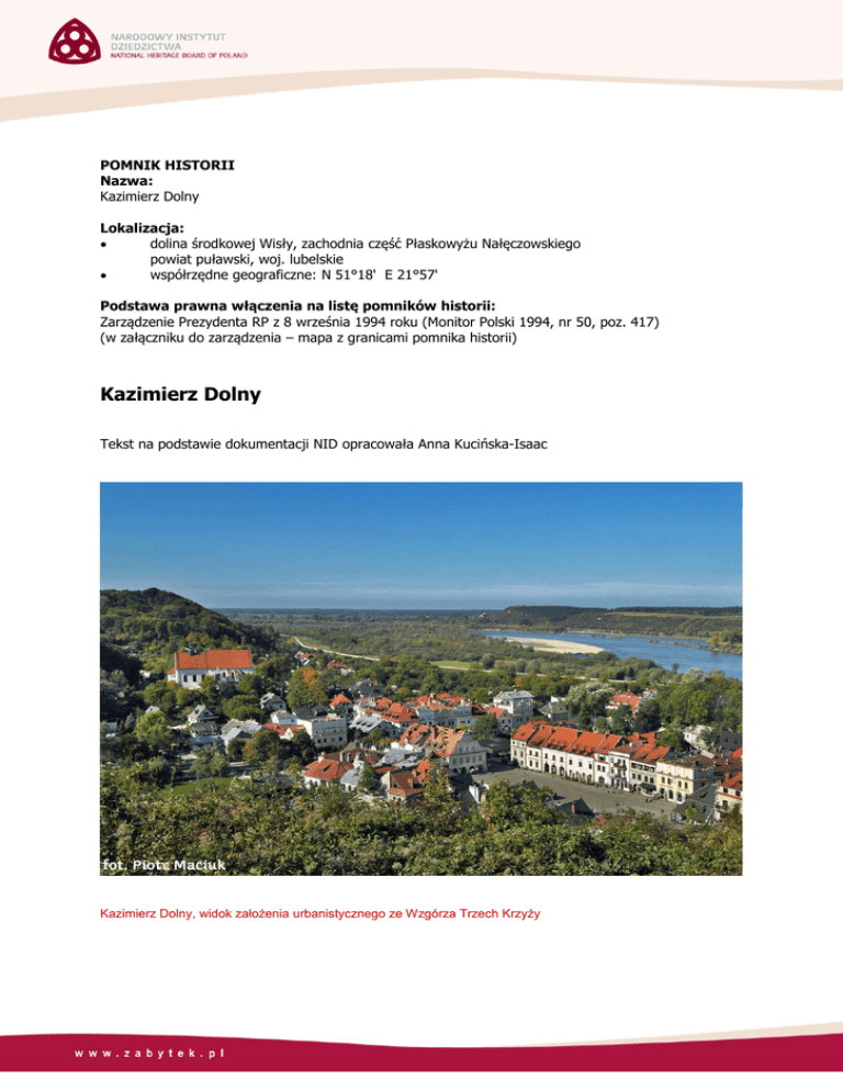 POMNIK HISTORII Nazwa: Kazimierz Dolny Lokalizacja: dolina środkowej Wisły, zachodnia część Płaskowyżu Nałęczowskiego powiat puławski, woj. lubelskie współrzędne geograficzne: N 51°18' E 21°57' Podstawa prawna włączenia na listę pomników historii: Zarządzenie Prezydenta RP z 8 września 1994 roku (Monitor Polski 1994, nr 50, poz. 417) (w załączniku do zarządzenia – mapa z granicami pomnika historii) Kazimierz Dolny Tekst na podstawie dokumentacji NID opracowała Anna Kucińska-Isaac Kazimierz Dolny, widok założenia urbanistycznego ze Wzgórza Trzech Krzyży Wartość obiektu: Kazimierz Dolny to niewielka miejscowość położona w dolinie środkowej Wisły o wyjątkowych walorach architektoniczno-krajobrazowych. Naturalne ukształtowanie terenu, ze wzgórzami, dolinami i wąwozami, wpłynęło na jej specyficzny układ urbanistyczny, z niską rozluźnioną zabudową w pasie sadów nadwiślańskich i wyróżniającymi się bryłami zabytkowych budowli nanizanych na główną oś kompozycyjną. Zachowana na nadbrzeżu grupa murowanych spichlerzy jest charakterystycznym elementem panoramy miasta, świadectwem ważnej roli, jaką odgrywało w przeszłości. Kazimierz, nazywany w czasach nowożytnych „Małym Gdańskiem”, pełnił bowiem funkcję portu śródlądowego do przeładunku zboża spławianego Wisłą. Śladem jego ówczesnej zamożności pozostaje do dziś unikatowa, bogato zdobiona architektura, stanowiąca ciekawe kulturowo połączenie wzorów włoskich, niderlandzkich i wpływów lokalnych. Kazimierz Dolny – jako malownicze, zastygłe w swojej urokliwej formie miasteczko – od końca XVIII wieku przyciągał licznych artystów, stając się w dwudziestoleciu międzywojennym miejscem regularnych plenerów malarskich. Dzięki udanemu autorskiemu planowi odbudowy ze zniszczeń wojennych nadal uchodzi za idealne wcielenie polskiego krajobrazu kulturowego. Historia: W XI wieku na jednym ze wzgórz dzisiejszego Kazimierza istniała osada zwana Wietrzną Górą. W 1181 roku Kazimierz Sprawiedliwy przekazał osadę norbertankom, które nadały jej nową nazwę od imienia darczyńcy. Po raz pierwszy pojawia się ona w kronikach w 1249 roku. Ranga Kazimierza wzrosła od momentu erygowania około 1325 roku parafii przez Władysława Łokietka. Murowany kasztel wzniósł natomiast Kazimierz Wielki, który przekształcił osadę grodową w miasto królewskie. W 1406 roku otrzymało ono od Władysława Jagiełły prawo magdeburskie, które wprowadziło nowy ustrój miejski i porządek urbanistyczny. Szczytowy okres rozwoju Kazimierza trwał od XVI do końca 1. połowy XVII wieku, kiedy był on siedzibą starostwa pozostającego we władaniu rodu Firlejów. Stał się wtedy ważnym ośrodkiem handlu zbożem, przynoszącym duże dochody. Na jego potrzeby powstał nieistniejący już dziś port rzeczny, którego basen łączył się z Wisłą kanałem ze śluzą. W okolicy wzniesiono około 60 spichlerzy. Na handlu zbożem wyrosły kupieckie rody Przybyłów, Czarnotów i Celejów. Kazimierz zamieszkiwała znaczna społeczność żydowska (dysponująca od 1536 roku murowaną synagogą), która od końca XVIII wieku stała się dominującą grupą mieszkańców. Rozwój miasta hamowały początkowo częste najazdy tatarskie i rusko-litewskie, a następnie wojny szwedzkie – spalenie zamku i miasta przez wojska króla szwedzkiego Karola Gustawa definitywnie zakończyło złoty wiek Kazimierza. Dalszy upadek wiązał się z zaborami i ogólną zapaścią gospodarczą. Kazimierz utracił nawet prawa miejskie, przywrócone dopiero w 1927 roku. Pełniąc funkcję atrakcyjnego letniska, stał się natomiast słynnym miejscem plenerów malarskich, z którym związane było przedwojenne ugrupowanie artystyczne Bractwo św. Łukasza. W czasie II wojny światowej ludność żydowska Kazimierza padła ofiarą Holokaustu, samo miasto zaś zostało poważnie zniszczone. Jego kompleksowa rewaloryzacja realizowana była w latach 1947-1958 według autorskiego planu architekta i konserwatora miejskiego Karola Sicińskiego. Obecne wnętrze urbanistyczne jest w znacznej mierze jego kreacją, zachowującą wszakże historyczny urbanistyczno-krajobrazowy charakter miasta. Od 1979 roku Kazimierz Dolny stał się częścią Kazimierskiego Parku Krajobrazowego. Opis: Na urbanistyczno-architektoniczny układ Kazimierza Dolnego w decydującym stopniu wpłynęła konfiguracja terenu – wkomponowany jest pomiędzy wzgórza z granicą założenia od północy wytyczoną przez bieg Wisły. Jego ośrodek stanowi czworoboczny rynek z parami uliczek wychodzących z naroży. Ulice Lubelska i Nadwiślańska są odcinkiem dawnego traktu lubelskiego biegnącego ku przeprawie wiślanej. Sam rynek ujmują trzy zwarte pierzeje z zabudową drewnianą i murowaną, złożoną z jednopiętrowych, często podcieniowych kamienic. Fasady najbogatszych patrycjuszowskich domów w szczytowym dla miasta okresie rozwoju (lata 1585-1635) przybrały charakterystyczne formy o rozbudowanej dekoracji. Pokryte boniami elewacje zdobią figuralne reliefy o treściach religijnych, jak wizerunki św. Mikołaja czy św. Krzysztofa, okna natomiast mają profilowane lub hermowe obramienia. Cechą szczególną kazimierskich kamienic są wysokie, wybujałe attyki grzebieniowe, będące konglomeratem form czerpanych z wzorników architektury renesansowej i manierystycznej o włoskiej i niderlandzkiej proweniencji, na które nałożyła się lokalna tradycja ludowa. Na środku rynku stoi drewniana studnia z 1905 roku. Najwybitniejszym obiektem sakralnym miasta jest kościół farny pw. św. św. Jana Chrzciciela i Bartłomieja. Pierwotnie niewielka świątynia swój obecny kształt otrzymała w latach 1610-1613 według projektu Jakuba Balina, stając się doskonałym wcieleniem lokalnej odmiany stylowej, tzw. renesansu lubelskiego. Kościół jest jednonawowy z zamkniętą półokrągło apsydą, kaplicami oraz czworoboczną, tr