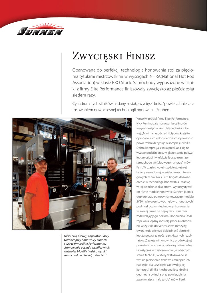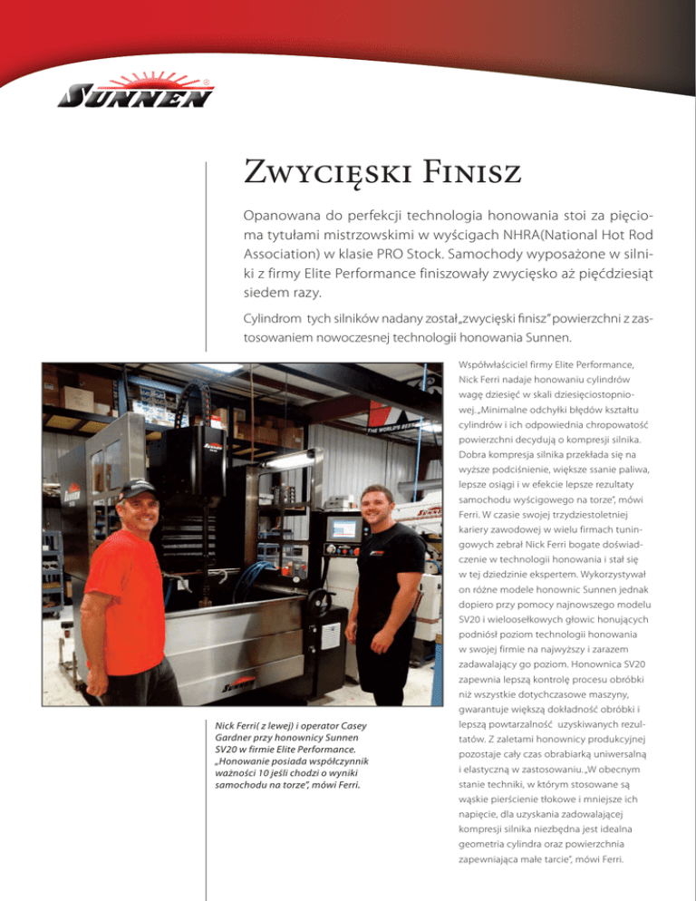 Zwycięski Finisz Opanowana do perfekcji technologia honowania stoi za pięcioma tytułami mistrzowskimi w wyścigach NHRA(National Hot Rod Association) w klasie PRO Stock. Samochody wyposażone w silniki z firmy Elite Performance finiszowały zwycięsko aż pięćdziesiąt siedem razy. Cylindrom tych silników nadany został „zwycięski finisz” powierzchni z zastosowaniem nowoczesnej technologii honowania Sunnen. Współwłaściciel firmy Elite Performance, Nick Ferri nadaje honowaniu cylindrów wagę dziesięć w skali dziesięciostopniowej. „Minimalne odchyłki błędów kształtu cylindrów i ich odpowiednia chropowatość powierzchni decydują o kompresji silnika. Dobra kompresja silnika przekłada się na wyższe podciśnienie, większe ssanie paliwa, lepsze osiągi i w efekcie lepsze rezultaty samochodu wyścigowego na torze”, mówi Ferri. W czasie swojej trzydziestoletniej kariery zawodowej w wielu firmach tuningowych zebrał Nick Ferri bogate doświadczenie w technologii honowania i stał się w tej dziedzinie ekspertem. Wykorzystywał on różne modele honownic Sunnen jednak dopiero przy pomocy najnowszego modelu SV20 i wieloosełkowych głowic honujących podniósł poziom technologii honowania w swojej firmie na najwyższy i zarazem zadawalający go poziom. Honownica SV20 zapewnia lepszą kontrolę procesu obróbki niż wszystkie dotychczasowe maszyny, gwarantuje większą dokładność obróbki i Nick Ferri( z lewej) i operator Casey Gardner przy honownicy Sunnen SV20 w firmie Elite Performance. „Honowanie posiada współczynnik ważności 10 jeśli chodzi o wyniki samochodu na torze”, mówi Ferri. lepszą powtarzalność uzyskiwanych rezultatów. Z zaletami honownicy produkcyjnej pozostaje cały czas obrabiarką uniwersalną i elastyczną w zastosowaniu. „W obecnym stanie techniki, w którym stosowane są wąskie pierścienie tłokowe i mniejsze ich napięcie, dla uzyskania zadowalającej kompresji silnika niezbędna jest idealna geometria cylindra oraz powierzchnia zapewniająca małe tarcie”, mówi Ferri. Zespół budowy silnika firmy Elite Performance wraz ze zwycięskim kierowcą Ericą Enders cieszą się z dwukrotnego zdobycia mistrzowskiego tytułu w NHRA Pro Stock. „Sterowane komputerowo ruchy rozsu- Dodatkowo produkujemy silniki na sprze- wania osełek i skoku głowicy honującej, daż, począwszy od Stock Eliminator do Pro które zapewnia honownica SV20, umożli- Mod i wybrane silniki dla innych rodzajów wiają precyzyjne dopasowanie parametrów wyścigów”. Silniki wyczynowe Pro Stock obróbki. Układ sterowania CNC zapewnia bazują na blokach OEM(Original Equipment powtarzalność uzyskanych wyników, a także Manufacurer). W przypadku zwycięskiego możliwość ich łatwej optymalizacji. Wszystko samochodu Camaro z sezonu 2015, którego to przyczynia się do naszych doskonałych wy- kierowcą była Erica Enders-Stevens był to blok ników na torze”. Ferri rozpoczął swoja karierę GM DRCE 2 o pojemności 8,2 litra wykonany w roku 1986 firmie Medcap Racing Engines, z żeliwa o tzw zwartym graficie (CGI). „Firma a następnie kontynuował ją w innych firmach Elite Performance koncentruje się na obróbce wykańczającej elementów silnika”, wyjaśnia Ferri. „Mamy obrabiarki do wykonania naszej części roboty podczas gdy większość obróbki zgrubnej oddajemy innym zaufanym firmom”. Honowanie bloków wykonanych z żeliwa o zwartym graficie(CGI) jest „oczkiem w głowie” dla Nicka Ferri. „Wszyscy uważają, że najważniejsze są głowice i wałki rozrządu, ale z mojego doświadczenia wynika, że to właśnie szczelny cylinder decyduje o osiągach silnika”, mówi Ferri. „Inne elementy i zespoły nie nadrobią braku szczelności w cylindrze. Można to potwierdzić na hamowni obserwując ssanie paliwa, który to parametr jest dla mnie podstawowym miernikiem. zdobywając w tym czasie bogate doświadczenie. Na początku był operatorem honownicy Sunnen CK10, a następnie pracował na modelu Sunnen CK21, który był pierwszym w świecie modelem honownicy ze sterowaniem CNC dedykowanym do regeneracji i tuningu silników. W roku 2012 wraz z Richardem Freemanem zakupili wyposażenie od firmy North Carolina Engine Shop i powołali do życia nowa firmę Elite Motorsports. Celem przedsięwzięcia biznesowego było stworzenie nowej marki silników wyścigowych „Elite” i ich montaż w samochodach sponsorowanych przez Elite Motorsports. „Silniki Pro Stock to nasza dziedzina, mówi Ferri. Zaczynaliśmy z dwoma silnikami, a dzisiaj mamy ich osiem i montujemy je w czterech sponsorowanych przez nas samochodach. Operator honownicy SV20 dokonuje pomiaru cylindra przy pomocy średnicówki Sunnen. Jeżeli porównamy dwa silniki mające tę samą problemów. Osełki diamentowe oraz ich licz- być zastosowana w dowolnym momencie moc na hamowni, ale jeden z nich będzie ba odgrywają znaczącą rolę w uzyskaniu naj- cyklu, ale jest szczególnie pomocna podczas wykazywał większe ssanie paliwa, to wła- lepszej dokładności geometrycznej cylindra zabiegu honowania wykańczającego. Zabieg śnie on będzie zwycięzcą na torze. Ssanie na całej jego wysokości. Stosujemy głowice odwracania kierunku obrotów wrzeciona paliwa zależy od szczelności pary cylinder- z dwunastoma osełkami diamentowymi na poprawia geometrię cylindra(odchyłkę pierścień tłokowy. Nasze silniki Pro Stock obwodzie. W przeszłości kiedy używaliśmy owalności) oraz ułatwia uzyskanie wymaganej rozwijają na dynamometrze moc 1420 kM innej maszyny i innych głowic honujących chropowatości powierzchni. Osełki pracujące oraz moment obrotowy przekraczający 1085 musieliśmy stosować triki, aby uzyskać efekt w odwrotnym kierunku skutecznie usuwają Nm przy maksymalnych obrotach 11.000 zadowalającego wybierania materiału w dole ciaśniejsze miejsca pozostawione w cyklu re- obr/min. Stosujemy wolframowe pierścienie cylindra. Jednym z nich było kształtowan