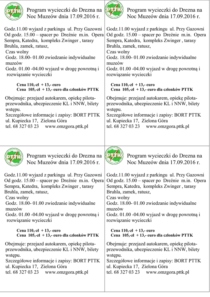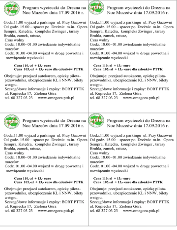 Program wycieczki do Drezna na Noc Muzeów dnia 17.09.2016 r. Godz.11.00 wyjazd z parkingu ul. Przy Gazowni Od godz. 15.00 – spacer po Dreźnie m.in. Opera Sempra, Katedra, kompleks Zwinger , tarasy Bruhla, zamek, ratusz, Czas wolny Godz. 18.00- 01.00 zwiedzanie indywidualne muzeów Godz. 01.00 -04.00 wyjazd w drogę powrotną i rozwiązanie wycieczki Cena 110,-zł + 13,- euro Cena 105,-zł + 13,- euro dla członków PTTK Obejmuje: przejazd autokarem, opiekę pilotaprzewodnika, ubezpieczenie KL i NNW, bilety wstępu. Szczegółowe informacje i zapisy: BORT PTTK ul. Kupiecka 17, Zielona Góra tel. 68 327 03 23 www.omzgora.pttk.pl Program wycieczki do Drezna na Noc Muzeów dnia 17.09.2016 r. Godz.11.00 wyjazd z parkingu ul. Przy Gazowni Od godz. 15.00 – spacer po Dreźnie m.in. Opera Sempra, Katedra, kompleks Zwinger , tarasy Bruhla, zamek, ratusz, Czas wolny Godz. 18.00- 01.00 zwiedzanie indywidualne muzeów Godz. 01.00 -04.00 wyjazd w drogę powrotną i rozwiązanie wycieczki Cena 110,-zł + 13,- euro Cena 105,-zł + 13,- euro dla członków PTTK Obejmuje: przejazd autokarem, opiekę pilotaprzewodnika, ubezpieczenie KL i NNW, bilety wstępu. Szczegółowe informacje i zapisy: BORT PTTK ul. Kupiecka 17, Zielona Góra tel. 68 327 03 23 www.omzgora.pttk.pl Program wycieczki do Drezna na Noc Muzeów dnia 17.09.2016 r. Godz.11.00 wyjazd z parkingu ul. Przy Gazowni Od godz. 15.00 – spacer po Dreźnie m.in. Opera Sempra, Katedra, kompleks Zwinger , tarasy Bruhla, zamek, ratusz, Czas wolny Godz. 18.00- 01.00 zwiedzanie indywidualne muzeów Godz. 01.00 -04.00 wyjazd w drogę powrotną i rozwiązanie wycieczki Cena 110,-zł + 13,- euro Cena 105,-zł + 13,- euro dla członków PTTK Obejmuje: przejazd autokarem, opiekę pilotaprzewodnika, ubezpieczenie KL i NNW, bilety wstępu. Szczegółowe informacje i zapisy: BORT PTTK ul. Kupiecka 17, Zielona Góra tel. 68 327 03 23 www.omzgora.pttk.pl Program wycieczki do Drezna na Noc Muzeów dnia 17.09.2016 r. Godz.11.00 wyjazd z parkingu ul. Przy Gazowni Od godz. 15.00 – spacer po Dreźnie m.in. Opera Sempra, Katedra, kompleks Zwinger , tarasy Bruhla, zamek, ratusz, Czas wolny Godz. 18.00- 01.00 zwiedzanie indywidualne muzeów Godz. 01.00 -04.00 wyjazd w drogę powrotną i rozwiązanie wycieczki Cena 110,-zł + 13,- euro Cena 105,-zł + 13,- euro dla członków PTTK Obejmuje: przejazd autokarem, opiekę pilotaprzewodnika, ubezpieczenie KL i NNW, bilety wstępu. Szczegółowe informacje i zapisy: BORT PTTK ul. Kupiecka 17, Zielona Góra tel. 68 327 03 23 www.omzgora.pttk.pl