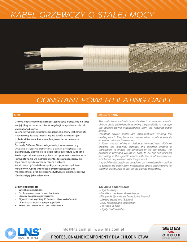 KABEL GRZEWCZY O STAŁEJ MOCY Główną cechą tego typu kabli jest jednakowe obciążenie na całej swojej długości oraz możliwość regulacji mocy niezależnie od wymaganej długości. Są one wytwarzane z przewodu grzejnego, który jest nawinięty na przewody fazowy i neutralny. Na całość nakładana jest izolacja silikonowa, która zapobiega rozdarciu przewodu grzejnego. Co każde 500mm, 10mm sekcje izolacji są usuwane, aby utworzyć połączenie elektryczne, a silikon zewnętrzny jest przezroczysty, żeby miejsca cięcia kabla były łatwo widoczne. Produkt jest dostępny w szpulach. Jest przeznaczony do cięcia i przygotowania wg potrzeb Klienta. Zestaw akcesoriów do tego może być dostarczony razem z kablem. Kabel może być dodatkowo pokryty specjalnym oplotem metalowym. Oplot chroni kabel przed uszkodzeniami mechanicznymi oraz zwiększoną dystrybucję ciepła. Może być również użyty jako uziemienie. Główne korzyści to: ź Wysoka elastyczność ź Doskonała odporność mechaniczna ź Idealny do grzania powierzchni ź Ograniczone wymiary (3,5mm) - Łatwe wykańczanie i instalacja - Dostarczany w szpulach ź Pełne dostosowanie do potrzeb klienta [email protected] www.lns.com.pl PROFESJONALNE KOMPONENTY DLA CHŁODNICTWA KABLE GRZEJNE O STAŁEJ MOCY Klimatyzacja (ogrzewanie i konserwacja temperaturowa dla beczek i zbiorników); budownictwo (ogrzewanie i ochrona przeciw zamarzaniu rur, zaworów; systemy usuwania śniegu, rury spustowe, systemy przeciwoblodzeniowe, ogrzewanie podłogowe); chłodnictwo komercyjne i przemysłowe (drzwi komór chłodniczych); ogrzewanie szklarni, akwariów i terrariów. LNS Sp. z o.o. ul. Żernicka 9, 55-010, Święta Katarzyna tel: +48 71 716 44 50 fax: +48 71 716 44 51 e-mail: [email protected] KRS 0000476413; NIP 8961535367; REGON 022250607