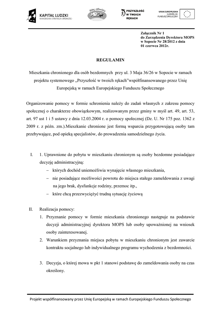 Załącznik Nr 1 do Zarządzenia Dyrektora MOPS w Sopocie Nr 28/2012 z dnia 01 czerwca 2012r. REGULAMIN Mieszkania chronionego dla osób bezdomnych przy ul. 3 Maja 36/26 w Sopocie w ramach projektu systemowego „Przyszłość w twoich rękach”współfinansowanego przez Unię Europejską w ramach Europejskiego Funduszu Społecznego Organizowanie pomocy w formie schronienia należy do zadań własnych z zakresu pomocy społecznej o charakterze obowiązkowym, realizowanym przez gminy w myśl art. 49, art. 53, art. 97 ust 1 i 5 ustawy z dnia 12.03.2004 r. o pomocy społecznej (Dz. U. Nr 175 poz. 1362 z 2009 r. z późn. zm.).Mieszkanie chronione jest formą wsparcia przygotowującą osoby tam przebywające, pod opieką specjalistów, do prowadzenia samodzielnego życia. I. 1. Uprawnione do pobytu w mieszkaniu chronionym są osoby bezdomne posiadające decyzję administracyjną: których dochód uniemożliwia wynajęcie własnego mieszkania, nie posiadające możliwości powrotu do miejsca stałego zameldowania z uwagi na jego brak, dysfunkcje rodziny, przemoc itp., które chcą przezwyciężyć trudną sytuację życiową II. Realizacja pomocy: 1. Przyznanie pomocy w formie mieszkania chronionego następuje na podstawie decyzji administracyjnej dyrektora MOPS lub osoby upoważnionej na wniosek osoby zainteresowanej. 2. Warunkiem przyznania miejsca pobytu w mieszkaniu chronionym jest zawarcie kontraktu socjalnego lub indywidualnego programu wychodzenia z bezdomności. 3. Decyzja, o której mowa w pkt 1 stanowi podstawę do zameldowania osoby na czas określony. Projekt współfinansowany przez Unię Europejską w ramach Europejskiego Funduszu Społecznego 4. Brak aktywności w rozwiązywaniu swoich problemów lub niespełnienie warunków kontraktu socjalnego lub indywidualnego programu wychodzenia z bezdomności w czasie pobytu może spowodować uchylenie decyzji przyznającej miejsce w mieszkaniu chronionym. 5. Bezpośredni nadzór merytoryczny nad funkcjonowaniem mieszkania chronionego w okresie czerwiec 2012 do sierpień 2013 sprawuje Zespół Projektu Systemowego Po tym okresie nadzór nad mieszkaniem obejmuje Dział Pracy Socjalnej. III. Ogólne warunki dotyczące pobytu i opłat za użytkowanie w mieszkaniu chronionym: 1. Mieszkaniec zobowiązany jest do ponoszenia opłat związanych z eksploatacją lokalu, zgodnie z postanowieniem wyrażonym w decyzji dyrektora MOPS w Sopocie. 2. Miesięczny koszt pobytu ustalony jest w oparciu o rzeczywiste koszty poniesione na utrzymanie mieszkania określone w zarządzeniu dyrektora MOPS w Sopocie. 3. W przypadku trudnej sytuacji, gdy osoba bezdomna nie jest w stanie ponieść kosztów za mieszkanie chronione dyrektor lub osoba upoważniona może go okresowo częściowo lub całkowicie zwolnić z odpłatności. 4. Prawo pobytu w lokalu mieszkalnym mają wyłącznie osoby uprawnione. 5. Użytkownik jest zobowiązany do racjonalnego korzystania z mediów, do utrzymania porządku i czystości oraz przestrzegania norm i zasad współżycia społecznego( np.: przestrzeganie ciszy nocnej) 6. W godzinach 22.00-6.00 na terenie mieszkania chronionego obowiązuje bezwzględny zakaz przebywania, nocowania osób do tego nieuprawnionych. 7. Na terenie mieszkania chronionego obowiązuje zakaz spożywania oraz posiadania alkoholu a także substancji psychoaktywnych. Nieprzestrzeganie zakazu skutkować będzie natychmiastowym usunięciem z mieszkania chronionego. 8. Mieszkaniec zobowiązany jest do przestrzegania regulaminu oraz przepisów ppoż. Oświadczenie o zapoznaniu się z regulaminem oraz przepisami ppoż. stanowi załącznik do regulaminu 9. O jakichkolwiek zagrożeniach mieszkaniec zobowiązany jest niezwłocznie powiadomić zespół projektu systemowego lub służby ratownicze. 10. Zabrania się dokonywania przeróbek i manipulacji przy urządzeniach i instalacjach oraz dokonywania zmian konstrukcyjno-technicznych w mieszkaniu. Projekt współfinansowany przez Unię Europejską w ramach Europejskiego Funduszu Społecznego 11. W okresie czerwiec 2012-sierpień 2013 uprawniony pracownik zespołu projektu systemowego a po tym okresie pracownik Działu Pracy Socjalnej ma prawo do dokonywania niezapowiedzianych kontroli przestrzegania zasad regulaminu. 12. Przy opuszczaniu mieszkania chronionego mieszkaniec zobowiązany jest do pozostawienia wyposażenia zgodnie z jego stanem w dniu przyjęcia. DYREKTOR Miejskiego Ośrodka Pomocy Społecznej / - / mgr Anna Jarosz Projekt współfinansowany przez Unię Europejską w ramach Europejskiego Funduszu Społecznego Załącznik do regulaminu mieszkania chronionego dla osób bezdomnych Oświadczenie Oświadczam, że zapoznałem/am się z regulaminem mieszkania chronionego dla osób bezdomnych oraz przepisami ppoż. i zobowiązuję się do ich przestrzegania. W szczególności do : 1. ponoszenia opłat związanych z eksploatacją lokalu, zgodnie z postanowieniem wyrażonym w decyzji dyrektora MOPS w Sopocie, 2. racjonalnego korzystania z mediów, do utrzymania porządku i czystości oraz przestrzegania norm i zasad współżycia społecznego( np.: przestrzeganie ciszy nocnej), 3. przestrzegania bezwzględnego zakazu przebywania, nocowania w godzinach 22.00-6.00 w mieszkaniu chronionym osób do tego nieuprawnionych, 4. przestrzegania zakazu spożywania oraz posiadania alkoholu a także substancji psychoaktywnych na terenie mieszkania chronionego. Jednocześnie zostałem poinformowany/a o tym, że nieprzestrzeganie zasad regulaminu skutkuje pozbawieniem prawa do zamieszkiwania w mieszkaniu chronionym. ……………………….. data i podpis Projekt współfinansowany przez Unię Europejską w ramach Europejskiego Funduszu Społecznego