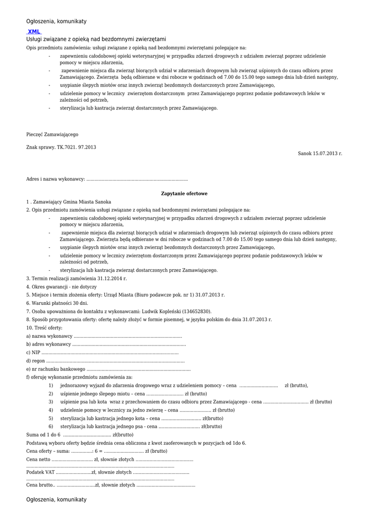 Ogłoszenia, komunikaty XML Usługi związane z opieką nad bezdomnymi zwierzętami Opis przedmiotu zamówienia: usługi związane z opieką nad bezdomnymi zwierzętami polegające na: - zapewnieniu całodobowej opieki weterynaryjnej w przypadku zdarzeń drogowych z udziałem zwierząt poprzez udzielenie pomocy w miejscu zdarzenia, - zapewnienie miejsca dla zwierząt biorących udział w zdarzeniach drogowym lub zwierząt uśpionych do czasu odbioru przez Zamawiającego. Zwierzęta będą odbierane w dni robocze w godzinach od 7.00 do 15.00 tego samego dnia lub dzień następny, - usypianie ślepych miotów oraz innych zwierząt bezdomnych dostarczonych przez Zamawiającego, - udzielenie pomocy w lecznicy zwierzętom dostarczonym przez Zamawiającego poprzez podanie podstawowych leków w zależności od potrzeb, - sterylizacja lub kastracja zwierząt dostarczonych przez Zamawiającego. Pieczęć Zamawiającego Znak sprawy. TK.7021. 97.2013 Sanok 15.07.2013 r. Adres i nazwa wykonawcy: .......................................................................... Zapytanie ofertowe 1 . Zamawiający Gmina Miasta Sanoka 2. Opis przedmiotu zamówienia usługi związane z opieką nad bezdomnymi zwierzętami polegające na: - zapewnieniu całodobowej opieki weterynaryjnej w przypadku zdarzeń drogowych z udziałem zwierząt poprzez udzielenie pomocy w miejscu zdarzenia, - zapewnienie miejsca dla zwierząt biorących udział w zdarzeniach drogowym lub zwierząt uśpionych do czasu odbioru przez Zamawiającego. Zwierzęta będą odbierane w dni robocze w godzinach od 7.00 do 15.00 tego samego dnia lub dzień następny, - usypianie ślepych miotów oraz innych zwierząt bezdomnych dostarczonych przez Zamawiającego, - udzielenie pomocy w lecznicy zwierzętom dostarczonym przez Zamawiającego poprzez podanie podstawowych leków w zależności od potrzeb, - sterylizacja lub kastracja zwierząt dostarczonych przez Zamawiającego. 3. Termin realizacji zamówienia 31.12.2014 r. 4. Okres gwarancji - nie dotyczy 5. Miejsce i termin złożenia oferty: Urząd Miasta (Biuro podawcze pok. nr 1) 31.07.2013 r. 6. Warunki płatności 30 dni. 7. Osoba upoważniona do kontaktu z wykonawcami: Ludwik Kopleński (134652830). 8. Sposób przygotowania oferty: ofertę należy złożyć w formie pisemnej, w języku polskim do dnia 31.07.2013 r. 10. Treść oferty: a) nazwa wykonawcy ............................................................................... b) adres wykonawcy ................................................................................... c) NIP .................................................................................................... d) regon ..................................................................................................... e) nr rachunku bankowego ............................................................................ f) oferuję wykonanie przedmiotu zamówienia za: 1) jednorazowy wyjazd do zdarzenia drogowego wraz z udzieleniem pomocy – cena …......................... 2) uśpienie jednego ślepego miotu – cena …........................ zł (brutto) 3) uśpienie psa lub kota wraz z przechowaniem do czasu odbioru przez Zamawiającego - cena ….............................. zł (brutto) 4) udzielenie pomocy w lecznicy za jedno zwierzę – cena ….................... zł (brutto) 5) sterylizacja lub kastracja jednego kota – cena ….......................... zł(brutto) 6) sterylizacja lub kastracja jednego psa - cena …........................... zł(brutto) Suma od 1 do 6 …................................ zł(brutto) Podstawą wyboru oferty będzie średnia cena obliczona z kwot zaoferowanych w pozycjach od 1do 6. Cena oferty – suma: …............: 6 = ….......................... zł (brutto) Cena netto .............................. zł, słownie złotych …....................................... ............................................................................................................ Podatek VAT ..........................zł, słownie złotych …...................................... ............................................................................................................ Cena brutto.. ............................zł, słownie złotych ........................................... Ogłoszenia, komunikaty zł (brutto), Ogłoszenia, komunikaty 11. Oświadczam, że zapoznałem sic z opisem przedmiotu zamówienia i nie wnoszę do niego zastrzeżeń. …............................................ Data i podpis oferenta. Zamawiający zastrzega odstąpienie od udzielenia zamówienia bez podania przyczyn. Podmiot publikujący Urząd Miasta w Sanoku Wytworzył Kinga Czekańska 2013-07-15 Publikujący - Ogłoszenia, komunikaty