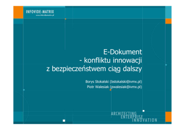 E-Dokument - konfliktu innowacji z bezpieczeństwem ciąg dalszy Borys Stokalski ([email protected]) Piotr Walesiak ([email protected]) Agenda • • • • Wprowadzenie: e-Dokument Innowacje i rola e-Dokumentu Jasna i ciemna strona e-Dokumentu Poza e-Dokument • Psychologia e-Dokumentu, czyli przed czym jeszcze zabezpiecza e-Dokument E-Dokument (tu): • koncept – przeniesienie (metafora) bytów takich jak wniosek, decyzja, wezwania, zeznanie …, zaświadczenie/poświadczenie, … z nośników papierowych na media (nośniki) elektroniczne (cyfrowe, komputerowe) – – – – integralne powiązanie informacji z jej reprezentacją jednostkowość (fragmentaryczność) persystencja „komunikatów” „oświadczenie woli” • zbiór określonych rozwiązań, technik, technologii i narzędzi stosowanych w implementacji tej metafory (PKI, BPE, urządzenia, weryfikacja/dowodzenie ważności podpisu, metadane, …) E-Dokument - obserwacje • Centralne zagadnienie wielu projektów obecnie realizowanych w administracji publicznej • Trudny – Bardzo nowoczesne technologie (niekoniecznie stabilne, niekoniecznie dobrze wystandaryzowane, mało znane, często również drogie) – Rozwiązania generalne (rozwiązania ogólne są o rząd wielkości trudniejsze) – Większość osób nie rozumie zasad działania rozwiązań technicznych stojących za e-dokumentem (nawet wśród informatyków są z tym problemy) Innowacje - przykłady • Bankowość: odmiejscowienie klienta – Oddziały banku stają się w zasadzie POKami (większość spraw można załatwić w dowolnym z nich) – Natura rozwiązania IT: centralizacja systemów + zdalny dostęp • Transport lotniczy: global distribution system – Długa historia sięgająca lat 60 (SABRE) – Obecnie np.: • Pełna samoobsługa zakupu przelotu • nie ma „biletów” – Natura rozwiązania IT: globalna sieć współdziałających systemów (struktura „federacyjna” niescentralizowana) • Automatycznych systemów rezerwacji (w liniach lotniczych) • Systemów agentów • Handel: aukcje internetowe – Transakcje handlowe (pieniądze), zaufanie, spory – bez e-dokumentu Innowacje - przykłady • Administracja: CEPiK – Zgromadzenie informacji z całego kraju o pojazdach/kierowcach, udostępnienie jej podmiotom przeciwdziałającym i ścigającym różne rodzaje przestępstw/wykroczeń – Natura rozwiązania IT: centralizacja przetwarzania + zdalny dostęp – 2004-2007: ponad dwukrotny spadek liczby kradzieży samochodów (por.: 2001-2004 ok. 15% spadku) – Wciąż istotny niewykorzystany potencjał innowacji (np. kontrola drogowa bez dokumentów) • Administracja: KSI ZUS - Płatnik – Przetwarzane w systemach dane pochodzą wprost od płatnika (bez przepisywania w urzędzie) – mała liczba błędów (tylko te, które popełnili płatnicy), wydajność (skala) – Natura rozwiązania IT: elektroniczne przekazywania dokumentów ubezpieczeniowych i automatyzacja pobierania danych z tych dokumentów do systemów w ZUS • Użyto E-Dokumentu jako metafory • Użyto dużo prostszych rozwiązań - mniej ogólnych, tańszych, mniej bezpiecznych (… i nic szczególnego się nie stało) Rola e-dokumentu dla osiągania korzyści z innowacji … • … jest pomocnicza (a nie zasadnicza): – jako zabezpieczenia – tam gdzie jest taka potrzeba • Wdrożonego jako wynik oceny ryzyka – jako nieinteraktywnego interfejsu z otoczeniem (np. człowiekiem) – tam gdzie jest taka potrzeba • Istotne korzyści osiągane są dzięki (Æ przykłady): – agregacji informacji – zdalnemu i interaktywnemu dostępowi (komunikacji) – ograniczeniu udziału ludzi w przetwarzaniu informacji • … poprzez tworzenie rzeczy (usług) nowych (wcześniej niemożliwych) – w odróżnieniu od e-(lektronizacji) rzeczy istniejących • … wykorzystując e-dokument lub nie – w zależności od potrzeb w odpowiednim zakresie i sposobie Moc e-Dokumentu • Bezpieczeństwo (integralność, audytowalność, precyzyjna kontrola dostępu) – Związanie informacji i jej reprezentacji („materializacja” informacji) – Praca na „oryginalnej” informacji w takiej reprezentacji, w jakiej pojawiła się w systemie informacyjnym po raz pierwszy (pewność pochodzenia, pewność autentyczności) – Zmiana reprezentacji Æ nowy dokument (autor, odpowiedzialność za transformacje) – Pełna „dokumentacja” przetwarzania • Zapewniane już przez samą „metaforę” dokumentu • Rozwiązania techniczne wzmacniają zapewnienie Ciemna strona Mocy • Kusząca i „łatwa” • Szybka droga – Wszystkie dotychczas rozpatrywane sprawy stają się realizowalne w kanałach elektronicznych – Szybka informatyzacja i skok w „benchmarkach” – Bez wdrażania istotnych zmian w funkcjonowaniu administracji • Można zostawić to informatykom • Ale – Ryzyko „niepraktyczności” – Wątpliwy wpływ na wydajność i jakość – „informatyzacja” bez „modernizacji” Ograniczający wpływ zabezpieczeń • Zabezpieczenia są złem koniecznym – Zawsze kosztują i są problemem – Zabezpieczenia potrzebne … są potrzebne – Zabezpieczenia niepotrzebne … są szkodliwe • E-Dokument - wyrafinowane zabezpieczenie – skuteczne „techniczne” utrudnienie – to co dla informatyki łatwe i naturalne, staje się o rząd wielkości trudniejsze, spada wydajność, rosną koszty – zabezpieczenia potrafią generować więcej złożoności niż funkcjonalność • Zabezpieczenia wdrażane dla idei stanowią wyłącznie barierę dla wdrażania i rozprzestrzeniania innowacji Ograniczający wpływ metafory • Metafora kształtuje sposób w jaki ludzie pojmują możliwości IT … • … i (w konsekwencji) w jaki sposób je stosują • Metafora dokumentu – ogranicza możliwości agregacji informacji – zakłada nieinteraktywną komunikację – wpływa na możliwości automatycznego przetwarzania • E-Dokument ogranicza IT • 