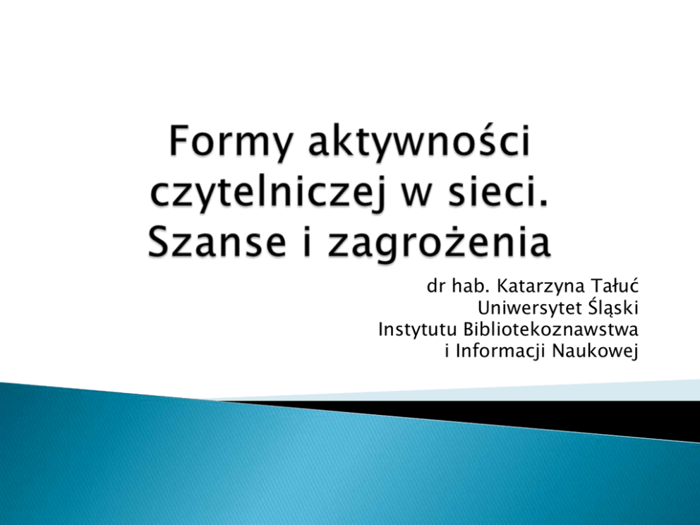 dr hab. Katarzyna Tałuć Uniwersytet Śląski Instytutu Bibliotekoznawstwa i Informacji Naukowej cyfrowi tubylcy urodzeni po 1983 r. cyfrowi imigranci urodzeni przed 1983 r. Nie znają świata bez urządzeń elektronicznych (komputerów, smartfonów, tabletów). Traktują je ufnie, kreatywnie, eksperymentują z nimi. Nawet jeżeli korzystają z urządzeń elektronicznych, to traktują je nieufnie. Wykorzystują najczęściej tylko funkcje podstawowe tych urządzeń. Potrafią wyobrażać sobie przestrzeń wirtualną. Mają problemy z percepcją wirtualnej powierzchni zamkniętej w „miniaturowym okienku urządzenia”. Mają problem ze zrozumieniem długiego, skomplikowanego tekstu. Potrafią zrozumieć długi, linearny tekst. Przedkładają obraz, dźwięk nad tekst. Przedkładają tekst nad obraz, dźwięk. Preferują równoległe przetwarzanie informacji pochodzących z różnych źródeł (hipertekstowa, hipermedialna lektura). Preferują linearne myślenie i szeregowanie informacji. Preferują eksperymentowanie, uczenie się krótkotrwałe, zadaniowe; oczekują natychmiastowych efektów. Preferują cierpliwość, systematyczność, kumulatywne uczenie się. baby boomers (1946-1979) – pracownicy, którzy "pracują po to, żeby przetrwać" generacja X (1965-1979) – pracownicy, którzy "żyją po to, żeby pracować" generacja Y (1980-1995) – pracownicy, którzy "pracują po to, żeby żyć" generacja Z (1995 - ) Ambicja. Ciekawość, otwartość. Biegła znajomość świata wirtualnego. Zagubienie. Powierzchowność, niecierpliwość. Podziały. Rozkład odpowiedzi dwunastolatków na pytanie: „Jak często używasz komputera i Internetu do wymienionych czynności?” N=1694 0% 20% 40% korzystam z portali społecznościowych 60% słucham muzyki, oglądam teledyski, koncertyKategoria 1 35% oglądam filmy tworzę i umieszczam własne dzieła, np. filmowe, muzyczne 14% 14% 15% 14% codziennie lub prawie codziennie 14% co najmniej raz w tygodniu 18% 13% 11% 12% 5% 14% 42% 74% 10% 69% tworzę i umieszczam własne dzieła pisarskie 3%3%4% 6% robię zakupy przez internet 4% 6% 12% 22% 6% 5% 6% 7% 5% 8% 9% 22% 31% 13% 5% 6% 6% 14% 31% 22% 10% 14% 24% 31% korzystam z poczty elektronicznej tworzę i prowadzę własną stronę internetową lub blog 20% 100% 7% 4% 25% 38% gram w gry komputerowe 80% 16% 52% korzystam z komunikatorów (np.. Gadu-Gadu, Skype) uczestniczę w dyskusjach na forach internetowych 60% 84% 24% co najmniej raz w miesiącu 53% kilka razy w roku nigdy lub prawie nigdy Źródło: Instytut Badań Edukacyjnych, badania przeprowadzone w 2013 r. http://www.ibe.edu.pl/pl/media-prasa/aktualnosci-prasowe/455-czytelnictwo-komputerowe-dzieci-i-mlodziezy 120% Wypowiedzi inspirowane tekstami kultury popularnej (opowiadanie, wiersz, teksty piosenek, komiksy, film, gra komputerowa) publikowane i dystrybuowane w Internecie. Subkultura złożona z fanów, charakteryzującą się wspólną empatią oraz odczuwaniem silnych emocji wobec wspólnego obiektu zainteresowań. ◦ Fan fiction – historie alternatywne (wspólny bohater, inna fabuła, inna sceneria). ◦ Fan fiction – kontynuacje (dalsze losy bohatera). ◦ Fan fiction – przeniesienie (bohater w nowym świecie przedstawionym). ◦ Fan fiction – wątki poboczne (rozwinięcie losów bohaterów drugoplanowych). ◦ Fan fiction – zrównanie moralne (zmiana radykalna wizerunku bohatera głównego). ◦ Fan fiction – połączenie (bohaterowie różnych tekstów kultury w jednym świecie przedstawionym). ◦ Fan fiction – personalizacja (wprowadzenie autora fan ficion w świat przedstawiony). ◦ Fan fiction – zmiana gatunku (zmiana konwencji gatunkowej pierwowzoru). Fanfiction.net: jedno z najpopularniejszych miejsc udostępniających fanfiki https://www.fanfiction.net/ (od ang. weblog ‘rejestr internetowy’, ‘diariusz sieciowy’) – dziennik (pamiętnik) prowadzony w Internecie, rodzaj osobistej strony WWW, na której autor umieszcza zapiski swoich bieżących przeżyć i przemyśleń oraz różne, jego zdaniem interesujące, informacje. Istnieją różne rodzaje blogów: dzienniki osobiste, typu silva rerum – mające charakter zbioru różnorakich wiadomości i linków do innych stron WWW, specjalistyczne – poświęcone jakiemuś przedsięwzięciu lub problemowi naukowemu czy innemu (Słownik terminologii medialnej) Budowa blogu ◦ Winieta z nagłówkiem ◦ Wizytówka ◦ Blogroll ◦ Pole notek Funkcje blogu: ◦ potrzeba gratyfikacji ego, ◦ potrzeba antydepersonalizacji, ◦ potrzeba przynależności, ◦ potrzeba samorealizacji, ◦ potrzeba władzy. Blog Aleksego Krzysztofiaka http://ksiazkinaczacie.pl/ http://kochane-ksiazki.blogspot.com/ BiblioNETka Nakanapie.pl Lubimy Czytać BookTube - zbiorcze określenie anglojęzycznych użytkowników serwisu YouTube, którzy kręcą filmiki o książkach: recenzje, zdobycze, relacje z postępów w ramach udziału we wszelkich akcjach czytelniczych itp. Zasacka Z., Czytelnictwo dzieci i młodzieży, Warszawa 2014. Kultura czytelnicza dzieci i młodzieży początku XXI wieku, red. M. Antczak, A. Brzuska-Kępa, A. Walczak-Niewiadomska, Łódź 2013. Między dzieciństwem a dorosłością. Młodzież w bibliotece, red. A. M. Krajewska, Warszawa 2012. Społeczeństwo internautów a kultura globalna. Młody użytkownik w sieci, red. M. Kalczyńska, Opole 2014.