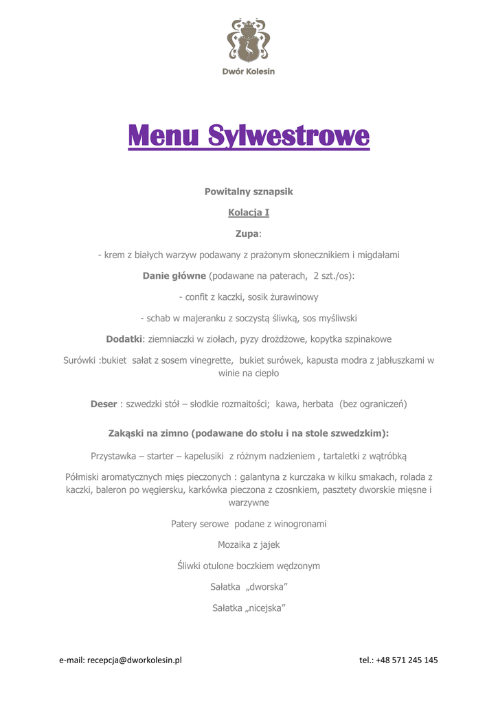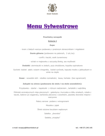 Menu Sylwestrowe Powitalny sznapsik Kolacja I Zupa: - krem z białych warzyw podawany z prażonym słonecznikiem i migdałami Danie główne (podawane na paterach, 2 szt./os): - confit z kaczki, sosik żurawinowy - schab w majeranku z soczystą śliwką, sos myśliwski Dodatki: ziemniaczki w ziołach, pyzy drożdżowe, kopytka szpinakowe Surówki :bukiet sałat z sosem vinegrette, bukiet surówek, kapusta modra z jabłuszkami w winie na ciepło Deser : szwedzki stół – słodkie rozmaitości; kawa, herbata (bez ograniczeń) Zakąski na zimno (podawane do stołu i na stole szwedzkim): Przystawka – starter – kapelusiki z różnym nadzieniem , tartaletki z wątróbką Półmiski aromatycznych mięs pieczonych : galantyna z kurczaka w kilku smakach, rolada z kaczki, baleron po węgiersku, karkówka pieczona z czosnkiem, pasztety dworskie mięsne i warzywne Patery serowe podane z winogronami Mozaika z jajek Śliwki otulone boczkiem wędzonym Sałatka „dworska” Sałatka „nicejska” e-mail: [email protected] tel.: +48 571 245 145 Szwedzki stół: ryby i śledzie w różnych postaciach, pstrągi w galarecie, smalczyk, podroby wiejskie, ogóreczki, pieczywo swojskie. Kolacja II – podawana do stołu – ok 23.00 - filet z łososia, warzywa grillowane, ryż, sosik cytrynowy - rumiane roladki z kurczęcia, ziemniaczki pieczone, surówka z marchewki Atrakcja północy - szampan – ciepłe paszteciki z ciasta francuskiego z nadzieniem jarskim i mięsnym – podawane na dziedzińcu Dworu Szwedzkie stoły ok 1.00 Płonące udźce wieprzowe z pieczonymi ziemniakami, kapusta zasmażana z grzybkami Wybór pierogów i krokietów - podawane do stołu Zupa szefa kuchni Boeuf Strogonow z gorącymi grzankami Alkohol : ½ l wódki na parę lub zamiennie 1 wino Szampan o północy Kawa, herbata – bez ograniczeń Napoje zimne niegazowane - bez ograniczeń -----------------------------------------------------------------------------Napoje gazowane i alkohole – do zakupu w barze e-mail: [email protected] tel.: +48 571 245 145