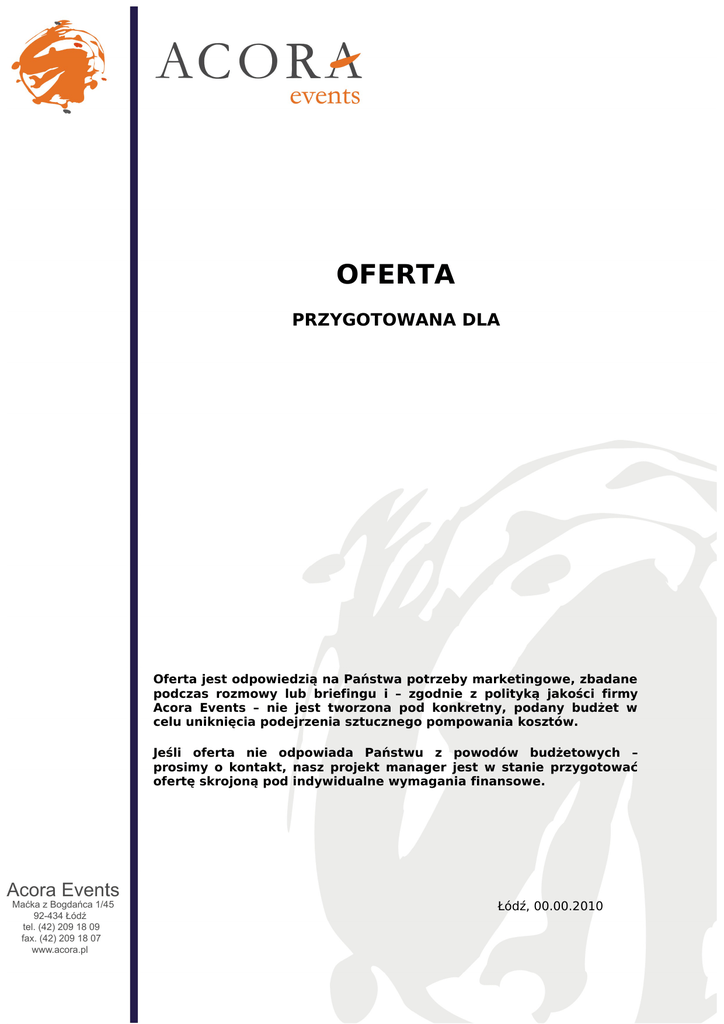 OFERTA PRZYGOTOWANA DLA Oferta jest odpowiedzią na Państwa potrzeby marketingowe, zbadane podczas rozmowy lub briefingu i – zgodnie z polityką jakości firmy Acora Events – nie jest tworzona pod konkretny, podany budżet w celu uniknięcia podejrzenia sztucznego pompowania kosztów. Jeśli oferta nie odpowiada Państwu z powodów budżetowych – prosimy o kontakt, nasz projekt manager jest w stanie przygotować ofertę skrojoną pod indywidualne wymagania finansowe. Łódź, 00.00.2010 Wschód Bliski i Daleki Proponujemy Państwu podróż w klimaty dalekowschodnie spotkanie z kulturą, muzyką i obyczajami. Subtelne dźwięki muzyki, sushi wraz a nauką jedzenia pałeczkami, sake podawane w kamionkowych naczyniach pozwolą Państwu przeżyć niezapomniane chwile relaksu oraz wytchnienia. Przygotowaliśmy również atrakcję w postaci pokazu Chińskich sztuk walki, opcjonalnie tańca chińskiego i wyjątkowo spektakularnego Teatru Ognia. Klimat wieczoru Aby przenieść Państwa w klimat dalekowschodni podeprzemy się odpowiednią scenografią. Białe szarfy z chińskimi napisami, świece, drzewka bonsai, chiński smok oraz zapach kadzideł spowodują, że poczujecie się Państwo jak rodowici Azjaci. Atrakcje Uczta zmysłów - sushi i sake Pokaz chińskich sztuki walki Konkurs - Pokaż co potrafisz Zabawa z DJ i karaoke (jako najpopularniejsza atrakcja chińskich pubów) Upominek Na pamiątkę wieczoru mamy dla wszystkich gości chiński upominek w postaci ozdobnych bambusowych pałeczek. Opcja dodatkowa Teatr Ognia Jako jedną z atrakcji wieczoru proponujemy artystyczny taniec ognia w wykonaniu profesjonalnej grupy tańca. Koszt występu 3 800,00 PLN. Chiński pokaz Tańca koszt występu 3 000,00 PNL Oprawa wieczoru – 8 998,00 PLN wraz ze zdjęciami na płytach CD przy założeniu 50 osób). Hippisowskie wariacje Przyjmijcie Państwo zaproszenie wyprawę do przeszłość. Przełom lat 60 i 70 to czas kolorowej i niepokornej hippisowskiej młodzieży zwanej Dzieci Kwiaty. Inspirowani tą rewolucją pragniemy zaproponować wieczorną imprezę, na którą każdy gości otrzyma symboliczne przebranie. Stworzymy miejsce gdzie współcześni Hippisi, będą uczestniczyli w konkursach i bawili się przy muzyce lat 60 i 70. Klimat wieczoru Musi być kolorowo i radośnie. Uzyskamy to poprzez kwiaty, kolorowe szarfy, hasła wypisane na tkaninach, ogromne pacyfki. Rozstawimy namiot z trawką oraz postawimy styropianowego legendarnego Volswagenena zwanego potocznie „ogórkiem”. Dodatkowy zapach kadzidełek wprowadzi nas w klimat tamtych czasów. Atrakcje „Kwiatki” wieczoru – konkurs na najciekawsze stroje Quiz o Hippisach Dzieci Kwiaty wokalnie – układanie wierszyków wraz z wykonaniem wokalnym Zabawa z DJ przy muzyce lat 60/70 Opcja dodatkowa Występ The Postman - zespołu śpiewającego przeboje legendarnego The Beatles. Koszt występu 4 500,00 PLN Oprawa wieczoru - 8 694,00 PLN (wraz ze zdjęciami na płytach CD przy założeniu 50 osób). Hawajskie Luau Zapraszamy Państwa na typowe hawajskie przyjęcie luau na poduchach przy niskich stolikach. Będzie kolorowo, kwiatowo, egzotycznie, radośnie i nieformalnie. W programie przewidziana, pokazy tańca HULA, nauka i pokazy pieśni tradycyjnych i współczesnych, drinki hawajskie - pokazy flair Elementy programu zapewnią nam świetna zabawę oraz poznawanie nowych kultur i zabaw. Klimat wieczoru Scenografia przeniesie nas na Hawaje dzięki nietypowym nakryciom, egzotycznym owocom, pięknym kwiecistym lampionom oraz kącikowi relaksacji typowo w klimacie luau. Zaaranżowana przestrzeń dla nieformalnego wypoczynku – typowo w klimacie hawajskiego przyjęcia – na podłodze przygotowany stos kolorowych poduszek do siedzenia, niskie stoliki koktajlowe. Atrakcje Pokaz i nauka tańca hula Hawajskie konkursy Pokaz flair i hawajskie drinki (pokaz żonglerki barmańskiej w wykonaniu 4 kobiet) Zabawa z DJ (muzyka dobrana odpowiednio do wieczoru) Opcja dodatkowa Koncert w stylu iście hawajskim (w tym nauka śpiewu tradycyjnych pieśni (oli) i współczesnych pieśni (mele). Koszt występu 3,000,00PLN. Oprawa wieczoru -10 449, 00 PLN (wraz ze zdjęciami na płytach CD przy założeniu 50 osób). Żydowska tawerna Zapraszamy Państwa na spotkanie nieznanej, choć tak nam bliskiej kultury żydowskiej. Zaczniemy od poznania hebrajskiej kaligrafii, następnie wyrazimy naszą radość poprzez taniec poprowadzony przez zespół Snunit. Gdy zaspokoimy głód ducha, proponujemy, coś dla ciała - kuchnię żydowską z jej słodkimi tajemnicami. Klimat wieczoru Scenografia przeniesie nas w klimat tawerny żydowskiej. Wielka gwiazda, siedmioramienne świeczniki z płonącymi świecami, synagoga, na ścianach podobizny starszyzny żydowskiej, stoliczki nakryte koronkowymi serwetami. Atrakcje Tajniki hebrajskiej kaligrafii Pokaz tańca Izraelskiego „Snunit” (z nauką) Kuchnia żydowska – słodkie sekrety Konkursy – napisz swoje imię po hebrajsku, wyraź siebie tańcem, tp. Zabawa z DJ i zespołem Snunit (muzyka żydowska). Opcja dodatkowa Koncert zespołu klezmerskiego RZESZÓW KLEZMER BAND. Muzyka którą grają momentami porywa do tańca, kusząc zmysłowymi nastrojami, innym razem wzrusza rzewnymi brzmieniami. Koszt występu 4 200,00 PLN. Występ Chóru Żydowskiego z koncertami o tematyce: Święta Żydowskie Szabat – najważniejsze święto żydowskie Historia Narodu Żydowskiego w piosence Koncert prowadzony przez konferansjera chóru. W czasie koncertu mogą odbyć się warsztaty piosenek żydowskich dla publiczności (nauka śpiewania 2-3 piosenek). Koszt występu 8 000,00 PLN. Oprawa wieczoru – 10 449,00 PLN (wraz ze zdjęciami na płytach CD przy założeniu 50 osób). Paryskie Moulin Rouge Proponujemy Państwu podróż do Paryża początku XX wieku, który urzeknie Was nieśmiertelnym kankanem, namiętnym Tango, zaczaruje paradą piór w rytmie samby, oraz pokazem Chicago. Na koniec profesjonalny sommelier zabierze Państ