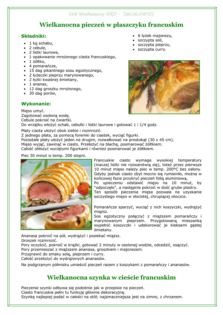 Stół Wielkanocny 2007 – ŚMIAŁOWICE Wielkanocna pieczeń w płaszczyku francuskim Składniki: • • • • • • • • • • • • 1 kg schabu, 2 cebule, 2 listki laurowe, 1 opakowanie mrożonego ciasta francuskiego, 1 żółtko, 4 pomarańcze, 15 dag pikantnego sosu egzotycznego, 2 łyżeczki pieprzu marynowanego, 2 łyżki kwaśnej śmietany, 1 ananas, 12 dag groszku mrożonego, 30 dag porów, • • • • 6 łyżek majonezu, szczypta soli, szczypta pieprzu, szczypta curry. Wykonanie: Mięso umyć. Zagotować osoloną wodę. Cebule pokroić na ćwiartki. Do wrzątku włożyć schab, cebulki i listki laurowe i gotować 1 i 1/4 godz. Płaty ciasta ułożyć obok siebie i rozmrozić. Z jednego płata, za pomocą foremki do ciastek, wyciąć figurki. Pozostałe płaty ułożyć jeden na drugim, rozwałkować na prostokąt (30 x 45 cm). Mięso wyjąć, zawinąć w ciasto. Przełożyć na blachę, posmarować żółtkiem. Całość obłożyć wyciętymi figurkami i również posmarować je żółtkiem. Piec 30 minut w temp. 200 stopni. Francuskie ciasto wymaga wysokiej temperatury (inaczej listki nie rozwarstwią się), toteż przez pierwsze 10 minut mięso należy piec w temp. 200°C bez osłony. Gdyby jednak ciasto zbyt mocno się rumieniło, można w końcowej fazie przykryć pieczeń folią aluminiową. Po upieczeniu odstawić mięso na 10 minut, by "odpoczęło", a następnie pokroić w dość grube plastry. Ten sposób pieczenia mięsa pozwala na uzyskanie soczystego mięso w złocistej, chrupiącej otoczce. Pomarańcze sparzyć, wyciąć z nich koszyczki, wydrążyć miąższ. Sos egzotyczny połączyć z miąższem pomarańczy i marynowanym pieprzem. Przygotowaną mieszanką wypełnić koszyczki i udekorować je kleksami gęstej śmietany. Ananasa pokroić na pół, wydrążyć i posiekać miąższ. Groszek rozmrozić. Pory oczyścić, pokroić w krążki, gotować 2 minuty w osolonej wodzie, odcedzić, osączyć. Pory przemieszać z miąższem ananasa, groszkiem i majonezem. Przyprawić do smaku solą, pieprzem i curry. Całość przełożyć do wydrążonych ananasów. Na podgrzanym półmisku umieścić pieczeń razem z koszykami z pomarańczy i ananasów. Wielkanocna szynka w cieście francuskim Pieczenie szynki odbywa się podobnie jak w przepisie na pieczeń. Ciasto francuskie pełni tu funkcję głównie dekoracyjną. Szynkę najlepiej podać w całości na stół; najsmaczniejsza jest na zimno, z chrzanem.