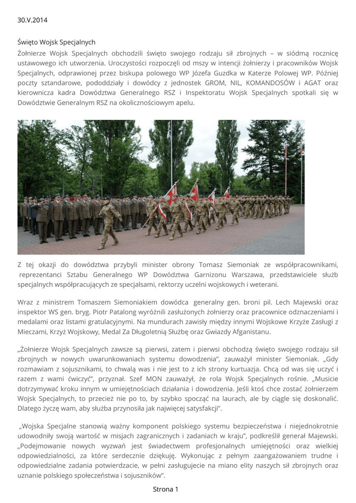30.V.2014 Święto Wojsk Specjalnych Żołnierze Wojsk Specjalnych obchodzili święto swojego rodzaju sił zbrojnych – w siódmą rocznicę ustawowego ich utworzenia. Uroczystości rozpoczęli od mszy w intencji żołnierzy i pracowników Wojsk Specjalnych, odprawionej przez biskupa polowego WP Józefa Guzdka w Katerze Polowej WP. Później poczty sztandarowe, pododdziały i dowódcy z jednostek GROM, NIL, KOMANDOSÓW i AGAT oraz kierownicza kadra Dowództwa Generalnego RSZ i Inspektoratu Wojsk Specjalnych spotkali się w Dowództwie Generalnym RSZ na okolicznościowym apelu. Z tej okazji do dowództwa przybyli minister obrony Tomasz Siemoniak ze współpracownikami, reprezentanci Sztabu Generalnego WP Dowództwa Garnizonu Warszawa, przedstawiciele służb specjalnych współpracujących ze specjalsami, rektorzy uczelni wojskowych i weterani. Wraz z ministrem Tomaszem Siemoniakiem dowódca generalny gen. broni pil. Lech Majewski oraz inspektor WS gen. bryg. Piotr Patalong wyróżnili zasłużonych żołnierzy oraz pracownice odznaczeniami i medalami oraz listami gratulacyjnymi. Na mundurach zawisły między innymi Wojskowe Krzyże Zasługi z Mieczami, Krzyż Wojskowy, Medal Za Długoletnią Służbę oraz Gwiazdy Afganistanu. „Żołnierze Wojsk Specjalnych zawsze są pierwsi, zatem i pierwsi obchodzą święto swojego rodzaju sił zbrojnych w nowych uwarunkowaniach systemu dowodzenia”, zauważył minister Siemoniak. „Gdy rozmawiam z sojusznikami, to chwalą was i nie jest to z ich strony kurtuazja. Chcą od was się uczyć i razem z wami ćwiczyć”, przyznał. Szef MON zauważył, że rola Wojsk Specjalnych rośnie. „Musicie dotrzymywać kroku innym w umiejętnościach działania i dowodzenia. Jeśli ktoś chce zostać żołnierzem Wojsk Specjalnych, to przecież nie po to, by szybko spocząć na laurach, ale by ciągle się doskonalić. Dlatego życzę wam, aby służba przynosiła jak najwięcej satysfakcji”. „Wojska Specjalne stanowią ważny komponent polskiego systemu bezpieczeństwa i niejednokrotnie udowodniły swoją wartość w misjach zagranicznych i zadaniach w kraju”, podkreślił generał Majewski. „Podejmowanie nowych wyzwań jest świadectwem profesjonalnych umiejętności oraz wielkiej odpowiedzialności, za które serdecznie dziękuję. Wykonując z pełnym zaangażowaniem trudne i odpowiedzialne zadania potwierdzacie, w pełni zasługujecie na miano elity naszych sił zbrojnych oraz uznanie polskiego społeczeństwa i sojuszników”. Strona 1 Po zbiórce goście wysłuchali wykładu generała Patalonga o Wojskach Specjalnych oraz wstępu dzieci z teatru tańca w Klubu Jednostki Wojskowej w Lublińcu(nawiązującego do 70 rocznicy Powstania Warszawskiego oraz tradycji jednostek specjalnych) i recitalu piosenkarki Alicji Majewskiej. Następnie uczestnicy świątecznych uroczystości spotkali się w ogrodzie DGRSZ na poczęstunku. Specjalsi urządzili też wystawę nowoczesnego uzbrojenia i lekkiego sprzętu. ppłk Artur Goławski Zdjęcia Mirosław C. Wójtowicz Strona 2