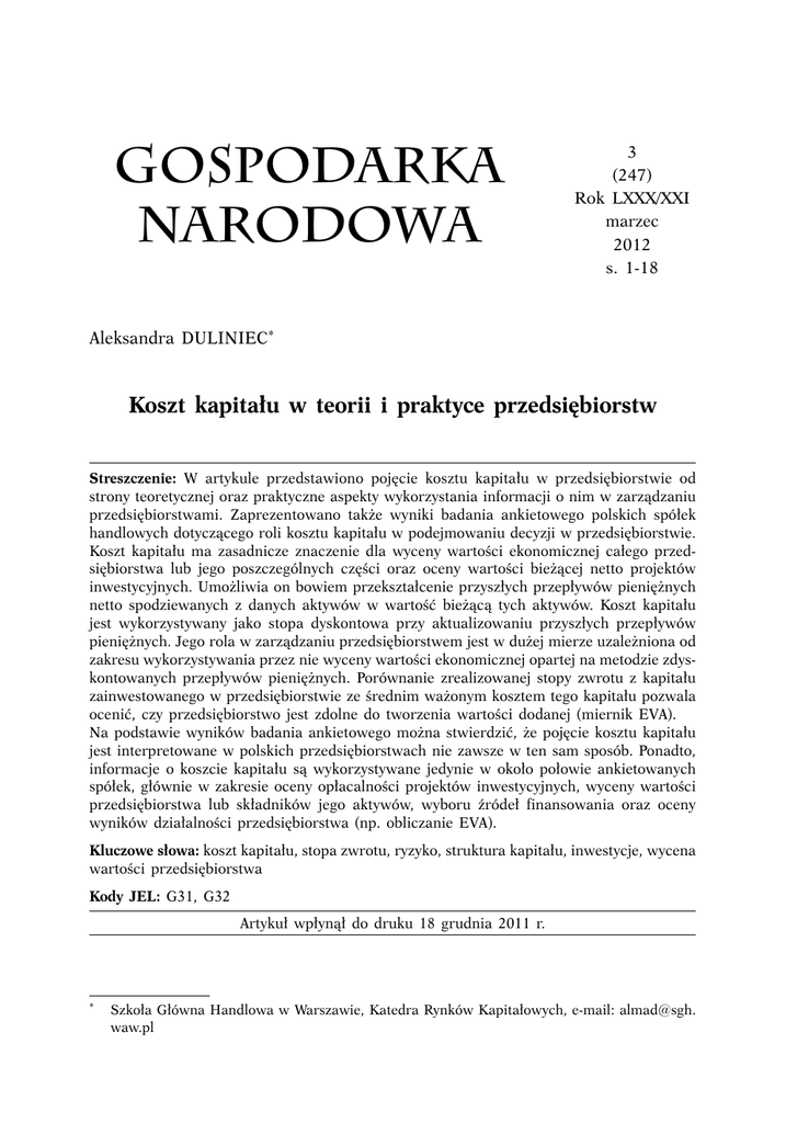 GOSPODARKA NARODOWA 3 (247) Rok LXXX/XXI marzec 2012 s. 1-18 Aleksandra DULINIEC* Koszt kapitału w teorii i praktyce przedsiębiorstw Streszczenie: W artykule przedstawiono pojęcie kosztu kapitału w przedsiębiorstwie od strony teoretycznej oraz praktyczne aspekty wykorzystania informacji o nim w zarządzaniu przedsiębiorstwami. Zaprezentowano także wyniki badania ankietowego polskich spółek handlowych dotyczącego roli kosztu kapitału w podejmowaniu decyzji w przedsiębiorstwie. Koszt kapitału ma zasadnicze znaczenie dla wyceny wartości ekonomicznej całego przedsiębiorstwa lub jego poszczególnych części oraz oceny wartości bieżącej netto projektów inwestycyjnych. Umożliwia on bowiem przekształcenie przyszłych przepływów pieniężnych netto spodziewanych z danych aktywów w wartość bieżącą tych aktywów. Koszt kapitału jest wykorzystywany jako stopa dyskontowa przy aktualizowaniu przyszłych przepływów pieniężnych. Jego rola w zarządzaniu przedsiębiorstwem jest w dużej mierze uzależniona od zakresu wykorzystywania przez nie wyceny wartości ekonomicznej opartej na metodzie zdyskontowanych przepływów pieniężnych. Porównanie zrealizowanej stopy zwrotu z kapitału zainwestowanego w przedsiębiorstwie ze średnim ważonym kosztem tego kapitału pozwala ocenić, czy przedsiębiorstwo jest zdolne do tworzenia wartości dodanej (miernik EVA). Na podstawie wyników badania ankietowego można stwierdzić, że pojęcie kosztu kapitału jest interpretowane w polskich przedsiębiorstwach nie zawsze w ten sam sposób. Ponadto, informacje o koszcie kapitału są wykorzystywane jedynie w około połowie ankietowanych spółek, głównie w zakresie oceny opłacalności projektów inwestycyjnych, wyceny wartości przedsiębiorstwa lub składników jego aktywów, wyboru źródeł finansowania oraz oceny wyników działalności przedsiębiorstwa (np. obliczanie EVA). Kluczowe słowa: koszt kapitału, stopa zwrotu, ryzyko, struktura kapitału, inwestycje, wycena wartości przedsiębiorstwa Kody JEL: G31, G32 Artykuł wpłynął do druku 18 grudnia 2011 r. * Szkoła Główna Handlowa w Warszawie, Katedra Rynków Kapitałowych, e-mail: almad@sgh. waw.pl 2 GOSPODARKA NARODOWA Nr 3/2012 Wprowadzenie Artykuł jest poświęcony problematyce kosztu kapitału (aspekty teoretyczne) ujętej z różnych punktów widzenia, w szczególności w kontekście zapotrzebowania na informacje o koszcie kapitału w procesie podejmowania decyzji w przedsiębiorstwie (aspekty praktyczne). Głównym celem artykułu jest zidentyfikowanie tych obszarów decyzyjnych w przedsiębiorstwie, w których istotnym czynnikiem wpływającym na podejmowane decyzje jest poziom kosztu kapitału. Podjęcie decyzji, w szczególności decyzji o charakterze finansowym, wymaga przeprowadzenia rozmaitych analiz i ocen, w ramach których informacja o kształtowaniu kosztu kapitału ma kluczowe znaczenie. Punktem wyjścia do realizacji założonego celu jest scharakteryzowanie samego pojęcia kosztu kapitału oraz wpływu kosztu kapitału na kształtowanie się wartości bieżącej przyszłych przepływów pieniężnych w ujęciu modelowym. Podsumowaniem rozważań zawartych w artykule jest analiza wyników badań ankietowych na temat zakresu wykorzystania informacji o koszcie kapitału w polskich przedsiębiorstwach. Kształtowanie się kosztu kapitału ma zasadniczy wpływ na decyzje dotyczące pozyskiwania i inwestowania kapitału przez przedsiębiorstwo. Koszt kapitału odgrywa też istotną rolę w procesie wyceny wartości zainwestowanego kapitału, jest bowiem kluczowym ogniwem umożliwiającym przekształcenie strumienia przyszłych oczekiwanych dochodów netto w wartość bieżącą (present value) podejmowanych projektów inwestycyjnych czy też całego przedsiębiorstwa. Rentowność realizowanych przez przedsiębiorstwo inwestycji powinna przekraczać koszt kapitału inwestowanego w te przedsięwzięcia, gdyż jest to warunkiem tworzenia przez przedsiębiorstwo wartości dodanej1. Współczesne finanse przedsiębiorstw koncentrują się na maksymalizowaniu wartości rynkowej przedsiębiorstwa i korzyści jego właścicieli z zainwestowanego kapitału. Tak sformułowane cele działalności przedsiębiorstw wyznaczają jednocześnie kryterium optymalizacji wielkości i struktury kapitału przedsiębiorstwa. Pojęcie kosztu kapitału jest nierozerwalnie związane z pojęciem wartości kapitału, rozumianej jako źródło przyszłych dochodów, które zdyskontowane i zsumowane pozwalają wycenić tę wartość (por. m.in. [Fisher, 1954, s. 12], [Trąmpczyński, 1937, s. 105]). Koszt kapitału w tym kontekście jest stopą dyskontową (stopą zwrotu), przy której suma przyszłych oczekiwanych dochodów netto wypracowanych z kapitału zrówna się z bieżącą wartością tego kapitału. Ceną (kosztem) kapitału, który przepływa od podmiotu inwestującego (dawcy kapitału, inwestora) do podmiotu pozyskującego kapitał (np. do przedsiębiorstwa) jest stopa procentowa. Stanowi ona wynagrodzenie dla inwestującego za udostępnienie kapitału, jest oczekiwaną stopą dochodu z inwestycji. Biorąc pod 1 Szerzej o roli kosztu kapitału w koncepcji ekonomicznej wartości dodanej będzie mowa w dalszej części artykułu. Aleksandra Duliniec, Koszt kapitału w teorii i praktyce przedsiębiorstw 3 uwagę najbardziej ogólną definicję inwestycji jako „wyrzeczenia się bieżącej konsumpcji na rzecz przyszłych i niepewnych korzyści” [Jajuga, 2007, s. 13 i 65], stopa procentowa jako cena zainwestowanego kapitału uwzględnia obie podstawowe cechy inwestycji, tj.: • upływ czasu pomiędzy dokonaniem inwestycji a uzyskaniem dochodu z inwestycji, co wiąże się z koncepcją zmiany wartości pieniądza w czasie (time value of money); • ryzyko inwestycji, gdyż przyszłe korzyści są niepewne zarówno pod względem wielkości, jak i momentu, w którym będą dostępne dla inwestora. Koszt kapitału możn