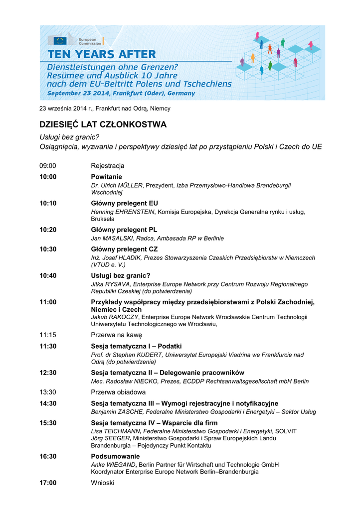 23 września 2014 r., Frankfurt nad Odrą, Niemcy DZIESIĘĆ LAT CZŁONKOSTWA Usługi bez granic? Osiągnięcia, wyzwania i perspektywy dziesięć lat po przystąpieniu Polski i Czech do UE 09:00 Rejestracja 10:00 Powitanie Dr. Ulrich MÜLLER, Prezydent, Izba Przemysłowo-Handlowa Brandeburgii Wschodniej 10:10 Główny prelegent EU Henning EHRENSTEIN, Komisja Europejska, Dyrekcja Generalna rynku i usług, Bruksela 10:20 Główny prelegent PL Jan MASALSKI, Radca, Ambasada RP w Berlinie 10:30 Główny prelegent CZ Inż. Josef HLADIK, Prezes Stowarzyszenia Czeskich Przedsiębiorstw w Niemczech (VTUD e. V.) 10:40 Usługi bez granic? Jitka RYSAVA, Enterprise Europe Network przy Centrum Rozwoju Regionalnego Republiki Czeskiej (do potwierdzenia) 11:00 Przykłady współpracy między przedsiębiorstwami z Polski Zachodniej, Niemiec i Czech Jakub RAKOCZY, Enterprise Europe Network Wrocławskie Centrum Technologii Uniwersytetu Technologicznego we Wrocławiu, 11:15 Przerwa na kawę 11:30 Sesja tematyczna I – Podatki Prof. dr Stephan KUDERT, Uniwersytet Europejski Viadrina we Frankfurcie nad Odrą (do potwierdzenia) 12:30 Sesja tematyczna II – Delegowanie pracowników Mec. Radosław NIECKO, Prezes, ECDDP Rechtsanwaltsgesellschaft mbH Berlin 13:30 Przerwa obiadowa 14:30 Sesja tematyczna III – Wymogi rejestracyjne i notyfikacyjne Benjamin ZASCHE, Federalne Ministerstwo Gospodarki i Energetyki – Sektor Usług 15:30 Sesja tematyczna IV – Wsparcie dla firm Lisa TEICHMANN, Federalne Ministerstwo Gospodarki i Energetyki, SOLVIT Jörg SEEGER, Ministerstwo Gospodarki i Spraw Europejskich Landu Brandenburgia – Pojedynczy Punkt Kontaktu 16:30 Podsumowanie Anke WIEGAND, Berlin Partner für Wirtschaft und Technologie GmbH Koordynator Enterprise Europe Network Berlin–Brandenburgia 17:00 Wnioski
