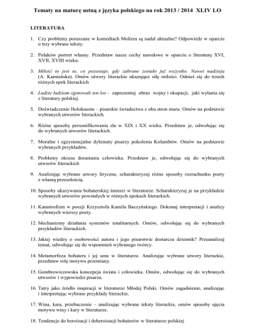 Tematy na maturę ustną z języka polskiego na rok 2013 / 2014 XLIV LO LITERATURA 1. Czy problemy poruszane w komediach Moliera są nadal aktualne? Odpowiedz w oparciu o trzy wybrane teksty. 2. Polaków portret własny. Przedstaw nasze cechy narodowe w oparciu o literaturę XVI, XVII, XVIII wieku. 3. Miłość to jest to, co pozostaje, gdy zabrane zostało już wszystko. Nawet nadzieja (A. Kamieńska). Omów utwory literackie ukazujące siłę miłości. Odnieś się do trzech różnych epok literackich 4. Ludzie ludziom zgotowali ten los - zaprezentuj obraz wojny i okupacji, jaki wyłania się z literatury polskiej. 5. Doświadczenie Holokaustu – pisarskie świadectwa z obu stron muru. Omów na podstawie wybranych utworów literackich. 6. Różne sposoby personifikowania zła w XIX i XX wieku. Przedstaw je, odwołując się do wybranych utworów literackich. 7. Moralne i egzystencjalne dylematy pisarzy pokolenia Kolumbów. Omów na podstawie wybranych przykładów. 8. Problemy okresu dorastania człowieka. Przedstaw je, odwołując się do wybranych utworów literackich 9. Analizując wybrane utwory liryczne, scharakteryzuj różne sposoby rozrachunku poety z własną przeszłością. 10. Sposoby ukazywania bohaterskiej śmierci w literaturze. Scharakteryzuj je na przykładzie wybranych utworów powstałych w różnych epokach literackich. 11. Katastrofizm w poezji Krzysztofa Kamila Baczyńskiego. Dokonaj interpretacji i analizy wybranych wierszy poety. 12. Mechanizmy działania systemów totalitarnych. Omów, odwołując się do wybranych przykładów literackich. 13. Jakiej wiedzy o osobowości autora i jego pisarstwie dostarcza dziennik? Przeanalizuj temat, odwołując się do wspomnień wybranego twórcy. 14. Metamorfoza bohatera i jej sens w literaturze. Analizując wybrane utwory literackie, przedstaw rolę motywu przemiany. 15. Gombrowiczowska koncepcja świata i człowieka. Omów, odwołując się do wybranych utworów i wypowiedzi pisarza. 16. Tatry jako źródło inspiracji w literaturze Młodej Polski. Omów zagadnienie, analizując i interpretując wybrane przykłady literackie. 17. Wina, kara, przebaczenie – analizując wybrane teksty literackie, omów sposoby ujęcia motywu winy i kary w literaturze. 18. Tendencje do heroizacji i deheroizacji bohaterów w literaturze polskiej 19. Obraz uzależnionych w literaturze XIX i XX w. Przedstaw zagadnienie na podstawie wybranych utworów. 20. „Władza – zaszczyt, zobowiązanie, siła niszcząca” – wizerunki władców i sposoby sprawowania władzy. Przeanalizuj temat w kontekście wybranych utworów z różnych epok. 21. Motyw przemijania w literaturze staropolskiej. Omów temat odwołując się do wybranych utworów. 22. Nowe koncepcje bohatera międzywojennej prozy psychologicznej. zagadnienie, powołując się na utwory literatury polskiej i obcej. Przedstaw 23. Portrety samotnych kobiet w literaturze. Omów temat w oparciu o przykłady z różnych epok. 24. Wykluczeni ze świata: obcy, inny, outsider, szaleniec, więzień. Omów temat, odwołując się do wybranych przykładów literackich. 25. Przeanalizuj dosłowne i metaforyczne funkcjonowanie motywu jesieni w wybranych utworach literackich 26. Funkcje odwołań do postaci i symboli antycznych w poezji. Rozważ temat na wybranych przykładach. 27. Istota dialogu twórców literatury z filozofami. Przedstaw problem na wybranych przykładach dzieł literatury dawnej bądź współczesnej. 28. Czy podzielasz zdanie C. K. Norwida: „Czytanie więc sztuką jest”? Przedstaw swoje doświadczenia czytelnicze, przywołując ważne dla ciebie utwory. 29. Modni pisarze, modne książki. Omów na przykładach spoza kanonu lektur szkolnych przyczyny popularności niektórych autorów i książek. Związki literatury z innymi dziedzinami sztuki 1. Ziemia obiecana czy ziemia przeklęta? Przedstaw obraz Łodzi w literaturze i filmie. 2. Nobilitacja brzydoty do rangi kategorii estetycznej. Omów zagadnienie na wybranych przykładach z literatury i sztuki. 3. Czy zemsta może być sensem istnienia? Uzasadnij swoje zdanie, odwołując się do przykładów z literatury i filmu. 4. Negatywny bohater, czarny charakter. Ukaż sposób i cel kreowania takich postaci w wybranych dziełach literackich i filmowych. 5. Odwołując się do wybranych przykładów z literatury i malarstwa, przedstaw i porównaj różne sposoby przedstawiania lęku w dziele sztuki. 6. Kobiety święte i demoniczne. Na wybranych trzech przykładach przedstaw wielkie kreacje bohaterek literackich i filmowych. 7. Zjawiska paranormalne, surrealizm i oniryzm w literaturze i sztuce. Omów temat na podstawie trzech – czterech wybranych tekstów kultury. 8. Analizując wybrane dzieła, porównaj artystyczne interpretacje wybranego powstania narodowego w literaturze i malarstwie. 9. Syberia – polskie piekło. Analizując wybrane utwory, nie tylko literackie, przedstaw różne ujęcia tego zagadnienia. 10. Miasto – przestrzeń znacząca, miejsce destrukcji, szansa rozwoju. Zaprezentuj różne ujęcia motywu miasta w literaturze i filmie. 11. Kicz w literaturze i sztuce. Omów jego przejawy i funkcje. 12. Artysta jako bohater literacki i filmowy. Ukaż różne realizacje tego motywu. 13. Poza dobrem i złem – bohaterowie niejednoznaczni. Zanalizuj temat, odnosząc się do literatury i sztuki. 14. Porównaj funkcje motywu „maski (masek)” w wybranych dziełach literackich, malarskich, filmowych. 15. Obłęd i szaleństwo jako element osobowości postaci. Przedstaw zagadnienie, odwołując się do wybranych przykładów literackich i filmowych. 16. Katastrofizm w literaturze, malarstwie i filmie – omów problem na podstawie przykładów sztuki współczesnej. 17. Każde głębsze uczucie prowadzi do cierpienia. Miłość bez cierpienia nie jest miłością.ks. J. Twardowski. Przedstaw obraz nieszczęśliwej miłości w wybranych utworach literackich i muzycznych. 18. Nie jestem z tych dusz szczęśliwych, co 