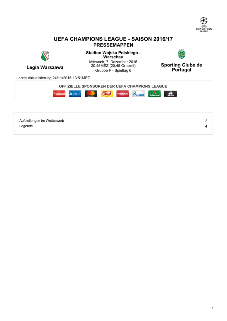 UEFA CHAMPIONS LEAGUE - SAISON 2016/17 PRESSEMAPPEN Stadion Wojska Polskiego Warschau Legia Warszawa Mittwoch, 7. Dezember 2016 20.45MEZ (20.45 Ortszeit) Gruppe F - Spieltag 6 Sporting Clube de Portugal Letzte Aktualisierung 24/11/2016 13:51MEZ OFFIZIELLE SPONSOREN DER UEFA CHAMPIONS LEAGUE Aufstellungen im Wettbewerb 2 Legende 4 1 Legia Warszawa - Sporting Clube de Portugal Mittwoch 7 Dezember 2016 - 20.45CET (20.45 Ortszeit) Pressemappe Stadion Wojska Polskiego, Warschau Aufstellungen im Wettbewerb Legia Warszawa UEFA Champions League - Zweite Qualifikationsrunde (12/07/2016) HŠK Zrinjski 1-1 Legia Warszawa Tore: 0-1 Nikolić 49, 1-1 Katanec 57 Legia Warszawa: Malarz (46 Cierzniak), Jodłowiec, Lewczuk, Guilherme, Duda (60 Alexandrov), Nikolić (76 Prijovic), Hloušek, Kucharczyk, Rzeźniczak, Broź, Moulin (19/07/2016) Legia Warszawa 2-0 HŠK Zrinjski (ges: 3-1) Tore: 1-0 Nikolić 28 (E) , 2-0 Nikolić 62 Legia Warszawa: Malarz, Pazdan, Jodłowiec, Lewczuk, Guilherme (15 Hämäläinen), Nikolić (75 Kopczyński), Hloušek, Kucharczyk (84 Brzyski), Broź, Moulin, Alexandrov Dritte Qualifikationsrunde (27/07/2016) FK AS Trenčín 0-1 Legia Warszawa Tore: 0-1 Nikolić 69 Legia Warszawa: Malarz, Pazdan, Jodłowiec (85 Hämäläinen), Lewczuk, Nikolić (75 Prijovic), Kopczyński, Brzyski, Kucharczyk, Bereszyński, Moulin, Alexandrov (89 Broź) (03/08/2016) Legia Warszawa 0-0 FK AS Trenčín (ges: 1-0) Legia Warszawa: Malarz, Pazdan, Jodłowiec, Lewczuk, Langil (69 Alexandrov), Nikolić (78 Prijovic), Hloušek, Kopczyński, Kucharczyk, Bereszyński (56 Broź), Moulin Play-offs (17/08/2016) Dundalk FC 0-2 Legia Warszawa Tore: 0-1 Nikolić 56 (E) , 0-2 Prijovic 90+4 Legia Warszawa: Malarz, Pazdan, Jodłowiec, Lewczuk, Langil (88 Alexandrov), Odjidja (76 Kopczyński), Nikolić (83 Prijovic), Hloušek, Kucharczyk, Broź, Moulin (23/08/2016) Legia Warszawa 1-1 Dundalk FC (ges: 3-1) Tore: 0-1 Benson 19, 1-1 Kucharczyk 90+2 Legia Warszawa: Malarz, Pazdan, Jodłowiec, Lewczuk, Langil (65 Guilherme), Odjidja, Nikolić (71 Bereszyński), Hloušek, Kucharczyk, Broź, Moulin (93 Prijovic) Gruppenphase Gruppe F Verein Sp. S U N ET KT Pkt. Borussia Dortmund 5 4 1 0 19 7 13 Real Madrid CF 5 3 2 0 14 8 11 Sporting Clube de Portugal 5 1 0 4 5 7 3 Legia Warszawa 5 0 1 4 8 24 1 Spieltag 1 (14/09/2016) Legia Warszawa 0-6 Borussia Dortmund Tore: 0-1 Götze 7, 0-2 Papastathopoulos 15, 0-3 Bartra 17, 0-4 Raphaël Guerreiro 51, 0-5 Castro 76, 0-6 Aubameyang 87 Legia Warszawa: Malarz, Jodłowiec, Czerwiński, Dąbrowski, Guilherme, Langil, Odjidja, Kazaishvili (66 Alexandrov), Bereszyński, Moulin (76 Radović), Prijovic (63 Nikolić) 2 Legia Warszawa - Sporting Clube de Portugal Pressemappe Mittwoch 7 Dezember 2016 - 20.45CET (20.45 Ortszeit) Stadion Wojska Polskiego, Warschau Spieltag 2 (27/09/2016) Sporting Clube de Portugal 2-0 Legia Warszawa Tore: 1-0 Ruiz 28, 2-0 Dost 37 Legia Warszawa: Malarz, Jodłowiec, Czerwiński, Guilherme, Langil (46 Alexandrov), Nikolić (60 Odjidja), Hloušek, Bereszyński, Rzeźniczak, Radović, Moulin (86 Kopczyński) Spieltag 3 (18/10/2016) Real Madrid CF 5-1 Legia Warszawa Tore: 1-0 Bale 16, 2-0 Jodłowiec 20 (ET) , 2-1 Radović 22 (E) , 3-1 Asensio 37, 4-1 Lucas Vázquez 68, 5-1 Morata 84 Legia Warszawa: Malarz, Jodłowiec, Czerwiński, Guilherme (74 Kazaishvili), Odjidja, Hloušek, Kucharczyk, Bereszyński, Rzeźniczak, Radović (74 Nikolić), Moulin (81 Kopczyński) Spieltag 4 (02/11/2016) Legia Warszawa 3-3 Real Madrid CF Tore: 0-1 Bale 1, 0-2 Benzema 35, 1-2 Odjidja 40, 2-2 Radović 58, 3-2 Moulin 83, 3-3 Kovačić 85 Legia Warszawa: Malarz, Pazdan, Guilherme, Odjidja (86 Jodłowiec), Nikolić (69 Kucharczyk), Hloušek, Kopczyński, Bereszyński, Rzeźniczak, Radović (77 Prijovic), Moulin Spieltag 5 (22/11/2016) Borussia Dortmund 8-4 Legia Warszawa Tore: 0-1 Prijovic 10, 1-1 Kagawa 17, 2-1 Kagawa 18, 3-1 Nuri Şahin 20, 3-2 Prijovic 24, 4-2 Dembélé 29, 5-2 Reus 32, 6-2 Reus 52, 6-3 Kucharczyk 57, 7-3 Passlack 81, 7-4 Nikolić 83, 8-4 Rzeźniczak 90+2 (ET) Legia Warszawa: Cierzniak, Pazdan, Czerwiński, Guilherme (55 Jodłowiec), Odjidja (75 Nikolić), Kopczyński, Kucharczyk, Bereszyński, Rzeźniczak, Radović, Prijovic (69 Wieteska) Spieltag 6 (07/12/2016) Legia Warszawa-Sporting Clube de Portugal Sporting Clube de Portugal UEFA Champions League - Gruppenphase Spieltag 1 (14/09/2016) Real Madrid CF 2-1 Sporting Clube de Portugal Tore: 0-1 Bruno César 48, 1-1 Ronaldo 89, 2-1 Morata 90+4 Sporting Clube de Portugal: Rui Patrício, Ruiz (92 Campbell), Bruno César, Coates, William Carvalho, João Pereira, Adrien Silva (73 Elías), Dost, Zeegelaar, Ruben Semedo, Gelson Martins (70 Marković) Spieltag 2 (27/09/2016) Sporting Clube de Portugal 2-0 Legia Warszawa Tore: 1-0 Ruiz 28, 2-0 Dost 37 Sporting Clube de Portugal: Rui Patrício, Jefferson, Ruiz (87 Petrović), Bruno César (67 Marković), Coates, William Carvalho, João Pereira, Adrien Silva, Dost, Ruben Semedo, Gelson Martins (76 Campbell) Spieltag 3 (18/10/2016) Sporting Clube de Portugal 1-2 Borussia Dortmund Tore: 0-1 Aubameyang 9, 0-2 Weigl 43, 1-2 Bruno César 67 Sporting Clube de Portugal: Rui Patrício, Schelotto, Marković (65 Campbell), Ruiz (79 André), Coates, William Carvalho, Elías (60 Bruno César), Dost, Zeegelaar, Ruben Semedo, Gelson Martins Spieltag 4 (02/11/2016) Borussia Dortmund 1-0 Sporting Clube de Portugal Tore: 1-0 Ramos 12 Sporting Clube de Portugal: Rui Patrício, Schelotto, Ruiz (78 Marković), Bruno César (58 Adrien Silva), Coates, William Carvalho, Paulo Oliveira, Castaignos (46 Dost), Zeegelaar, Ruben Semedo, Gelson Martins Spieltag 5 (22/11/2016) Sporting Clube de Portugal 1-2 Real Madrid CF Tore: 0-1 Varane 29, 1-1 Adrien Silva 80 (E) , 1-2 Benzema 87 Sporting Clube de Portugal: Rui Patrício, Ruiz (67 Schelotto), Bruno César (62 Campbell), Coates, William Carvalho, João Pereira, Adrien Silva, Dost (76 André), Zeegelaar, Ruben Semedo, Gelson Martins Spieltag 6 (07/12/2016) Legia W
