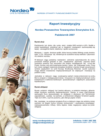 Raport Inwestycyjny Nordea Powszechne Towarzystwo Emerytalne S.A. Październik 2007 Rynek akcji Październik był dobry dla rynku akcji - indeks WIG wzrósł o 4.6%. Spółki o dużej kapitalizacji, podobnie jak w ostatnich miesiącach zachowywały się lepiej - szczególnie banki, telekomy i spółki surowcowe. Mniejsze i często droższe spółki, które tworzą indeks Midwig urosły średnio tylko o 2%. Utrzymuje się tendencja do szukania raczej wartości i płynności niż obietnic wzrostu. W dalszym ciągu jesteśmy nastawieni ostrożnie optymistycznie do rynku, ponieważ iniekcje gotówki w celu zwiększenia płynności poprzez banki centralne powinny być korzystne dla krajów rozwijających się, w tym dla Polski. Koniec roku jest tradycyjnie bardzo dobry dla krajowego rynku. Poza tym może nastąpić częściowy przepływ środków z bardzo drogo wycenianych rynków azjatyckich na rynki Europy Środkowej. Również wyniki wyborów mogą skłonić inwestorów międzynarodowych do większych inwestycji na polskim rynku. Jednakże w dalszym ciągu oczekujemy wahań i dużej zmienności na rynku. Ma to związek z malejącą płynnością i kryzysem na międzynarodowym rynku kredytowym w sektorze bankowym spowodowanym wątpliwymi pożyczkami hipotecznymi. Rynek obligacji Rynek polskich obligacji był bardzo aktywny w ostatnim miesiącu, głównie dzięki wynikom wyborów parlamentarnych. Opinia, iż nowy rząd szybciej wprowadzi Euro spowodowało, że obligacje o dłuższym niż 7 lat terminie zapadalności, zyskały na wartości, a rentowności obligacji 10-letnich spadły 16pb do 5.54%, czyli do poziomu, jaki oferuje papier 2-letni. Nie zważając na szybsze przyjęcie Euro w dalszym ciągu nie widzimy dużej wartości na długim końcu krzywej rentowności i zauważamy narastające niebezpieczeństwo inflacji, która będzie miała negatywny wpływ na rynek obligacji. Inwestycje alternatywne Nasza inwestycja w obligacje z ochroną kapitału i opcją na fundusz hedgingowy zanotowała w ostatnim miesiącu spadek 1%, ale zwrot od startu inwestycji w lipcu wynosi 1.2%. Wyniki Nasza pozycja w rankingu nie zmieniła się w ostatnim miesiącu. Zmniejszyliśmy ponownie liczbę spółek w naszym portfelu, dzięki czemu bardziej zrównoważyliśmy ryzyko, aby poprawić wyniki właśnie przy niskim ryzyku. Rynek jest w dalszym ciągu bardzo niepłynny w przypadku mniejszych spółek, ale nadal zamierzamy utrzymywać w portfelu docelowo do końca roku 70 spółek. Dodatkowo mamy zamiar inwestować w wybrane międzynarodowe spółki, aby uzyskać dodatkową stopę zwrotu. Raport przygotował Departament Inwestycji, e-mail: [email protected]
