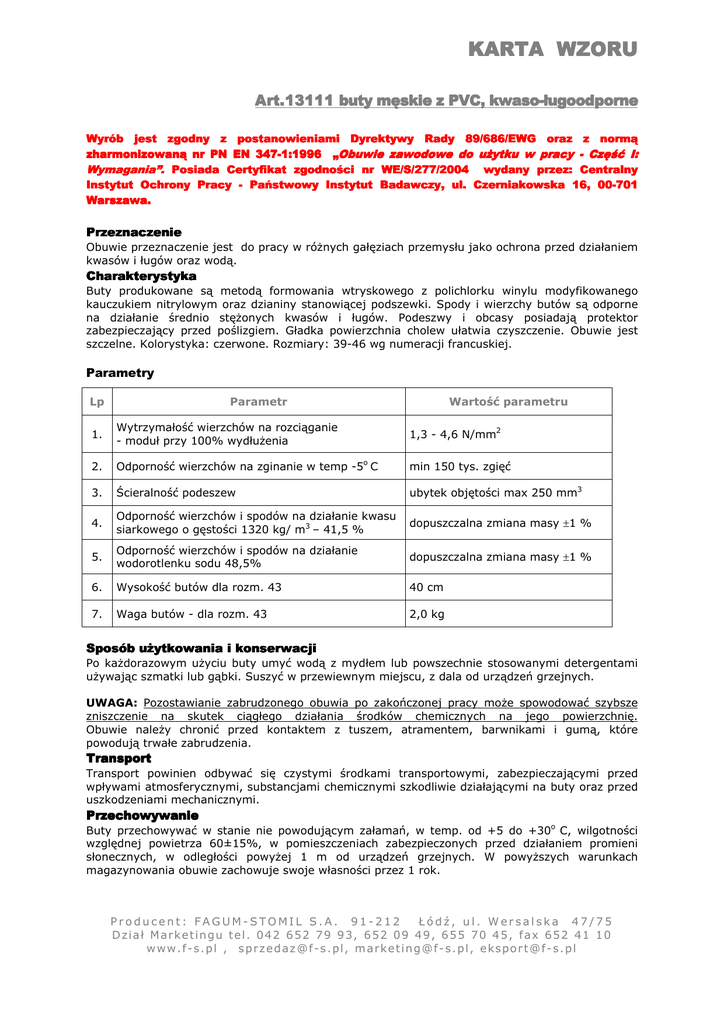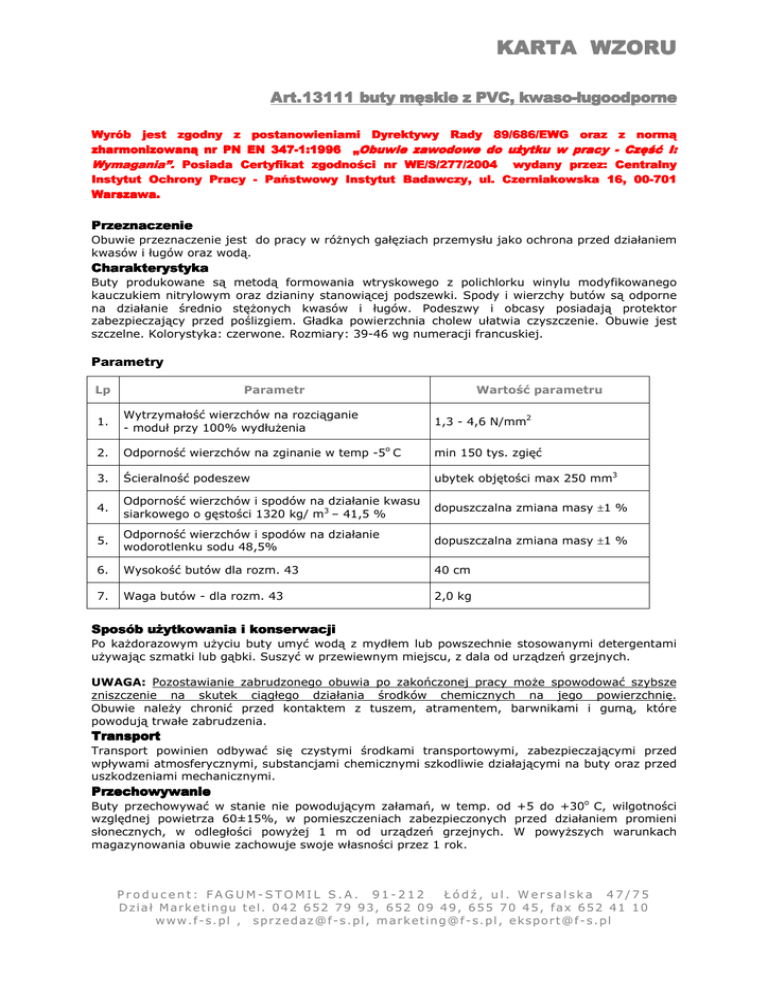 KARTA WZORU Art.13111 buty męskie z PVC, kwaso-ługoodporne Wyrób jest zgodny z postanowieniami Dyrektywy Rady 89/686/EWG oraz z normą zharmonizowaną nr PN EN 347-1:1996 „Obuwie zawodowe do użytku w pracy - Część I: Wymagania”. Posiada Certyfikat zgodności nr WE/S/277/2004 wydany przez: Centralny Instytut Ochrony Pracy - Państwowy Instytut Badawczy, ul. Czerniakowska 16, 00-701 Warszawa. Przeznaczenie Obuwie przeznaczenie jest do pracy w różnych gałęziach przemysłu jako ochrona przed działaniem kwasów i ługów oraz wodą. Charakterystyka Buty produkowane są metodą formowania wtryskowego z polichlorku winylu modyfikowanego kauczukiem nitrylowym oraz dzianiny stanowiącej podszewki. Spody i wierzchy butów są odporne na działanie średnio stężonych kwasów i ługów. Podeszwy i obcasy posiadają protektor zabezpieczający przed poślizgiem. Gładka powierzchnia cholew ułatwia czyszczenie. Obuwie jest szczelne. Kolorystyka: czerwone. Rozmiary: 39-46 wg numeracji francuskiej. Parametry Lp Parametr Wartość parametru 1. Wytrzymałość wierzchów na rozciąganie - moduł przy 100% wydłużenia 1,3 - 4,6 N/mm2 2. Odporność wierzchów na zginanie w temp -5o C min 150 tys. zgięć 3. Ścieralność podeszew ubytek objętości max 250 mm3 4. Odporność wierzchów i spodów na działanie kwasu siarkowego o gęstości 1320 kg/ m3 – 41,5 % dopuszczalna zmiana masy ±1 % 5. Odporność wierzchów i spodów na działanie wodorotlenku sodu 48,5% dopuszczalna zmiana masy ±1 % 6. Wysokość butów dla rozm. 43 40 cm 7. Waga butów - dla rozm. 43 2,0 kg Sposób użytkowania i konserwacji Po każdorazowym użyciu buty umyć wodą z mydłem lub powszechnie stosowanymi detergentami używając szmatki lub gąbki. Suszyć w przewiewnym miejscu, z dala od urządzeń grzejnych. UWAGA: Pozostawianie zabrudzonego obuwia po zakończonej pracy może spowodować szybsze zniszczenie na skutek ciągłego działania środków chemicznych na jego powierzchnię. Obuwie należy chronić przed kontaktem z tuszem, atramentem, barwnikami i gumą, które powodują trwałe zabrudzenia. Transport Transport powinien odbywać się czystymi środkami transportowymi, zabezpieczającymi przed wpływami atmosferycznymi, substancjami chemicznymi szkodliwie działającymi na buty oraz przed uszkodzeniami mechanicznymi. Przechowywanie Buty przechowywać w stanie nie powodującym załamań, w temp. od +5 do +30o C, wilgotności względnej powietrza 60±15%, w pomieszczeniach zabezpieczonych przed działaniem promieni słonecznych, w odległości powyżej 1 m od urządzeń grzejnych. W powyższych warunkach magazynowania obuwie zachowuje swoje własności przez 1 rok. Producent: FAGUM-STOMIL S.A. 91-212 Łódź, ul. Wersalska 47/75 D z i a ł M a r k e t i n g u t e l . 0 4 2 6 5 2 7 9 9 3 , 6 5 2 0 9 4 9 , 6 5 5 7 0 4 5 , f a x 6 5 2 41 1 0 w w w . f - s . p l , s p r z e d a z @ f - s . p l , m a rk e t i n g @ f - s . p l , e ks p o r t @ f - s . p l