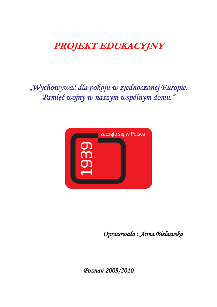 PROJEKT EDUKACYJNY „Wychowywać dla pokoju w zjednoczonej Europie. Pamięć wojny w naszym wspólnym domu.” Opracowała : Anna Bielawska Poznań 2009/2010 Cele 1. Kształtowanie historycznej pamięci o doświadczeniach II wojny światowej z ukierunkowaniem na budowanie zjednoczonej pokojowej Europy. 2. Upowszechnienie wiedzy o historii II wojny światowej ze szczególnym uwzględnieniem wydarzeń w Wielkopolsce. 3. Budowanie postaw patriotycznych w celu wychowania dla pokoju. 4. Wzmacniania identyfikacji regionalnej uczniów poprzez poznanie pieśni patriotycznych. 5. Wzmacnianie wrażliwości humanistycznej poprzez umuzykalnianie. 6. Zainspirowanie nauczycieli do tworzenia projektów edukacyjnych i wychowawczych związanych z II wojną światową. 7. Wsparcie dydaktyczne w realizacji podstawy programowej. 8. Rozwijanie współpracy pomiędzy nauczycielami, uczniami, rodzicami i przedstawicielami lokalnych instytucji 9. Stwarzanie uczniom możliwości samodzielnej pracy, pokazanie zalet pracy zespołowej i wykorzystania wychowawczych aspektów pracy projektowej. Formy realizacji 1. 2. 3. 4. 5. 6. Praca w zespołach klasowych i grupach Konkursy Wystawy Inscenizacje, pokazy, spotkanie ze świadkiem historii Wycieczki Redagowanie gazetki Zadania Wykonanie zadań zgodnie z podaną tematyką: październik – maj Podsumowanie projektu– maj 2010 Włączanie się w działania zaplanowane przez koordynatora projektu – ODN Poznań. 2 „Wychowywać dla pokoju w zjednoczonej Europie. Pamięć wojny w naszym wspólnym domu” lp. 1. ZADANIA Zgłoszenie szkoły do projektu 2. Konferencja inaugurująca projekt. Sesja naukowa i metodyczna dla koordynatorów szkolnych projektów. Szkolenia dla koordynatorów projektów szkolnych : Szkolenia i pakiety edukacyjne dla koordynatorów szkolnych projektów. 3. ODPOWIEDZIALNI koordynator projektu p.A.Bielawska koordynator projektu p.A.Bielawska TERMIN październik październik koordynator projektu p.A.Bielawska listopad-czerwiec koordynator projektu p.A.Bielawska wychowawcy klas listopad Sesja popularno - naukowa Pamięć wojny. Wojna o pamięć? 4. 5. Szkolenia dla koordynatorów szkół biorących udział w grze miejskiej Miejsca pamięci wpisane w naszą tożsamość. Przygotowanie projektu szkolnego Przeprowadzenie pogadanek lub zajęć tematycznych dotyczących tematyki projektu Opublikowanie projektu na stronie internetowej szkoły 6. 7. 8. Zbieranie materiałów na ten temat i przygotowanie gazetek tematycznych w salach lekcyjnych Spotkanie ze świadkiem historii Nauki moralne o wojnie i pokoju Jana Pawła II Polskie pieśni patriotyczne z okresu II wojny grudzień nauczyciel informatyki wychowawcy klas, nauczyciele muzyki, plastyki nauczyciel historii październik/listopad katecheci kwiecień nauczyciel muzyki marzec na bieżąco 3 Konkurs plastyczny, wykonanie plakatu upamiętniającego 70 rocznicę wybuchu II wojny światowej nauczyciel plastyki marzec Konkurs plastyczny – logo projektu edukacyjnego nauczyciel plastyki listopad Konkurs plastyczny – plakat „Nigdy więcej wojny” nauczyciel plastyki maj Wykonanie albumów lub prezentacji komputerowych –„II wojna światowa” nauczyciel historii luty wychowawcy klas listopad-czerwiec Konkurs literacki „II wojna światowa we wspomnieniach naszych najbliższych nauczyciel historii, nauczyciele j. polskiego grudzień Konkurs historyczny – II wojna światowa nauczyciel historii kwiecień Projekcja filmu „Westerplatte” nauczyciel historii maj Samorząd Uczniowski maj/czerwiec 11. Podsumowanie projektu : Część artystyczna Podsumowanie naszych działań Wręczenie nagród - konkursy koordynator projektu nauczyciel muzyki, plastyki maj/czerwiec 12. Opracowanie sprawozdania z realizacji projektu koordynator projektu p.A.Bielawska 30 czerwca 13. Uroczyste podsumowanie projektu – konferencja podsumowująca, wręczenie certyfikatów dla szkół koordynator projektu p.A.Bielawska 29 września 9. 10. Wycieczki – śladami II wojny (Cytadela, pomnik Polskiego Państwa Podziemnego, Fort VII, obóz w Żabikowie, Wielkopolskie Muzeum Wojskowe) Wydanie specjalnego numeru gazety szkolnej poświęconego 70 rocznicy wybuchu II wojny światowej. 4