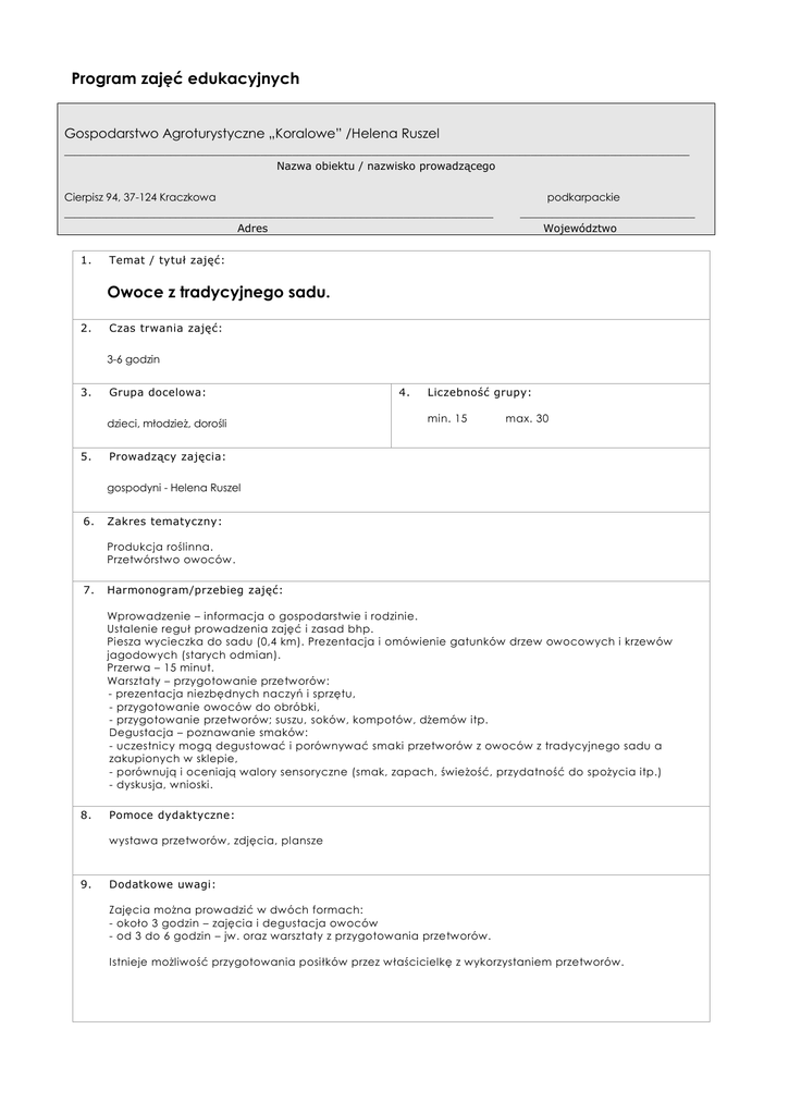 Program zajęć edukacyjnych Gospodarstwo Agroturystyczne „Koralowe” /Helena Ruszel ______________________________________________________________________________________________________________________ Nazwa obiektu / nazwisko prowadzącego Cierpisz 94, 37-124 Kraczkowa _________________________________________________________________________________ Adres 1. podkarpackie _________________________________ Województwo Temat / tytuł zajęć: Owoce z tradycyjnego sadu. 2. Czas trwania zajęć: 3-6 godzin 3. Grupa docelowa: dzieci, młodzież, dorośli 5. 4. Liczebność grupy: min. 15 max. 30 Prowadzący zajęcia: gospodyni - Helena Ruszel 6. Zakres tematyczny: Produkcja roślinna. Przetwórstwo owoców. 7. Harmonogram/przebieg zajęć: Wprowadzenie – informacja o gospodarstwie i rodzinie. Ustalenie reguł prowadzenia zajęć i zasad bhp. Piesza wycieczka do sadu (0,4 km). Prezentacja i omówienie gatunków drzew owocowych i krzewów jagodowych (starych odmian). Przerwa – 15 minut. Warsztaty – przygotowanie przetworów: - prezentacja niezbędnych naczyń i sprzętu, - przygotowanie owoców do obróbki, - przygotowanie przetworów; suszu, soków, kompotów, dżemów itp. Degustacja – poznawanie smaków: - uczestnicy mogą degustować i porównywać smaki przetworów z owoców z tradycyjnego sadu a zakupionych w sklepie, - porównują i oceniają walory sensoryczne (smak, zapach, świeżość, przydatność do spożycia itp.) - dyskusja, wnioski. 8. Pomoce dydaktyczne: wystawa przetworów, zdjęcia, plansze 9. Dodatkowe uwagi: Zajęcia można prowadzić w dwóch formach: - około 3 godzin – zajęcia i degustacja owoców - od 3 do 6 godzin – jw. oraz warsztaty z przygotowania przetworów. Istnieje możliwość przygotowania posiłków przez właścicielkę z wykorzystaniem przetworów.