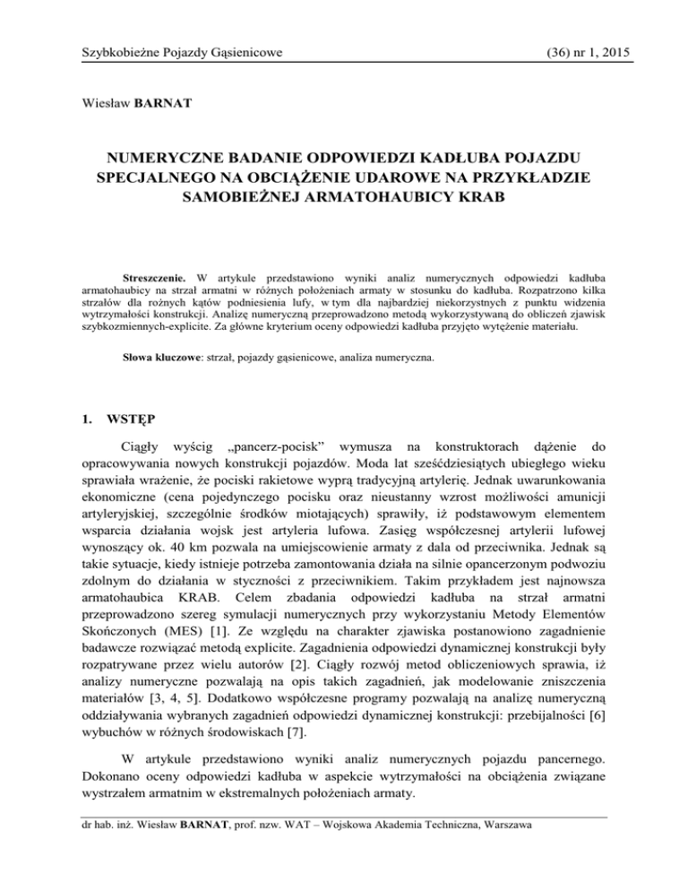 Szybkobiene Pojazdy Gsienicowe (36) nr 1, 2015 Wiesław BARNAT NUMERYCZNE BADANIE ODPOWIEDZI KADŁUBA POJAZDU SPECJALNEGO NA OBCIENIE UDAROWE NA PRZYKŁADZIE SAMOBIENEJ ARMATOHAUBICY KRAB Streszczenie. W artykule przedstawiono wyniki analiz numerycznych odpowiedzi kadłuba armatohaubicy na strzał armatni w rónych połoeniach armaty w stosunku do kadłuba. Rozpatrzono kilka strzałów dla ronych któw podniesienia lufy, w tym dla najbardziej niekorzystnych z punktu widzenia wytrzymałoci konstrukcji. Analiz numeryczn przeprowadzono metod wykorzystywan do oblicze zjawisk szybkozmiennych-explicite. Za główne kryterium oceny odpowiedzi kadłuba przyjto wytenie materiału. Słowa kluczowe: strzał, pojazdy gsienicowe, analiza numeryczna. 1. WSTP Cigły wycig „pancerz-pocisk” wymusza na konstruktorach denie do opracowywania nowych konstrukcji pojazdów. Moda lat szedziesitych ubiegłego wieku sprawiała wraenie, e pociski rakietowe wypr tradycyjn artyleri. Jednak uwarunkowania ekonomiczne (cena pojedynczego pocisku oraz nieustanny wzrost moliwoci amunicji artyleryjskiej, szczególnie rodków miotajcych) sprawiły, i podstawowym elementem wsparcia działania wojsk jest artyleria lufowa. Zasig współczesnej artylerii lufowej wynoszcy ok. 40 km pozwala na umiejscowienie armaty z dala od przeciwnika. Jednak s takie sytuacje, kiedy istnieje potrzeba zamontowania działa na silnie opancerzonym podwoziu zdolnym do działania w stycznoci z przeciwnikiem. Takim przykładem jest najnowsza armatohaubica KRAB. Celem zbadania odpowiedzi kadłuba na strzał armatni przeprowadzono szereg symulacji numerycznych przy wykorzystaniu Metody Elementów Skoczonych (MES) [1]. Ze wzgldu na charakter zjawiska postanowiono zagadnienie badawcze rozwiza metod explicite. Zagadnienia odpowiedzi dynamicznej konstrukcji były rozpatrywane przez wielu autorów [2]. Cigły rozwój metod obliczeniowych sprawia, i analizy numeryczne pozwalaj na opis takich zagadnie, jak modelowanie zniszczenia materiałów [3, 4, 5]. Dodatkowo współczesne programy pozwalaj na analiz numeryczn oddziaływania wybranych zagadnie odpowiedzi dynamicznej konstrukcji: przebijalnoci [6] wybuchów w rónych rodowiskach [7]. W artykule przedstawiono wyniki analiz numerycznych pojazdu pancernego. Dokonano oceny odpowiedzi kadłuba w aspekcie wytrzymałoci na obcienia zwizane wystrzałem armatnim w ekstremalnych połoeniach armaty. dr hab. in. Wiesław BARNAT, prof. nzw. WAT – Wojskowa Akademia Techniczna, Warszawa 10 2. Wiesław BARNAT WYBÓR METODY ROZWIZANIA Głównym obiektem bada była cika armatohaubica. Model pojazdu był obciony impulsem cinienia pochodzcym od wystrzału dla rónych konfiguracji połoenia wiey i działa (w zenicie i elewacji). Otrzymane wyniki przedstawiono w postaci map napre zredukowanych. Ostatnimi czasy Metoda Elementów Skoczonych (MES) stanowi podstawow metod analizy procesu oddziaływania wystrzału na kadłub pojazdu. W pracy przyjto nastpujce załoenia do analizy numerycznej wykonanej w systemie LS-DYNA [1]: − algorytm typu explicit (jawny) do rozwizania równa dynamiki konstrukcji z zakresie nieliniowym; − sprysto-plastyczny model materiału; − model materiału sztywnego; − odkształcalne elementy powłokowe typu SHELL (typ 2) [1]; − odkształcalne elementy bryłowe typu SOLID (typ 1) [1]; − warunki pocztkowo-brzegowe uwzgldniajce zjawisko grawitacji; − due odkształcenia i przemieszczenia. Warto zauway, i zjawiska poruszane w artykule: − nale do szybkozmiennych w czasie (czas trwania wystrzału); − charakteryzuj si duymi nieliniowociami geometrycznymi (due odkształcenia, przemieszczenia, kontakt) i fizycznymi (nieliniowoci materiałowe); − wymagaj małego przyrostu czasu t. Do symulacji tego typu zjawisk stosuje si algorytm typu explicit. 3. MODEL NUMERYCZNY Główn trudnoci przy modelowaniu wszelkiego rodzaju pojazdów jest odpowiedni podział geometrii (rys. 1) na elementy skoczone z zachowaniem optymalnej iloci wzłów oraz punktów Gaussa. Nastpnie elementom nadaje si odpowiednie właciwoci uwzgldniajce m.in. gruboci, rodzaj definiowanego materiału i połcze midzy poszczególnymi czciami pojazdu. Po dokonaniu ww. czynnoci powstaje model numeryczny pojazdu (rys. 2 - 8). Do analiz numerycznych zastosowano model materiału sprysto-plastycznego (ze wzmocnieniem dynamicznym) o nastpujcych właciwociach: E = 210 GPa – moduł Younga, = 0,3 – liczba Poisson’a, Re = 1000 MPa – granica plastycznoci. Rys. 1. Model geometryczny pojazdu 11 Numeryczne badanie odpowiedzi kadłuba pojazdu cikiego na obcienie udarowe… Rys. 2. Model numeryczny pojazdu KRAB – widok ogólny Rys. 3. Model numeryczny pojazdu KRAB – widok z góry Rys. 4. Model numeryczny pojazdu KRAB – widok z dołu Rys. 5. Model numeryczny pojazdu KRAB – widok z przodu i z tyłu Rys. 6 Model numeryczny pojazdu KRAB – widok prawej burty 12 Wiesław BARNAT Rys. 7. Model numeryczny pojazdu KRAB – widok lewej burty Rys. 8. Wntrze pojazdu KRAB Głowne elementy masowe, takie jak: wiea, zbiorniki, akumulatory itp. s opisane poprzez masy skupione. Schematyczne rozmieszczenie mas skupionych przedstawiono na rysunku 9. Rys. 9. Rozmieszczenie mas skupionych w modelu numerycznym Kadłub poprzez elementy sprysto-tłumice został połczony z nieodkształcalnymi gsienicami o masie odpowiadajcej rzeczywistym gsienicom. Zamodelowane elementy sprysto-tłumice s odpowiednikiem zawieszenia w rzeczywistym pojedzie (rys.10). Dodatkowo w analizach numerycznych uwzgldniono oddziaływanie gsienic pojazdu z podłoem, polegajce na zastosowaniu funkcji kontaktu (z uwzgldnieniem tarcia). Na podstawie ogólnodostpnej literatury przyjto współczynnik tarcia statycznego i kinetycznego równy 0,8. Numeryczne badanie odpowiedzi kadłuba pojazdu cikiego na obcienie udarowe… 13 Rys. 10. Połczenie zawieszenia z kadłubem zrealizowane przy pomocy wizów interpolacyjnych Wiea w przyjtym modelu jest zdefiniowana poprzez element masowy (mas punktow poł