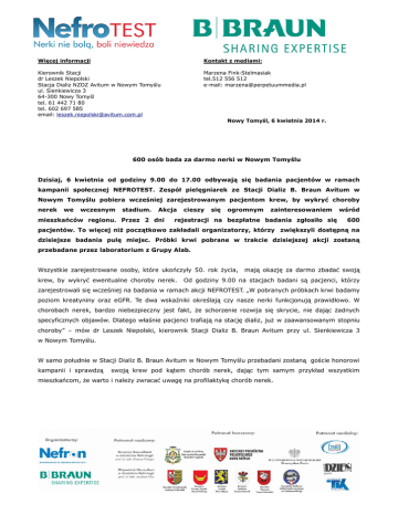 Więcej informacji Kontakt z mediami: Kierownik Stacji dr Leszek Niepolski Stacja Dializ NZOZ Avitum w Nowym Tomyślu ul. Sienkiewicza 3 64-300 Nowy Tomyśl tel. 61 442 71 80 tel. 602 697 585 email: [email protected] Marzena Fink-Stelmasiak tel.512 556 512 e-mail: [email protected] Nowy Tomyśl, 6 kwietnia 2014 r. 600 osób bada za darmo nerki w Nowym Tomyślu Dzisiaj, 6 kwietnia od godziny 9.00 do 17.00 odbywają się badania pacjentów w ramach kampanii społecznej NEFROTEST. Zespół pielęgniarek ze Stacji Dializ B. Braun Avitum w Nowym Tomyślu pobiera wcześniej zarejestrowanym pacjentom krew, by wykryć choroby nerek we wczesnym stadium. Akcja mieszkańców regionu. Przez 2 dni cieszy się ogromnym zainteresowaniem rejestracji na bezpłatne badania zgłosiło się wśród 600 pacjentów. To więcej niż początkowo zakładali organizatorzy, którzy zwiększyli dostępną na dzisiejsze badania pulę miejsc. Próbki krwi pobrane w trakcie dzisiejszej akcji zostaną przebadane przez laboratorium z Grupy Alab. Wszystkie zarejestrowane osoby, które ukończyły 50. rok życia, krew, by wykryć ewentualne choroby nerek. mają okazję za darmo zbadać swoją Od godziny 9.00 na stacjach badani są pacjenci, którzy zarejestrowali się wcześniej na badania w ramach akcji NEFROTEST. „W pobranych próbkach krwi badamy poziom kreatyniny oraz eGFR. Te dwa wskaźniki określają czy nasze nerki funkcjonują prawidłowo. W chorobach nerek, bardzo niebezpieczny jest fakt, że schorzenie rozwija się skrycie, nie dając żadnych specyficznych objawów. Dlatego właśnie pacjenci trafiają na stację dializ, już w zaawansowanym stopniu choroby” – mów dr Leszek Niepolski, kierownik Stacji Dializ B. Braun Avitum przy ul. Sienkiewicza 3 w Nowym Tomyślu. W samo południe w Stacji Dializ B. Braun Avitum w Nowym Tomyślu przebadani zostaną goście honorowi kampanii i sprawdzą swoją krew pod kątem chorób nerek, dając tym samym przykład wszystkim mieszkańcom, że warto i należy zwracać uwagę na profilaktykę chorób nerek. NEFROTEST w Nowym Tomyślu jest kolejną, 39. już odsłoną ogólnopolskiej kampanii społecznej organizowanej przez Nefron Sekcję Nefrologiczną Izby Gospodarczej Medycyna Polska oraz firmę B. Braun. Kampania ma na celu uświadomienie Polakom jak ważne są dla naszego organizmu nerki i dlaczego warto o nie dbać. Do tej pory dzięki akcji NEFROTEST przebadało się ponad 26 tysięcy pacjentów, w trzydziestu ośmiu miastach w całej Polsce. Wyniki około 10 proc. badanych odbiegały od normy. Zostali oni skierowani na dalszą diagnostykę. Szacunkowo w Polsce, problemy z nerkami ma ok. 4 milionów osób, z czego większość pacjentów nie zdaje sobie z tego sprawy. Choć choroba może dotknąć każdego, w grupie największego ryzyka są chorzy na cukrzycę, nadciśnienie, choroby układu krążenia, osoby mające w rodzinie chorych na nerki i po ukończeniu 60. roku życia. Badania w ramach kampanii NEFROTEST cieszą się w całej Polsce ogromną popularnością. Liczba chętnych zwykle znacznie przewyższa możliwości organizacyjne stacji dializ. Aby badaniami objąć jeszcze więcej pacjentów, bezpłatne skierowania na testy krwi, dla osób które ukończyły 50. rok życia, przesłaliśmy także do lekarzy rodzinnych na terenie powiatu nowotomyskiego Jeżeli komuś nie udało się zarejestrować na dzisiejsze badania, ma jeszcze szansę przebadać się za darmo – wystarczy poprosić o skierowanie swojego lekarza POZ. Warto także pamiętać, że badanie to nie jest drogie, kosztuje kilkanaście złotych i można je wykonać na własny koszt w dowolnym momencie.