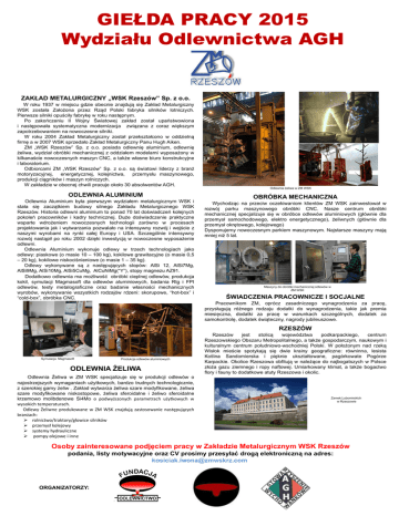 GIEŁDA PRACY 2015 Wydziału Odlewnictwa AGH ZAKŁAD METALURGICZNY „WSK Rzeszów” Sp. z o.o. W roku 1937 w miejscu gdzie obecnie znajdują się Zakład Metalurgiczny WSK została Założona przez Rząd Polski fabryka silników lotniczych. Pierwsze silniki opuściły fabrykę w roku następnym. Po zakończeniu II Wojny Światowej zakład został upaństwowiona i następowała systematyczna modernizacja związana z coraz większym zapotrzebowaniem na nowoczesne silniki. W roku 2004 Zakład Metalurgiczny został przekształcono w oddzielną firmę a w 2007 WSK sprzedało Zakład Metalurgiczny Panu Hugh Aiken. ZM „WSK Rzeszów” Sp. z o.o. posiada odlewnię aluminium, odlewnię żeliwa, wydział obróbki mechanicznej z oddziałem modelarni wyposażony w kilkanaście nowoczesnych maszyn CNC, a także własne biuro konstrukcyjne i laboratorium. Odbiorcami ZM „WSK Rzeszów” Sp. z o.o. są światowi liderzy z branż motoryzacyjnej, energetycznej, kolejnictwa, przemysłu maszynowego, produkcji ciągników i maszyn rolniczych. W zakładzie w obecnej chwili pracuje około 30 absolwentów AGH. ODLEWNIA ALUMINIUM Odlewnia Aluminium była pierwszym wydziałem metalurgicznym WSK i stała się zaczątkiem budowy silnego Zakładu Metalurgicznego WSK Rzeszów. Historia odlewni aluminium to ponad 70 lat doświadczeń kolejnych pokoleń pracowników i kadry technicznej. Duże doświadczenie praktyczne wsparte wdrożeniem nowoczesnych technologii zarówno w procesach projektowania jak i wytwarzania pozwalało na intensywny rozwój i wejście z naszymi wyrobami na rynki całej Europy i USA. Szczególnie intensywny rozwój nastąpił po roku 2002 dzięki inwestycją w nowoczesne wyposażenie odlewni. Odlewnia Aluminium wykonuje odlewy w trzech technologiach jako odlewy: piaskowe (o masie 10 – 100 kg), kokilowe grawitacyjne (o masie 0,5 – 20 kg), kokilowe niskociśnieniowe (o masie 1 – 35 kg). Odlewy wykonywane są z następujących stopów: AlSi 12, AlSi7Mg, AlSi9Mg, AlSi10Mg, AlSi5CuMg, AlCuNiMg(“Y”), stopy magnezu AZ91. Dodatkowo odlewnia ma możliwość obróbki cieplnej odlewów, produkcja kokil, symulacji Magmasoft dla odlewów aluminiowych, badania Rtg i FPI odlewów, testy metalograficzne oraz badanie własności mechanicznych wyrobów, wykonywanie wszystkich rodzajów rdzeni: skorupowe, “hot-box” i “cold-box”, obróbka CNC. Odlewnia żeliwa w ZM WSK OBRÓBKA MECHANICZNA Wychodząc na przeciw oczekiwaniom klientów ZM WSK zainwestował w rozwój parku maszynowego obróbki CNC. Nasze centrum obróbki mechanicznej specjalizuje się w obróbce odlewów aluminiowych (głównie dla przemysł samochodowego, elektro energetycznego), żeliwnych (głównie dla przemysł okrętowego, kolejowego) Dysponujemy nowoczesnym parkiem maszynowym. Najstarsze maszyny mają mniej niż 5 lat. Maszyny do obróbki mechanicznej odlewów w ZM WSK ŚWIADCZENIA PRACOWNICZE I SOCJALNE Pracownikom ZM, oprócz zasadniczego wynagrodzenia za pracę, przysługują różnego rodzaju dodatki do wynagrodzenia, takie jak premia miesięczna, dodatki za pracę w warunkach szczególnych, dodatek za samokontrolę, dodatek świąteczny, nagrody jubileuszowe. RZESZÓW Symulacja Magmasoft Produkcja odlewów aluminiowych ODLEWNIA ŻELIWA Odlewnia Żeliwa w ZM WSK specjalizuje się w produkcji odlewów o najostrzejszych wymaganiach użytkowych, bardzo trudnych technologicznie, z szerokiej gamy żeliw . Zakład wytwarza żeliwa szare modyfikowane, żeliwa szare modyfikowane niskostopowe, żeliwa sferoidalne i żeliwo sferoidalne krzemowo molibdenowe Si4Mo o podwyższonych parametrach użytkowych w wysokich temperaturach. Odlewy Żeliwne produkowane w ZM WSK znajdują zastosowanie następujących branżach: rolnictwo/traktory/głowice silników przemysł kolejowy systemy hydrauliczne pompy olejowe i inne Rzeszów jest stolicą województwa podkarpackiego, centrum Rzeszowskiego Obszaru Metropolitalnego, a także gospodarczym, naukowym i kulturalnym centrum południowo-wschodniej Polski. W położonym nad rzeką Wisłok mieście spotykają się dwie krainy geograficzne: równinna, lesista Kotlina Sandomierska i pięknie ukształtowane, pagórkowate Pogórze Karpackie. Okolice Rzeszowa obfitują w należące do najbogatszych w Polsce złoża gazu ziemnego i ropy naftowej. Umiarkowany klimat, a także bogactwo flory i fauny to dodatkowe atuty Rzeszowa i okolic. Zamek Lubomirskich w Rzeszowie Osoby zainteresowane podjęciem pracy w Zakładzie Metalurgicznym WSK Rzeszów podania, listy motywacyjne oraz CV prosimy przesyłać drogą elektroniczną na adres: [email protected] ORGANIZATORZY: