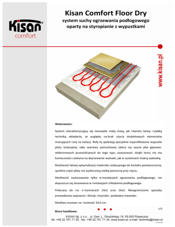 Kisan Comfort Floor Dry system suchy ogrzewania podłogowego oparty na styropianie z wypustkami Właściwości: System charakteryzujący się niezwykle niską masą, jak również łatwą i szybką techniką układania, ze względu na brak użycia dodatkowych elementów mocujących rurę na izolacji. Rolę tę spełniają specjalnie wyprofilowane wypustki płyty izolacyjnej. Jako warstwy jastrychowej zaleca się użycie płyt gipsowowłókninowych przewidzianych do tego typu zastosowań, dzięki temu nie ma konieczności czekania na dojrzewanie wylewki, jak w systemach mokrą wylewką. Możliwość łatwej optymalizacji materiału izolacyjnego do kształtu pomieszczenia, spodnia część płyty ma wytłoczoną siatkę pomocną przy cięciu. Możliwość zastosowania tylko w instalacjach ogrzewania podłogowego, nie dopuszcza się stosowania w instalacjach chłodzenia podłogowego. Polecany do rur o rozmiarach 14x2 oraz 16x2. Nieograniczone sposoby prowadzenia wężownic: ślimak, meander, podwójny meander. Możliwy rozstaw rur: krotność 10,0 cm. 1/2 Biuro handlowe: VII 2012 MC Kisan Comfort Floor Dry system suchy ogrzewania podłogowego oparty na styropianie z wypustkami Izolacyjne płyty systemowe dostępne w grubości 4,9 cm są wykonane z polistyrenu ekspandowanego, materiału odpornego na deformację, pozwalającego na swobodne poruszanie się po nim. Dodatkowo płyty posiadają frez zakładkowy do montażu pomiędzy sobą. Więcej informacji o płycie izolacyjnej znajduje się w jej karcie technicznej. Dane techniczne i wskazówki montażowe. Należy stosować taśmę brzegową w celu umożliwienia ruchu płytom jastrychowym. Lamele grzejne o wymiarach 1000x125 mm, w sposób znaczący zwiększają skuteczność grzewczą systemu, lamele należy układać na wszystkich możliwych prostych odcinkach rur w pętlach grzewczych, średnie zużycie lameli należy przyjmować na około 60-70% długości rur w pętlach grzewczych. Przejścia rur przez dylatacje chronić 30 cm rurą ochronną. Dodatkowo należy się stosować do instrukcji montażu jastrychów każdego z producentów systemów jastrychowych (np. Knauf Brio, Fermacell). Maksymalny opór cieplny okładziny wierzchniej R < 0,15 m2K/W (wg norm), np. minimalny opór cieplny warstwy drewna 0,04 m2K/W, ceramiki 0,01 m2K/W. Zastosowanie: Obiekty nowe i remontowane, gdy stropy mają niewystarczającą nośność lub wymagane jest szybkie wykonanie prac budowlanych. Obiekty z podłogami podniesionymi. 2/2 Biuro handlowe: VII 2012 MC