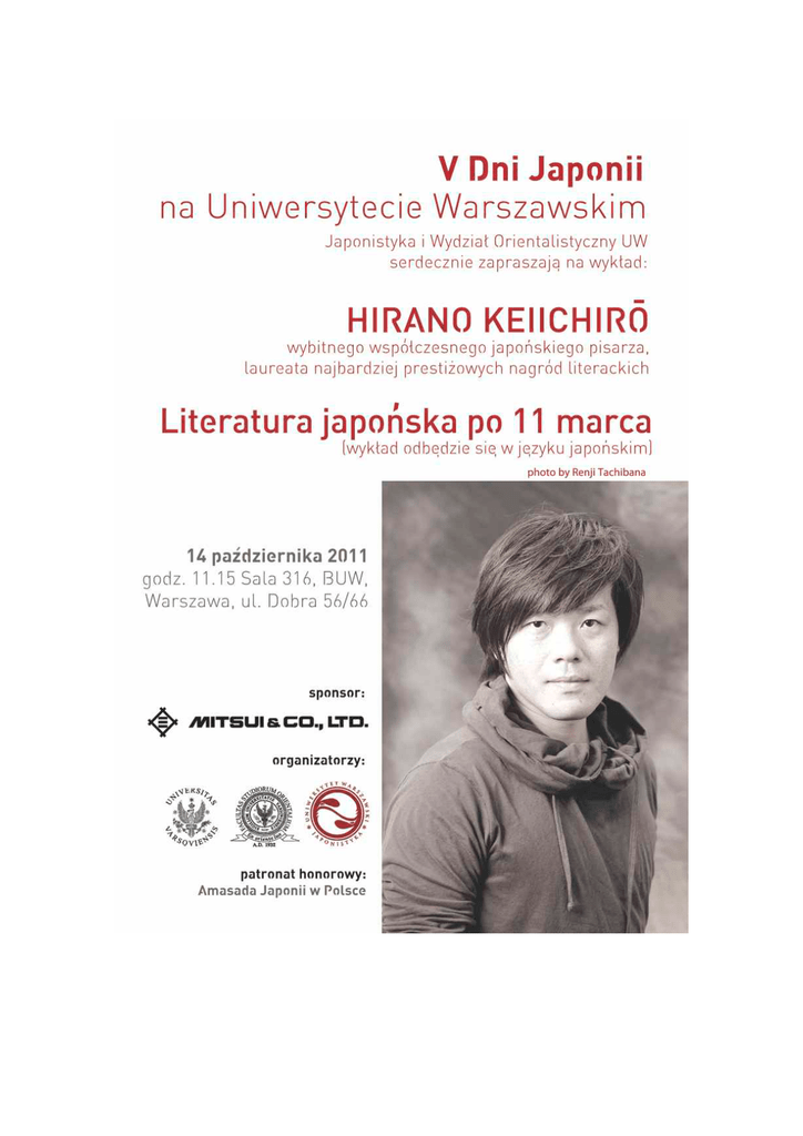 Hirano Keiichirō (ur. 1975) jest jednym z najbardziej utalentowanych, młodych, współczesnych japońskich pisarzy. Prestiżową nagrodę Akutagawy otrzymał w wieku 23 lat za powieść Nisshoku (Zaćmienie Słońca, 1998), gdy był jeszcze studentem prawa na Uniwersytecie Kiotyjskim. Był w tamtym czasie najmłodszym laureatem tej najważniejszej literackiej nagrody i czwartym pisarzem, po Ishiharze Shintarō, Ōe Kenzaburō i Murakamim Ryū, który uzyskał ją jako student. Powieść Nisshoku, której tematem jest XV-wieczna Europa targana procesami o herezję, przyniosła Hirano wielki rozgłos. Rozległa wiedza autora oraz piękny, stylizowany na klasyczny język, ujawniły jego nadzwyczajny talent pisarski i Hirano został okrzyknięty „drugim Mishimą Yukio”. Kolejne powieści młodego pisarza, Ichigetsu monogatari (Opowieść pierwszego miesiąca księżycowego, 1999) i Sōsō (Orszak pogrzebowy, 2002), składają się wraz z Nisshoku na trzy najważniejsze prace pierwszego okresu jego twórczości. Ichigetsu monogatari jest poetycką opowieścią o miłości, dziejącą się w Japonii w 1897 r. Z kolei akcja Sōsō dzieje się we Francji, na tle wydarzeń rewolucji lutowej 1848 roku. Jej głównymi bohaterami są dwaj wielcy artyści, Chopin i Delacroix. Na kartach tej powieści-rzeki przedstawione zostały, z wielką erudycją i dbałością o szczegóły historyczne, dzieje idei nowożytnej Europy. Na drugi okres twórczości Hirano składają się cztery główne utwory, których akcja dzieje się w czasach współczesnych. Pierwszy z nich, zatytułowany Takasegawa (Rzeka Takase, 2003) jest zbiorem czterech eksperymentalnych opowiadań, z których tytułowy utwór, osadzony w realiach współczesnego Kioto i będący subtelnym studium psychologicznym, podejmuje temat seksualności młodych ludzi. W drugim zbiorze, Shitatariochiru tokeitachi no hamon (Spadające kroplami zegary tworzą kręgi na wodzie 2004), na który składa się dziewięć opowiadań, pogłębione zostały wcześniej podejmowane tematy, dotyczące współczesnego społeczeństwa, takie jak wojna, rodzina, śmierć, modernizacja, technika. W kolejnym utworze, jakim jest powieść Kao no nai rataitachi (Nagie ciała bez twarzy, 2006), podjęty został temat poszukiwania przez współczesnego człowieka, zagubionego w przestrzeni internetowej, własnej, coraz bardziej skomplikowanej tożsamości. I wreszcie w zbiorze Anata ga, inakatta, anata (Nie było cię, nie było, 2007), zamykającym drugi okres twórczości Hirano zdominowany przez opowiadania, przedstawieni zostali ludzie żyjący w różnych miejscach i różnych czasach oraz poruszona została kwestia cielesności. W 2004 r. Hirano przebywał przez rok w Paryżu jako ambasador kultury z ramienia Agencji do spraw Kultury; prowadził w tym czasie wykłady w różnych miastach Europy. Po powrocie do kraju brał żywy udział w dyskusjach, polemikach, zajmował się krytyką literacką. Plon swej działalności literackiej zebrał w książce Monorogu. Esseishū (Monolog. Zbiór esejów, 2007), której głównym tematem jest Mishima Yukio i Diarōgu. Taidanshū (Dialog. Zbiór rozmów, 2007), zawierającej rozmowy z pisarzami, m. in. z Ōe Kenzaburō. Na ten okres przypadają poza tym nowo powstałe książki, których jest współautorem: Wēbu ningenron (Teoria człowieka internetowego, 2006), Mairusu Deivisu to wa dare ka (Kim jest Miles Davis?, 2007) i książki autorskie: Hon no yomikata – surō rīdingu no jikken ( Jak czytać książki - Slow reading w praktyce, 2007), czy też Shōsetsu no yomikata – kansō ga katareru chakuganten ( Jak czytać powieści – wychodząc od wrażeń, 2008). Na trzeci okres twórczości Hirano składają się głównie powieści. Pierwsza z nich, dwutomowa Kekkai (Pęknięta tama, 2008), za którą otrzymał Nagrodę Kulturalną Ministra Nauki, Edukacji i Sportu dla Młodych Twórców (patrz lista nagród), jest wielką epopeją, przepełnioną filozoficzną głębią. Ta osadzona w realiach współczesnej Japonii długa powieść przywołuje skojarzenia ze światem utworów Dostojewskiego, lub, jak niektórzy twierdzą – Bułhakowa. Wydarzenia związane z serią koszmarnych zbrodni, które składają się na jej fabułę, prowokują do zadawania pytań na temat samotności współczesnego człowieka, sensu słowa „szczęście” i natury zła. Z kolei tematem futurystycznej powieści o niedalekiej przyszłości, Dōn (Zmierzch, 2009), jest pokonywanie trudności, które napotykamy we współczesnych czasach. Za powieść tę Hirano otrzymał literacką nagrodę Bunkamura Deux Magots. Obecnie jego najnowsza powieść, Katachidake no ai (Miłość tylko z pozoru) ukazuje się w odcinkach w wieczornym wydaniu gazety „Yomiuri Shinbun”. Główne nagrody: 1999 Nagroda Akutagawy za Nisshoku (Zaćmienie Słońca) 2001 Nagroda Kultury Miasta Kioto 2009 Nagroda Kulturalna Ministra Nauki, Edukacji i Sportu dla Młodych Twórców za Kekkai (Pęknięta tama) 2009 Nagroda Literacka Bunkamura Deux Magots za Dōn (Zmierzch) Jest to drugi wykład z cyklu spotkań w ramach Programu Wykładów Ufundowanych przez Firmę Mitsui & Co. Ltd. dla Studiów Japonistycznych na Uniwersytecie Warszawskim. Celem programu jest pogłębienie wzajemnego zrozumienia między Polską a Japonią oraz promowanie wymiany kulturalnej i jej rozwoju. Firma Mitsui & Co., Ltd. ufundowała program wykładów dla studiów japonistycznych na Uniwersytecie Warszawskim, jednej z najbardziej cenionych uczelni wyższych w Polsce, szczycącej się wieloletnimi tradycjami na gruncie europejskich studiów japonistycznych. Program wykładów ufundowany przez firmę Mitsui, adresowany głównie do studentów Uniwersytetu Warszawskiego, ma na celu wzbogacanie wiedzy polskich specjalistów z myślą o przyszłości współpracy pomiędzy Polską i Japonią oraz umacnianiu więzi przyjaźni, jaką darzą siebie nawzajem społeczeństwa obu krajów. Program