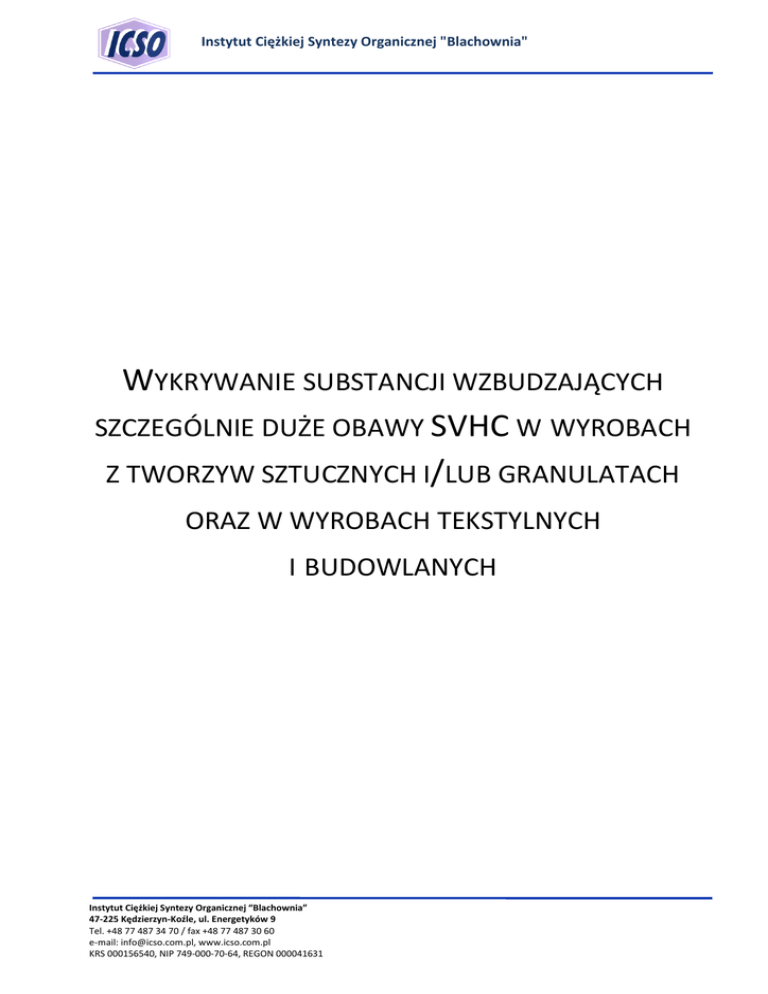 Instytut Ciężkiej Syntezy Organicznej "Blachownia" WYKRYWANIE SUBSTANCJI WZBUDZAJĄCYCH SZCZEGÓLNIE DUŻE OBAWY SVHC W WYROBACH Z TWORZYW SZTUCZNYCH I/LUB GRANULATACH ORAZ W WYROBACH TEKSTYLNYCH I BUDOWLANYCH Instytut Ciężkiej Syntezy Organicznej “Blachownia” 47-225 Kędzierzyn-Koźle, ul. Energetyków 9 Tel. +48 77 487 34 70 / fax +48 77 487 30 60 e-mail: [email protected], www.icso.com.pl KRS 000156540, NIP 749-000-70-64, REGON 000041631 Instytut Ciężkiej Syntezy Organicznej "Blachownia" Przedmiotem oferty jest wykrywanie substancji wzbudzających szczególnie duże obawy SVHC w wyrobach na poziomie ≥0,1% 1. Zakres prac Zgodnie z procedurą przeprowadza się czynności: 1. Próbę ocenia się pod względem jednorodności materiału, z którego jest wykonany. Wyrób dzieli się na elementy wykonane z tego samego materiału. 2. Próbę rozdrabnia się i uśrednia w sposób zapobiegający uwalnianiu substancji lotnych w trakcie tych operacji jednostkowych. 3. Badania zawartości substancji nieorganicznych 4. Rozdrobnioną i uśrednioną próbę analizuje się pod względem zawartości związków organicznych: 4.a. Badania termoemisji, 4.b. Badania ekstraktów uzyskanych przy użyciu trzech rozpuszczalników matodą GC/MS i wariantowo LC/MS 5. Badania identyfikacyjne materiału (poza mieszaniną rozpuszczalników) 5.a. Charakterystyka materiału FTIR, 5.b. Charakterystyka materiału Py-GC/MS, 5.c Charakterystyka materiału MALDI/TOF. 6. Opracowanie wyników badań produktu gotowego/wyrobu 6.a. Wykluczenie obecności substancji SVHC w produkcie gotowym/ wyrobie na poziomie równym lub wyższym niż 0,1%. 6.b. Weryfikacja wyników w oparciu o identyfikację materiału, z którego wykonany jest wyrób i wiedzy na temat dodatków uszlachetniających i substancji stosowanych w produkcji. 7. Opracowanie raportu lub sprawozdania z badania w systemie DPL. 2. Metody badawcze 1. Metody analizy elementarnej (CHNSCl) 2. Metoda fluorescencyjnej spektrometrii rentgenowskiej (XRF) 3. Metoda optycznej spektrometrii emisyjnej ze wzbudzeniem w plazmie indukowanej (ICP-OES) 4. Chromatografia gazowa z detekcją mas (GC/MS) 5. Chromatografia cieczowa z detekcją mas (LC/MS) Strona 2 z 4 Instytut Ciężkiej Syntezy Organicznej "Blachownia" 6. Badania termoemisji (TD-GC/MS) 7. Spektroskopia w podczerwieni z transformacją Fouriera (FTIR) 8. Pirolityczna chromatografia gazowa z detekcją mas (Py-GC/MS) 9. Metoda jonizacji światłem laserowym wspomaganej matrycą MALDI/TOF 3. Termin realizacji 3-4 tygodnie od momentu dostarczenia próbek 4. Sposób przekazania wyników Raport z badania lub sprawozdanie z badania wraz z fakturą zostanie przekazane do Zamawiającego. 5. Ważność oferty Oferta jest ważna do 31.03.2016r. 6. Cena i warunki płatności Cena z rabatem 30% na wyroby z tworzyw sztucznych i/lub granulaty 1 produkt/wyrób 3 750 zł (netto) / 4 612,50 zł (brutto) Cena z rabatem 15% na wyroby tekstylne i budowlane 1 produkt/wyrób 4 550 zł (netto) / 5 596,50 zł (brutto) Warunki płatności: 30 dni od daty wystawienia faktury 7. Dane oferenta Zakład Analityczny Instytut Ciężkiej Syntezy Organicznej „Blachownia” ul. Energetyków 9, 47-225 Kędzierzyn-Koźle, tel.: 77 487 34 70 faks: 77 487 30 60, e-mail: [email protected] Osoba do kontaktu: dr inż. Renata Kulesza, tel. 77 487 35 68, kom. 664 718 941 Strona 3 z 4 Instytut Ciężkiej Syntezy Organicznej "Blachownia"
