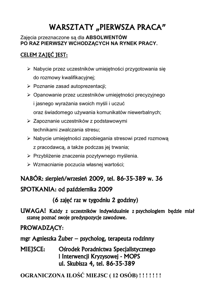 WARSZTATY „PIERWSZA PRACA” Zajęcia przeznaczone są dla ABSOLWENTÓW PO RAZ PIERWSZY WCHODZĄCYCH NA RYNEK PRACY. CELEM ZAJĘĆ JEST: Ø Nabycie przez uczestników umiejętności przygotowania się do rozmowy kwalifikacyjnej; Ø Poznanie zasad autoprezentacji; Ø Opanowanie przez uczestników umiejętności precyzyjnego i jasnego wyrażania swoich myśli i uczuć oraz świadomego używania komunikatów niewerbalnych; Ø Zapoznanie uczestników z podstawowymi technikami zwalczania stresu; Ø Nabycie umiejętności zapobiegania stresowi przed rozmową z pracodawcą, a także podczas jej trwania; Ø Przybliżenie znaczenia pozytywnego myślenia. Ø Wzmacnianie poczucia własnej wartości; NABÓR: sierpień/wrzesień 2009, tel. 86-35-389 w. 36 SPOTKANIA: od października 2009 (6 zajęć raz w tygodniu 2 godziny) UWAGA! Każdy z uczestników indywidualnie z psychologiem będzie miał szansę poznać swoje predyspozycje zawodowe. PROWADZĄCY: mgr Agnieszka Żuber – psycholog, terapeuta rodzinny MIEJSCE: Ośrodek Poradnictwa Specjalistycznego i Interwencji Kryzysowej - MOPS ul. Skubisza 4, tel. 86-35-389 OGRANICZONA ILOŚĆ MIEJSC ( 12 OSÓB) ! ! ! ! ! ! !