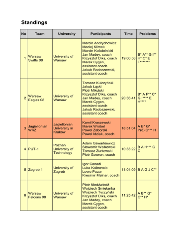 Standings No Team University Participants Time Problems University of Warsaw Marcin Andrychowicz Maciej Klimek Marcin Kościelnicki Jan Madey, coach Krzysztof Diks, coach Marek Cygan, assistant coach Jakub Radoszewski, assistant coach B* A** G I** 19:06:58 H* C* E F******* Warsaw 2 Eagles 08 University of Warsaw Tomasz Kulczyński Jakub Łącki Piotr Mikulski Krzysztof Diks, coach Jan Madey, coach Marek Cygan, assistant coach Jakub Radoszewski, assistant coach B* A F** C* 20:36:41 G I**** E H**** Jagiellonian 3 WKZ Jagiellonian University in Krakow Kamil Kraszewski Marek Wróbel Pawel Zaborski Pawel Idziak, coach 18:51:04 A B* G* I*(8) C*** H 4 PUT-1 Poznan University of Technology Adam Gawarkiewicz Sławomir Wałkowski Tomasz Zurkowski Piotr Gawron, coach 10:33:22 B A H*** G C University of Zagreb Igor Canadi Luka Kalinovcic 11:04:09 B A G J C** Lovro Puzar Kresimir Malnar, coach University of Warsaw Piotr Niedźwiedź Wojciech Śmietanka Wojciech Tyczyński Krzysztof Diks, coach Jan Madey, coach Marek Cygan, assistant coach 1 Warsaw Swifts 08 5 Zagreb 1 6 Warsaw Falcons 08 11:25:42 A B** G* C** H* Jakub Radoszewski, assistant coach 7 UWr2 University of Wroclaw Piotr Caban Elżbieta Dłutowska Tomasz Gogacz Artur Jeż, coach 11:48:29 A B* G H**** F* Jagiellonian 8 TBA Jagiellonian University in Krakow Rafał Józefowicz Robert Obryk Jonasz Pamuła Pawel Idziak, coach 12:02:40 B G* A C** E**** Jagiellonian 9 Future Jagiellonian University in Krakow Dominik Dudzik Dominik Kempa Radoslaw Kozuch Pawel Idziak, coach 12:19:08 B G A H*** C***** Comenius University Miroslav Balaz Peter Pereńíni A B G* C* 13:30:11 Lukáń Poláček F****** Michal Winczer, coach 11 UWr3 University of Wroclaw Marcin Babij Jarosław Gomułka Paweł Pająk Artur Jeż, coach 6:33:00 A B G*** C 12 AGH1 AGH University of Science and Technology Daniel Czajka Marcin Jacek Skotniczny 6:50:08 Krzyś Magiera Tomasz Szydlo, coach A B** I* G* 13 MFF UK 1 Charles University in Prague Michal Danilák Peter Ondrúńka Michal Szabados Pavel Topfer, coach 6:58:30 BAGH 14 UWr5 University of Wroclaw Tomasz Górzny Rafał Sokołowski Krzysztof Templin Artur Jeż, coach 7:11:37 B A* G* H* 15 Comenius42 Comenius Vladimir Boza Marek Zeman 8:04:22 B A* G C** 10 Comenius47 University Juraj Zemianek Michal Winczer, coach Jagiellonian 16 Black Hole Jagiellonian University in Krakow Janek Hązła Mateusz Kwiatek Filip Wojciak Pawel Idziak, coach 8:47:37 B A** G H***** 17 NCU 1 Nicolaus Copernicus University Adam Czachorowski Michal Gawarkiewicz Slawomir Krysztowiak Krzysztof Stencel, coach 9:35:49 B A G H*** 18 UWr1 University of Wroclaw Władysław Kwaśnicki Mateusz Rukowicz Przemysław Uznański Artur Jeż, coach 9:46:26 A B** C* G University of Warsaw Karol Kurach Krzysztof Pawlowski Michał Pilipczuk Krzysztof Diks, coach Jan Madey, coach Marek Cygan, assistant coach Jakub Radoszewski, assistant coach 10:47:55 B* A* G I*(11) 20 ELTE Larks Eötvös Loránd University Dániel Korándi Gergely Nagy Balázs Szalkai Zsolt Borsi, coach 11:43:37 B A*** C** G* 21 UWr6 University of Wroclaw Piotr Młynarczyk Filip Mróz Mateusz Piwnicki Artur Jeż, coach 20:54:15 B****** A* C* I******* Jagiellonian University in Krakow Alan Meller Rafal Pytko Piotr Zieliński Bartosz Walczak, coach 2:40:32 BAG Michał Jastrzębski 3:20:26 ABG 19 22 Warsaw Hawks 08 Jagiellonian RAP 23 Warsaw Owls University of 08 Warsaw Damian Karasiński Błażej Osiński Krzysztof Diks, coach Jan Madey, coach Marek Cygan, assistant coach Jakub Radoszewski, assistant coach University of Wroclaw Marcin Dublański Piotr Kieć Przemysław Pietrzkiewicz Artur Jeż, coach 3:59:53 A B* G* 25 Undefined University of Ljubljana Matjaz Gomilsek Tomaņ Hočevar Gańper Zadnik Gańper FeleŅorņ, coach 6:09:06 A B H** Silesian Engineers Silesian University of Technology Mateusz Brzeszcz Mateusz Gajczewski Tomek Łakota Jacek Widuch, coach 6:35:37 B* A C* 27 AGH3 AGH University of Science and Technology Paweł Borkowski Przemysław Głowacki 6:51:02 Lukasz Wiatrak Tomasz Szydlo, coach B A** G 28 Eva University of Ljubljana Peter Nose Lan Ņagar Jure Ņbontar Iztok Kavkler, coach 7:53:32 A B* G 29 AGH2 AGH University of Science and Technology Przemysław Gajda Piotr Gurgul 8:10:09 Marcin Sieniek Tomasz Szydlo, coach B A H* Eötvös Loránd University Zsolt Sz. Sztupák Cséri Tamás Parragi Zsolt Zsolt Borsi, coach B** A* H* 24 UWr4 26 30 ELTE Sparrows 8:35:02 Charles University in Prague Jan Bulánek Zbyněk Falt Josef Pihera Pavel Topfer, coach 9:45:29 A** B I*(9) 32 Zagreb 3 University of Zagreb Luka Dondjivic Tomislav Grbin Davor Jerbić Alen Spiegl, coach 9:50:50 B A** G 33 ReSearch3rs Slovak University of Technology in Bratislava Jozef Janońík Martin Labaj 9:54:03 Karol Rástočný Jozef Tvarozek, coach 34 TWIPS Szczecin University of Technology Mateusz Bożykowski Rafał Rychcicki Sebastian Szymański Wlodzimierz Chocianowicz, coach 10:16:17 B*** A C* 35 PUT-3 Poznan University of Technology Sebastian Kochman Maciej Kokociński Mateusz Matela Piotr Gawron, coach 10:17:39 B A** H** 36 PJWSTK Kacper Kościeński Polish Japanese Piotr Turek Institute of Grzegorz Wierzowiecki 10:40:56 B* A**** G* Information Paweł Technology Rembelski, coach 31 MFF UK 3 A B****** G 37 Zagreb 2 University of Zagreb Filip Pavetic Davor Prugovecki Ivo Sluganovic Zvonimir Bujanović, coach 38 inSUNe.t. Slovak University of Technology in Bratislava Michal Lohnicky Marius Sajgalik 2:14:37 Daniel Svonava Jozef Tvarozek, coach B* A 39 MFF UK 2 Charles University in Ondrej Bilka Jozef Jirasek Pavel Klavik B* A 1:32:54 2:29:44 BA Prague Pavel Topfer, coach Pavol Jozef Ńafárik University in Końice Pavel Balint Ján Jerguń Ladislav MIkeń Ján Katrenič, coach 3:17:14 A B* University of Ljubljana Nino Bańić Jan Berčič Primoņ Koņelj Gregor Jerńe, coach 3:17:30 AG Adam Mickiewicz University Szczepan Gawkowski Piotr Sienkiewicz Patryk Żywica Marta Witkowska, coach 3:50:08 A B* 43 WUT1 Warsaw University o