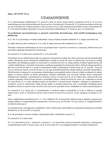 Sygn. akt III RC 76/14 UZASADNIENIE K. Z. reprezentujący małoletniego P. Z. pozwem z dnia 20 marca 2014r.wniósł o zasądzenie od M. Z. (1) na rzecz małoletniego powoda tytułem alimentów kwoty po 800 zł miesięcznie. Pozwana M. Z. (1) uznała powództwo do kwoty po 300 zł miesięcznie. Postanowieniem z dnia 25 marca 2014 r. Sąd zabezpieczył powództwo przez zobowiązanie M. Z. (1) do łożenia tytułem alimentów na koszty utrzymania małoletniego P. Z. kwoty po 400,-zł. miesięcznie. Na podstawie zgromadzonego w sprawie materiału dowodowego, Sąd ustalił następujący stan faktyczny. K. Z. i M. Z. (1) pozostają w związku małżeńskim. Z tego związku pochodzi małoletni P. Z. mający szesnaście lat. (d. odpis skrócony aktu urodzenia P. Z. k. 5 akt, d. odpis skrócony aktu małżeństwa k. 6 akt) Pomiędzy rodzicami małoletniego nie toczy się postępowanie w sprawie o rozwód czy o separacje, jednak strony nie prowadzą wspólnego gospodarstwa domowego. (d. zeznania K. Z. k.38,64 akt, zeznania M. Z. (1) k.39,65 akt) Od sierpnia 2013r. małoletni pozostaje na wyłącznym utrzymaniu swojego ojca, który sprawuje nad nim bezpośrednią opiekę. Miesięczny koszt utrzymania małoletniego oscyluje na kwotę ok. 1500 zł miesięcznie. Na kwotę tą według szacunków ojca składają się opłaty za wyżywienie w wysokości ok.700,-zł., zakup odzieży, środków higienicznych, jak i udział małoletniego w kosztach utrzymania wspólnego gospodarstwa domowego.Ojciec dokonał zakupu garnituru dla syna za kwotę ok. 680 zł. z uwagi na zakończenie nauki w gimnazjum, krawata koszt 50,-zł., koszuli – koszt ok 120 zł., dwóch par butów za kwotę ok.400,-zł., do tego dochodzą konieczne zakupy bielizny, koszulek, kosmetyków. Wśród kosztów związanych z utrzymaniem małoletniego wyszczególnić należy również wydatki na dojazdy do szkoły, opłaty za zabawę szkolną na koniec gimnazjum, komitet rodzicielski oraz wycieczki szkolne. Koszt wskazanych dodatkowych wydatków w przeliczeniu na miesiące wynosi w ocenie ojca ok. 30 zł. Nadto ojciec zapewnia dla syna wyjazdy wakacyjne, których koszt szacuje w przypadku pobytu w kraju na kwotę ok. 3000,-zł. a zagranicą na kwotę ok. 7000-8000,-zł. a w roku szkolnym zajęcia na basenie.K. Z. ponosi koszty związane z opłatami za mieszkanie w wysokości 719,24 zł. miesięcznie. Nadto ponosi opłaty za energię elektryczną, oraz w przypadku niedopłat ponosi dodatkowe koszty za zużycie wody. Za okres od 5 czerwca do 4 grudnia 2013 r. niedopłata za wodę wyniosła 383,96 zł. (d. zeznania K. Z. k. 38,64 akt, d. zawiadomienie o wysokości opłat za mieszkanie k. 8 akt, d. faktura za energię elektryczną k. 9 akt, d. rozliczenie zużycia wody za okres od 05.06-04.12.2013 k. 10 akt, paragony za zakupy k.11-17 akt). Ojciec małoletniego zatrudniony jest w (...) S.A. Oddział w W. na stanowisku elektromontera układów pomiarowych małego odbioru z wynagrodzeniem miesięcznym w kwocie 3773, 32 zł brutto. W 2013 roku K. Z. osiągnął dochód w wysokości 40625,39 zł. (d. zaświadczenie o zatrudnieniu i zarobkach k.7 akt, d. informacja o dochodach oraz pobranych zaliczkach na podatek dochodowy za rok 2013 PIT 11 k.59 akt) K. Z. nie pozostaje w nowym związku i zamieszkuje tylko z małoletnim synem P. Z.. (d. zeznania K. Z. k.38,64 akt). M. Z. (1) zatrudniona jest w Instytucie ,,Centrum (...) na stanowisku starszej sekretarki medycznej z miesięcznym wynagrodzeniem netto w kwocie 2054, 05 zł. W 2013 roku M. Z. (1) osiągnęła dochód w wysokości 26268,46 zł. (d. zaświadczenie o zatrudnieniu i zarobkach k.33 akt, d. zeznanie o wysokości osiągniętego dochodu w roku podatkowym 2013 PIT 37 k. 41-45 akt) Prowadzi samodzielne gospodarstwo domowe i nie pozostaje w nowym związku. Oprócz małoletniego syna nie posiada nikogo na swoim utrzymaniu. Ponosi koszty związane z wynajmem mieszkania o powierzchni ok. 50 m.2.Opłaca czynsz w wysokości ok. 792 zł., rachunki za gaz w wysokości od100-130 zł. oraz ich wyrównania za poszczególne okresy rozliczeniowe, które za okres od 1 sierpnia 2013 do 31 lipca 2014 r. wyniosło 481,21 zł. nadto opłaca rachunki za energie elektryczną w wysokości ok 103 zł. co dwa miesiące. M. Z. (1) opłaca bilet miesięczny w wysokości 160 zł. miesięcznie. Z małoletnim synem utrzymuje kontakt telefoniczny, sporadycznie małoletni odwiedza matkę. Wywiązuje się dotychczasowego zabezpieczenia alimentów w kwocie po 400 zł miesięcznie.M. Z. (1) koszty utrzymania syna szacuje na kwotę ok. 1200,-zł. miesięcznie. Poza zabezpieczonymi alimentami matka daje dla syna drobne prezenty przy okazji spotkań. M. Z. (1) łączne koszty swojego utrzymania szacuje na kwotę ok. 1300 zł. ( d. odpowiedź na pozew k. 31 akt, d. zeznania M. Z. (1) k.39, 65 akt, d. opłata za bilet miesięczny k. 35 akt, d. faktury za gaz k. 34,49-50,52-58 akt, faktura za energię elektryczną k.36,47-48 akt, d. miesięczne zestawienie kosztów najmu lokalu k. 37,46 akt, d. zeznania K. Z. k.65 akt). Sąd zważył co następuje: Zgodnie z dyspozycją art. 133 § 1 ustawy kodeks rodzinny i opiekuńczy rodzice obowiązani są do świadczeń alimentacyjnych względem dziecka, które nie jest jeszcze w stanie utrzymać się samodzielnie. Niezdolne do samodzielnego utrzymania się dzieci mają prawo do równej stopy życiowej z rodzicami, którzy obowiązani są podzielić się z nimi nawet skromnymi dochodami. Z kolei art. 135 § 1 k.r. i op. stanowi, że zakres świadczeń alimentacyjnych zależy od usprawiedliwionych potrzeb uprawnionego oraz zarobkowych i majątkowych możliwości zobowiązanego. Co do zasady powództwo zasługuje nauwzględnienie. Kwestią sporną była wysokość kwoty przyznanych alimentów. W niniejszej sprawie wskazać należy, iż kwota wskazana przez pozwaną jest kwotą niewystarczającą i nie znajduje uzasadnienia w zgromadzonym materiale dowodowym. Na uwagę zasługuje fakt, iż M. Z. (1) p