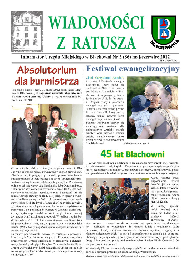 WIADOMOŚCI Z RATUSZA Informator Urzędu Miejskiego w Blachowni Nr 3 (86) maj/czerwiec 2012 ISSN 1730-9190 Absolutorium dla burmistrza Podczas ostatniej sesji, 30 maja 2012 roku Rada Miejska w Blachowni jednogłośnie udzieliła absolutorium Burmistrzowi Anetcie Ujmie z tytułu wykonania budżetu za rok 2011. Festiwal ewangelizacyjny „Pod skrzydłami Anioła”, to nazwa I Festiwalu ewangelizacyjnego, który odbył się 28 kwietnia 2012 r. w parafii św. Michała Archanioła w Blachowni. Szczególnym gościem festiwalu był J. E. ks. bp Antoni Długosz znany z „Ziarna” i ewangelizacyjnych piosenek. „Staramy się realizować prośbę bł. Jana Pawła II, który prosił, abyśmy szukali nowych form ewangelizacji” – mówił Gość. Podczas Festiwalu odbyło się rozstrzygnięcie konkursu dla najmłodszych „Aniołki malują anioły”, oraz licytacja obrazu anioła, namalowanego przez dzieci ze Szkoły Podstawowej nr 1 w Blachowni. dokończenie na str. 4 45 lat Blachowni Oznacza to, że publiczne pieniądze w gminie i mieście Blachownia są według radnych wydawane w sposób prawidłowy. Absolutorium, to przyjęcie przez radę sprawozdania burmistrza z realizacji ubiegłorocznego budżetu i stwierdzenie prawidłowości wydawania publicznych pieniędzy. Pozytywną opinię w tej sprawie wydała Regionalna Izba Obrachunkowa. Taka opinia jest corocznie wydawana przez RIO i jest podstawowym warunkiem absolutoryjnym. Zastrzeżeń też nie miała Komisja Rewizyjna Rady Miejskiej. W sprawie wykonania budżetu gminy za 2011 rok stanowisko swoje przedstawił także Klub Radnych „Razem dla Gminy Blachownia”. „Dostrzegamy wysoką dynamikę dochodów i wydatków w porównaniu do poprzednich budżetów. Znaczny zakres rzeczowy wykonanych zadań w skali dotąd nierealizowanej zwłaszcza w infrastrukturze drogowej. W realizacji zadań budżetowych za 2011 rok doceniamy starania pani Burmistrz i jej pracowników” – czytamy w przedstawionym stanowisku Klubu. (Pełne teksty wszystkich opinii dostępne na stronie internetowej: bip.net.pl) Burmistrz podziękowała radnym za zaufanie, a pracownikom Urzędu Miejskiego za ich pracę. „Dziękuję wszystkim pracownikom Urzędu Miejskiego w Blachowni i dyrektorom jednostek podległych Urzędowi” - mówiła Anetta Ujma. „Praca wszystkich tych ludzi pokazuje, że gmina i miasto się rozwijają, pozyskują środki i że na tym terenie jest coraz więcej inwestycji”. (f) W tym roku Blachownia obchodzi 45-lecie nadania praw miejskich. Uroczystości jubileuszowe trwały trzy dni. 15 czerwca odbyła się uroczysta sesja Rady, w której uczestniczyli mieszkańcy, przedstawiciele sołectw, burmistrzowie, posłowie, przedstawiciele władz województwa i kościoła oraz wielu innych instytucji. Każda rocznica budzi wspomnienia, skłania do refleksji i oceny przeszłości. Istotne wydarzenia z przeszłości przypomnieli burmistrz Anetta Ujma i przewodniczący Henryk Kania. W każdej społeczności lokalnej pojawiają się ludzie i organizacje, których aktywność, obywatelska postawa i zaangażowanie w rozwój tej społeczności są dostrzegane i zasługują na wyróżnienie. Są również ludzie i organizacje, które przynoszą chwałę swojemu środowisku poprzez wybitne osiągnięcia w różnych dziedzinach życia i z pasją i zaangażowaniem działają dla dobra publicznego. Sesja była okazją do wręczenia im okolicznościowych podziękowań. Drugi dzień urodzin upłynął pod znakiem zabaw Rodeo Piknik Country, które zorganizowano nad zalewem. W niedzielę 17 czerwca obchody rozpoczęła Msza Jubileuszowa za mieszkańców, celebrowana przez ks. dziekana Andrzeja Walaszczyka. Relacje z przebiegu obchodów jubileuszu przedstawiamy w dodatku wewnątrz numeru Zapisane przez historiç W ramach obchodów 45-lecia nadania praw miejskich Blachowni w archiwach rodzinnych mieszkańców Blachowni „odnaleziony” został autor i laureat konkursu z 1967 r. na wizualizację herbu Blachowni. Spotkaliśmy się z Romanem Kawelczykiem, którego projekt został uznany za oficjalny herb miasta. Wspomnienia tamtych lat prezentujemy w dzisiejszym wydaniu „Wiadomości z Ratusza”. Wiadomości z Ratusza: Dzień dobry Panie Romanie. Roman Kawelczyk: Dzień dobry, proszę mówić mi po imieniu jestem Roman. W z R: Bardzo proszę. Spotkaliśmy się dzisiaj po otrzymaniu od Ciebie e-maila z informacją, że to właśnie Ty jesteś autorem wizualizacji naszego herbu. R K: Tak to prawda. 45 lat temu ogłoszono konkurs na projekt herbu Blachowni. Narysowałem i wygrałem. W z R: To tak w jednym zdaniu, ale czy chciałbyś przybliżyć dzisiaj naszym mieszkańcom, jak było, ile miałeś wówczas lat, jak przebiegał konkurs i jaka była rywalizacja? R K: Urodziłem się w 1958 roku, mieszkałem w Blachowni w bloku przy ul. Żeromskiego 12. Chodziłem, oj przepraszam, uczyłem się, a dzisiaj można powiedzieć pogłębiałem wiedzę w Szkole Podstawowej nr 2. Obecnie w budynku mojej szkoły znajduje się Gimnazjum. Pamiętam, że dyrektorem szkoły był p. Roman Sikora, a moją wychowawczynią była Pani Słowińska nauczyciel geografii. Był rok 1967 Blachownia miała otrzymać prawa miejskie. Wówczas w Blachowni były dwie szkoły podstawowe i jedna szkoła zawodowa przy hucie Blachownia - Odlewnia Blachownia, później ZEM Blachownia. Ogłoszono konkurs plastyczny na obraz herbu Miasta Blachownia. W ośrodkach edukacyjnych, w szkołach młodzież na zajęciach plastycznych rysowała swoje wizje i propozycje herbu. Miałem skończone dziewięć lat i szczęście – moja propozycja została wyróżniona i w pierwszym etapie konkursu otrzymałem nominację z poziomu swojej szkoły. Następnie najlepsze prace zostały wystawione w świetlicy Szkoły Podstawowej nr 1. Pamiętam, że już na tym etapie byłem szczęśliwy tym wyróżnieniem, ale to nie koniec. Zostały wybrane trzy najlepsze rysunki i wysłane do powiatu. W tej trójce była moja propozycja herbu