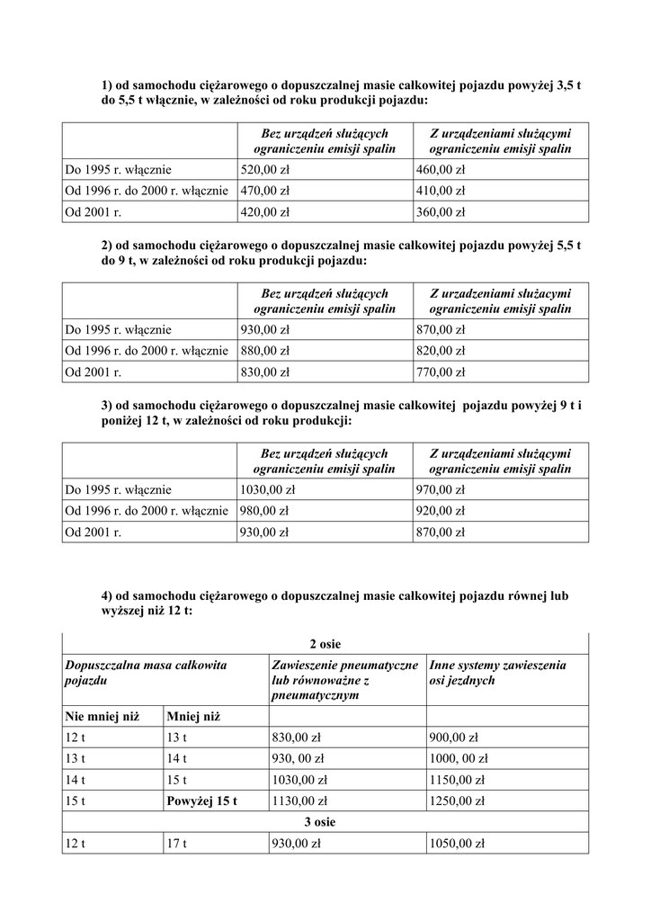 1) od samochodu ciężarowego o dopuszczalnej masie całkowitej pojazdu powyżej 3,5 t do 5,5 t włącznie, w zależności od roku produkcji pojazdu: Bez urządzeń służących ograniczeniu emisji spalin Do 1995 r. włącznie Z urządzeniami służącymi ograniczeniu emisji spalin 520,00 zł 460,00 zł Od 1996 r. do 2000 r. włącznie 470,00 zł 410,00 zł Od 2001 r. 360,00 zł 420,00 zł 2) od samochodu ciężarowego o dopuszczalnej masie całkowitej pojazdu powyżej 5,5 t do 9 t, w zależności od roku produkcji pojazdu: Bez urządzeń służących ograniczeniu emisji spalin Do 1995 r. włącznie Z urzadzeniami służacymi ograniczeniu emisji spalin 930,00 zł 870,00 zł Od 1996 r. do 2000 r. włącznie 880,00 zł 820,00 zł Od 2001 r. 770,00 zł 830,00 zł 3) od samochodu ciężarowego o dopuszczalnej masie całkowitej pojazdu powyżej 9 t i poniżej 12 t, w zależności od roku produkcji: Bez urządzeń służących ograniczeniu emisji spalin Do 1995 r. włącznie 1030,00 zł Z urządzeniami służącymi ograniczeniu emisji spalin 970,00 zł Od 1996 r. do 2000 r. włącznie 980,00 zł 920,00 zł Od 2001 r. 870,00 zł 930,00 zł 4) od samochodu ciężarowego o dopuszczalnej masie całkowitej pojazdu równej lub wyższej niż 12 t: 2 osie Dopuszczalna masa całkowita pojazdu Zawieszenie pneumatyczne Inne systemy zawieszenia lub równoważne z osi jezdnych pneumatycznym Nie mniej niż Mniej niż 12 t 13 t 830,00 zł 900,00 zł 13 t 14 t 930, 00 zł 1000, 00 zł 14 t 15 t 1030,00 zł 1150,00 zł 15 t Powyżej 15 t 1130,00 zł 1250,00 zł 3 osie 12 t 17 t 930,00 zł 1050,00 zł 2 osie 17 t 19 t 980,00 zł 1150,00 zł 19 t 21 t 1030,00 zł 1250,00 zł 21 t 23 t 1080,00 zł 1350,00 zł 23 t 25 t 1130,00 zł 1500,00 zł 25 t Powyżej 25 t 1230,00 zł 1550,00 zł 4 osie i więcej 12 t 25 t 1030,00 zł 1250,00 zł 25 t 27 t 1130,00 zł 1350,00 zł 27 t 29 t 1230,00 zł 1550,00 zł 29 t 31 t 1530,00 zł 2350,00 zł 31 t Powyżej 31 t 1830,00 zł 2450,00 zł 5) od ciągnika siodłowego i balastowego przystosowanego do używania łącznie z naczepą lub przyczepą o dopuszczalnej masie całkowitej zespołu pojazdów powyżej 3,5 t i poniżej 12 t, w zależności od roku produkcji pojazdu: Bez urządzeń służących ograniczeniu emisji spalin Z urządzeniami służącymi ograniczeniu emisji spalin Do 1995r. włącznie 1040,00 zł 980,00 zł Od 1996r. do 2000r. włącznie 990,00 zł 930,00 zł Od 2001r. 940,00 zł 880,00 zł 6) od ciągnika siodłowego i balastowego przystosowanego do używania łącznie z naczepą lub przyczepą o dopuszczalnej masie całkowitej zespołu pojazdów równej lub wyższej niż 12 t: 2 osie Dopuszczalna masa całkowita Zawieszenie pneumatyczne lub Inne systemy zawieszenia osi zespołu pojazdów równoważne jezdnych Nie mniej niż Mniej niż 12 t 18 t 1130,00 zł 1140,00 zł 18 t 25 t 1180,00 zł 1240,00 zł 25 t 31 t 1230,00 zł 1440,00 zł 31 t Powyżej 31 t 1430,00 zł 1840,00 zł 3 osie i więcej Dopuszczalna masa całkowita Zawieszenie pneumatyczne lub zespołu pojazdu równoważne Inne systemy zawieszenia osi jezdnych 12 t 40 t 1440,00 zł 1650,00 zł 40 t Powyżej 40 t 1640,00 zł 2350,00 zł 7) od przyczep i naczep, które łącznie z pojazdem silnikowym posiadają dopuszczalną masę całkowitą od 7 t i poniżej 12t, z wyjątkiem związanych wyłącznie z działalnością rolniczą prowadzoną przez podatnika podatku rolnego, w zależności od roku produkcji przyczepy: Dopuszczalna masa całkowita zespołu pojazdu Bez urządzeń służących ograniczeniu emisji spalin Z urządzeniami służącymi ograniczeniu emisji spalin Do 1995 roku włącznie 660,00 zł 600,00 zł Od 1996 r. do 2000 r. włącznie 610,00 zł 550,00 zł Od 2001 r. 500,00 zł 560,00 zł 8) od przyczep i naczep, które łącznie z pojazdem silnikowym posiadają dopuszczalną masę całkowitą zespołu równą lub wyższą niż 12t, z wyjątkiem związanych z działalnością rolniczą prowadzoną przez podatnika podatku rolnego: Nie mniej niż Mniej niż 1 oś Zawieszenie pneumatyczne lub Inne systemy zawieszenia osi równoważne jezdnych 12 t 18 t 620,00 zł 680,00 zł 18 t 25 t 670,00 zł 730,00 zł 25 t Powyżej 25 t 720,00 zł 830,00 zł Nie mniej niż Mniej niż 2 osie Zawieszenie pneumatyczne lub Inne systemy zawieszenia osi równoważne jezdnych 12 t 28 t 720,00 zł 780,00 zł 28 t 33 t 770,00 zł 830,00 zł 33 t 38 t 830,00 zł 1240,00 zł 38 t Powyżej 38 t 1130,00 zł 1640,00 zł Nie mniej niż Mniej niż 3 osie i więcej Zawieszenie pneumatyczne lub Inne systemy zawieszenia osi równoważne jezdnych 12 t 38 t 1230,00 zł 1340,00 zł 38 t Powyżej 38 t 1330,00 zł 1440,00 zł 9) od autobusów o liczbie miejsc do siedzenia mniejszej niż 30 miejsc, w zależności od roku produkcji pojazdu: Bez urządzeń służących ograniczeniu emisji spalin Z urzadzeniami służącymi ograniczeniu emisji spalin Do 1995 r. włącznie 1350,00 zł 1240,00 zł Od 1996 r. do 2000 włącznie 1250,00 zł 1140,00 zł Od 2001 r. 1150,00 zł 1040,00 zł 10) od autobusów o liczbie miejsc do siedzenia równej lub wyższej niż 30 miejsc, w zależności od roku produkcji pojazdu: Bez urządzeń służących ograniczeniu emisji spalin Z urzadzeniami służącymi ograniczeniu emisji spalin 1550,00 zł 1440,00 zł Od 1996 r. do 2000 r. włącznie 1450,00 zł 1340,00 zł Od 2001 r. 1240,00 zł Do 1995 r. włącznie 1350,00 zł