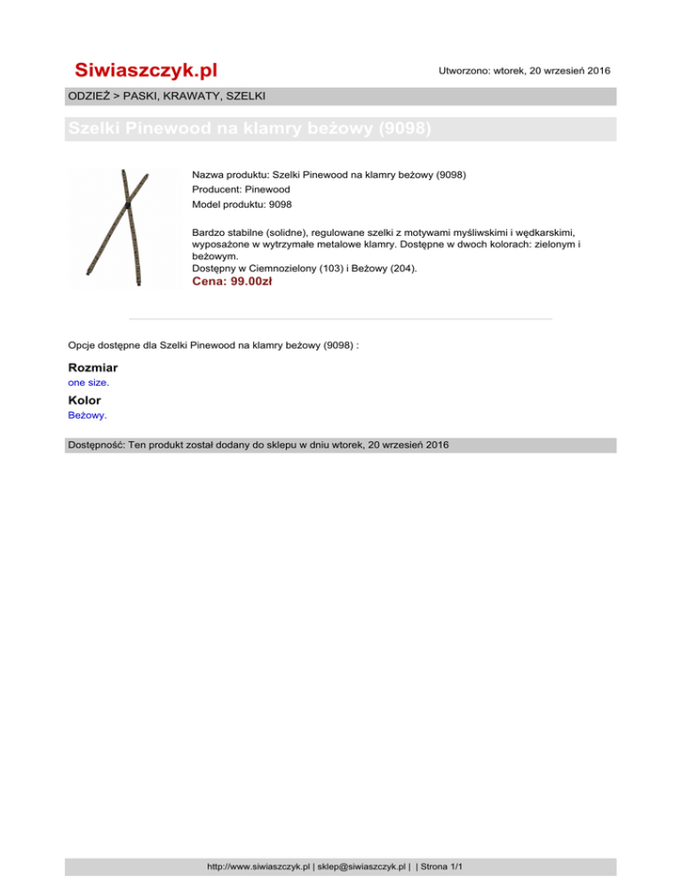 Siwiaszczyk.pl Utworzono: wtorek, 20 wrzesień 2016 ODZIEŻ > PASKI, KRAWATY, SZELKI Szelki Pinewood na klamry beżowy (9098) Nazwa produktu: Szelki Pinewood na klamry beżowy (9098) Producent: Pinewood Model produktu: 9098 Bardzo stabilne (solidne), regulowane szelki z motywami myśliwskimi i wędkarskimi, wyposażone w wytrzymałe metalowe klamry. Dostępne w dwoch kolorach: zielonym i beżowym. Dostępny w Ciemnozielony (103) i Beżowy (204). Cena: 99.00zł Opcje dostępne dla Szelki Pinewood na klamry beżowy (9098) : Rozmiar one size. Kolor Beżowy. Dostępność: Ten produkt został dodany do sklepu w dniu wtorek, 20 wrzesień 2016 http://www.siwiaszczyk.pl | [email protected] | | Strona 1/1