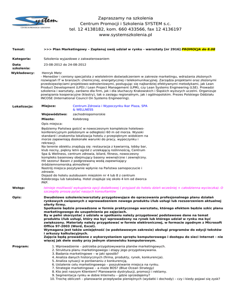 Zapraszamy na szkolenia Centrum Promocji i Szkolenia SYSTEM s.c. tel. 12 4138182, kom. 660 433566, fax 12 4136197 www.systemszkolenia.pl Temat: >>> Plan Marketingowy – Zaplanuj swój udział w rynku - warsztaty [nr 2916] PROMOCJA do 8.08 Kategoria: Szkolenia wyjazdowe z zakwaterowaniem Data szkolenia: 23-08-2012 do 24-08-2012 Wykładowcy: Lokalizacja: Henryk HenrykMetz Metz - -Menedżer Menedżeri iceniony cenionyspecjalista specjalistazzwieloletnim wieloletnimdoświadczeniem doświadczeniemwwzakresie zakresiemarketingu, marketingu,wdrażania wdrażaniazłożonych złożonych rozwiązań rozwiązańITITwwbranżach: branżach:chemicznej, chemicznej,energetycznej energetyczneji itelekomunikacyjnej. telekomunikacyjnej.Zarządza Zarządzaprojektami projektamioraz orazzłożonymi złożonymi przedsięwzięciami przedsięwzięciamiprojektowo-wdrożeniowymi, projektowo-wdrożeniowymi,posługując posługującsię sięnajbardziej najbardziejefektywnymi efektywnymimetodykami, metodykami,jak jakLean Lean Product ProductDevelopment Development(LPD) (LPD)/ /Lean LeanProject ProjectManagement Management(LPM), (LPM),czy czyLean LeanSystems SystemsEngineering Engineering(LSE). (LSE).Prowadzi Prowadzi szkolenia szkoleniai iwarsztaty, warsztaty,zarówno zarównodla dlafirm, firm,jak jaki idla dlasłuchaczy słuchaczyKrakowskich Krakowskichi iŚląskich Śląskichwyższych wyższychuczelni. uczelni.Organizuje Organizuje powiązania powiązaniakooperacyjne kooperacyjne(klastry), (klastry),tak takoozasięgu zasięguregionalnym, regionalnym,jak jaki iogólnopolskim. ogólnopolskim.Prezes PrezesPolskiego PolskiegoOddziału Oddziału INCOSE INCOSE(International (InternationalCouncil CouncilOn OnSystems SystemsEngineering). Engineering). Miejsce: Miejsce: Centrum Zdrowia i Wypoczynku Ikar Plaza, SPA Centrum Zdrowia i Wypoczynku Ikar Plaza, SPA && WELLNESS WELLNESS Województwo: Województwo: zachodniopomorskie zachodniopomorskie Miasto: Kołobrzeg Miasto: Kołobrzeg Opis miejsca: Opis miejsca: Będziemy Państwa gościć ww nowoczesnym kompleksie hotelowoBędziemy Państwa gościć nowoczesnym kompleksie hotelowokonferencyjnym położonym ww odległości 6060 mm odod morza. Wysoki konferencyjnym położonym odległości morza. Wysoki standard i znakomita lokalizacja hotelu z przepięknym widokiem nana standard i znakomita lokalizacja hotelu z przepięknym widokiem morze zapewniają doskonałe warunki dodo pracy, wypoczynku i i morze zapewniają doskonałe warunki pracy, wypoczynku rekreacji. rekreacji. NaNa terenie obiektu znajdują się: restauracja z kawiarnią, lobby bar, terenie obiektu znajdują się: restauracja z kawiarnią, lobby bar, klub nocny, piękny letni ogród z urzekającą roślinnością, Centrum klub nocny, piękny letni ogród z urzekającą roślinnością, Centrum Spa && Wellness, centrum zdrowia, bilard, fitness, nowoczesny Spa Wellness, centrum zdrowia, bilard, fitness, nowoczesny kompleks basenowy obejmujący baseny wewnętrzne i zewnętrzny. kompleks basenowy obejmujący baseny wewnętrzne i zewnętrzny. HitHit sezonu! Basen z podgrzewaną wodą zapewniający sezonu! Basen z podgrzewaną wodą zapewniający śródziemnomorską atmosferę! śródziemnomorską atmosferę! Nastrój miejsca pozytywnie wpłynie nana Państwa samopoczucie i i Nastrój miejsca pozytywnie wpłynie Państwa samopoczucie zdrowie. zdrowie. Dojazd dodo hotelu autobusem miejskim nrnr 44 lub 88 z centrum Dojazd hotelu autobusem miejskim lub z centrum Kołobrzegu lub taksówką. Hotel znajduje sięsię około 44 km odod dworca Kołobrzegu lub taksówką. Hotel znajduje około km dworca PKP. PKP. Wstęp: Istnieje możliwość wykupienia opcji dodatkowej ( przyjazd do hotelu dzień wcześniej + całodzienna wycieczka). O szczegóły proszę pytać naszych konsultantów Opis: Dwudniowe szkolenie/warsztaty przygotowujące do opracowania profesjonalnego planu działań rynkowych związanych z wprowadzeniem nowego produktu i/lub usługi lub rozszerzeniem aktualnej oferty firmy. Spotkanie będzie prowadzone w formie praktycznego warsztatu, którego efektem będzie szkic planu marketingowego do uzupełnienia po zajęciach. By w pełni skorzystać z udziału w spotkaniu należy przygotować podstawowe dane na temat produktu i/lub usługi, który ma być wprowadzony na rynek lub którego udział w rynku ma być zwiększony. Materiały należy przygotować w formie elektronicznej, w formacie zgodnym z Microsoft Office 97-2003 (Word, Excel). Wymagana jest także umiejętność (w podstawowym zakresie) obsługi programów do edycji tekstów i arkuszy kalkulacyjnych. Zajęcia będą prowadzone z wykorzystaniem sprzętu komputerowego i dostępu do sieci Internet - nie więcej jak dwie osoby przy jednym stanowisku komputerowym. Program: 1. Wprowadzenie – potrzeba przygotowywania planów marketingowych. 2. Struktura planu marketingowego i etapy jego przygotowywania. 3. Badania marketingowe – w jaki sposób? 4. Analiza danych historycznych (firma, produkty, rynek, konkurencja). 5. Analiza sytuacji w porównaniu z konkurencją. 6. Ustalenie celu marketingowego – poszukiwanie miejsca na rynku. 7. Strategie marketingowe – a może BOS? (Blue Ocean Strategy) 8. Kto jest naszym Klientem? Planowanie dystrybucji, promocji i reklamy. 9. Segmentacja rynku w dobie Internetu – gdzie sprzedajemy? 10. Trochę obliczeń – planowanie przepływów pieniężnych (wydatki i dochody) – czy i kiedy pojawi się zysk? 11. Przygotowanie planu marketingowego – jak go przedstawić? 12. Podanie planu marketingowego do wiadomości. Forma szkolenia: Szkolenie o powyższej tematyce możemy zrealizować na Państwa potrzeby w formie szkolenia zamkniętego. Zainteresowane osoby prosimy o kontakt z naszym biurem tel. (12) 413-81-82 Metodologia: Zajęcia są w pełni interaktywne. Ich celem jest udzielenie praktycznej pomocy w przygotowaniu dobrego planu marketingowego. Zajęcia nie są zorientowane na przekazywanie wiedzy teoretycznej. Przynieść s