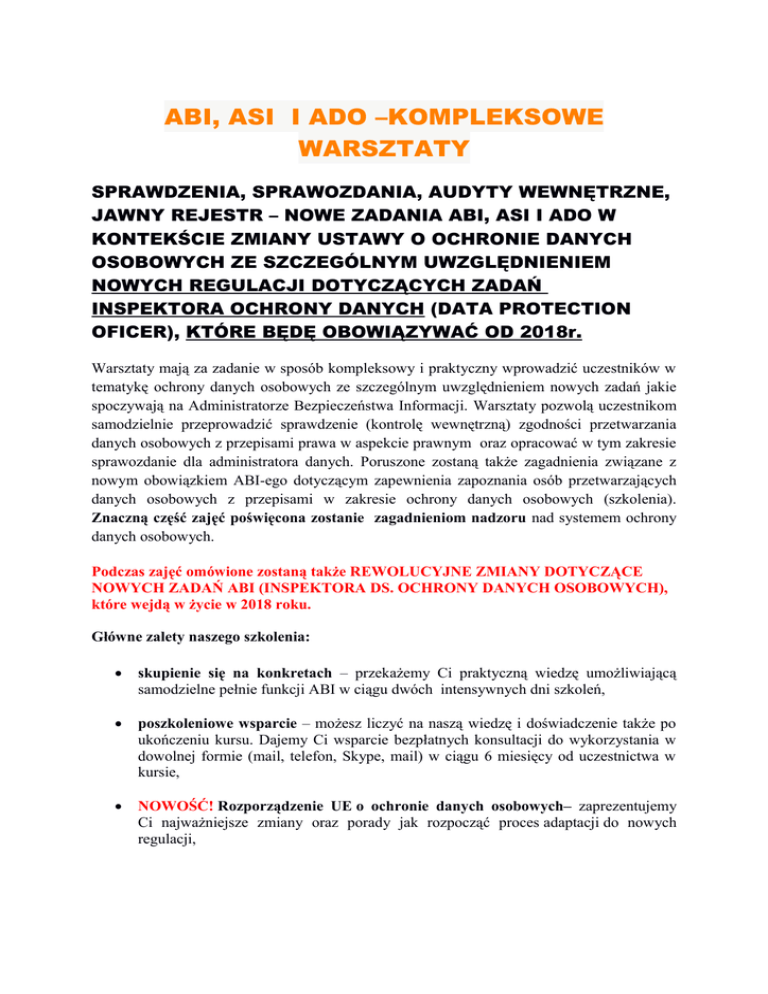 ABI, ASI I ADO –KOMPLEKSOWE WARSZTATY SPRAWDZENIA, SPRAWOZDANIA, AUDYTY WEWNĘTRZNE, JAWNY REJESTR – NOWE ZADANIA ABI, ASI I ADO W KONTEKŚCIE ZMIANY USTAWY O OCHRONIE DANYCH OSOBOWYCH ZE SZCZEGÓLNYM UWZGLĘDNIENIEM NOWYCH REGULACJI DOTYCZĄCYCH ZADAŃ INSPEKTORA OCHRONY DANYCH (DATA PROTECTION OFICER), KTÓRE BĘDĘ OBOWIĄZYWAĆ OD 2018r. Warsztaty mają za zadanie w sposób kompleksowy i praktyczny wprowadzić uczestników w tematykę ochrony danych osobowych ze szczególnym uwzględnieniem nowych zadań jakie spoczywają na Administratorze Bezpieczeństwa Informacji. Warsztaty pozwolą uczestnikom samodzielnie przeprowadzić sprawdzenie (kontrolę wewnętrzną) zgodności przetwarzania danych osobowych z przepisami prawa w aspekcie prawnym oraz opracować w tym zakresie sprawozdanie dla administratora danych. Poruszone zostaną także zagadnienia związane z nowym obowiązkiem ABI-ego dotyczącym zapewnienia zapoznania osób przetwarzających danych osobowych z przepisami w zakresie ochrony danych osobowych (szkolenia). Znaczną część zajęć poświęcona zostanie zagadnieniom nadzoru nad systemem ochrony danych osobowych. Podczas zajęć omówione zostaną także REWOLUCYJNE ZMIANY DOTYCZĄCE NOWYCH ZADAŃ ABI (INSPEKTORA DS. OCHRONY DANYCH OSOBOWYCH), które wejdą w życie w 2018 roku. Główne zalety naszego szkolenia: skupienie się na konkretach – przekażemy Ci praktyczną wiedzę umożliwiającą samodzielne pełnie funkcji ABI w ciągu dwóch intensywnych dni szkoleń, poszkoleniowe wsparcie – możesz liczyć na naszą wiedzę i doświadczenie także po ukończeniu kursu. Dajemy Ci wsparcie bezpłatnych konsultacji do wykorzystania w dowolnej formie (mail, telefon, Skype, mail) w ciągu 6 miesięcy od uczestnictwa w kursie, NOWOŚĆ! Rozporządzenie UE o ochronie danych osobowych– zaprezentujemy Ci najważniejsze zmiany oraz porady jak rozpocząć proces adaptacji do nowych regulacji, praktyczny charakter kursu – nasz trener sprawuje funkcję ABI u klientów z różnych branż. Dlatego podczas szkolenia nie teoretyzujemy – każdy przepis prawa konfrontujemy z praktyką i oferujemy Ci rozwiązania, a nie kolejne wątpliwości, warsztaty – nasz kurs to nie wykład, a interaktywne szkolenie. Podczas kursu kilkukrotnie będziesz mieć okazję samodzielnie zweryfikować zdobytą wiedzę z praktyką np. tworząc Jawny Rejestr Zbiorów, szkic Polityki Bezpieczeństwa, czy planu sprawdzeń, certyfikat – po szkoleniu otrzymasz certyfikat potwierdzający uczestnictwo w kursie. Certyfikat jest jedną z podstaw do legitymowania się przez ABI odpowiednią wiedzą z zakresu ochrony danych osobowych, zgodnie z art. 39a znowelizowanej ustawy., wzory dokumentacji – otrzymasz wzory prawem wymaganej dokumentacji. Otrzymasz: Politykę bezpieczeństwa, Instrukcję zarządzania systemami informatycznymi, klauzule informacyjne, umowy powierzenia, upoważnienia, klauzule zgód na przetwarzanie danych osobowych, Jawny Rejestr Zbiorów ABI, szkolenie dla pracowników w formie prezentacji, formularz zgłoszenia oraz odwołania ABI i ASI, wykaz obowiązków ABI, sprawozdanie, plan sprawdzeń. Uczestnicy warsztatów otrzymają w formie elektronicznej wszystkie nowe, niezbędne wzory prawem wymaganej dokumentacji oraz wzory planu sprawdzeń, sprawozdań, wewnętrznego rejestru, przykładowe wystąpienia GIODO do ABI-ego i wielu innych. I DZIEŃ I. WPROWADZENIE 1. Czym są dane osobowe 2. Co to jest zbiór danych osobowych? 3. Różnica między danymi zwykłymi a danymi wrażliwymi, 4. Przesłanki legalności przetwarzania danych osobowych, 5. Podział obowiązków – ADO,ABI,ASI. II. USYTUOWANIE ABI W ORGANIZACJI W KONTEKŚCIE NOWYCH UREGULOWAŃ PRAWNYCH 1. Jak przekonać administratora danych, że ABI to zysk dla firmy? Przed czym uchroni profesjonalny ABI, co oraz ile zyskamy. 2. Kto może pełnić funkcję ABI. Prawnik czy informatyk a może zupełnie kto inny? 3. Czy ASI może być ABI? 4. ABI w hierarchii organizacji. Pierwsze problemy po wejściu w życie zmienionych przepisów. (komu i na jakich zasadach podlegać będzie ABI w ramach organizacji) III. CZY WARTO POWOŁYWAĆ ABI-ego? 1. Wady i zalety posiadania ABI lub braku ABI 2. Alternatywa: powołanie innej funkcji związanej z ochroną danych osobowych np. pełnomocnika lub koordynatora ds. ochrony danych osobowych Warsztaty- jak należy powołać i wskazać zakres obowiązków koordynatora ds. ochrony danych osobowych IV. ABI, ZASTĘPCA ABI A OSOBA NIE WPISANA DO REJESTRU 1. Czy administrator danych, który nie powołał ABI przeprowadza sprawdzenie czy audytuje? Jakie przepisy mają zastosowanie? 2. Jak powołać zastępcę ABI-ego. V. OBOWIĄZKI DLA ADO, KTÓRE NIE POWOŁAŁ ABI-ego VI. POWOŁANIE ABI IMPLIKUJĄCE OGRANICZENIE W ZGŁASZANIU ZBIORÓW DO GIODO, VII. ZADANIA ADMINISTRATORA BEZPIECZEŃSTWA INFORMACJI 1. Ocena legalności przetwarzania danych osobowych klientów i pracowników. (Kiedy należy pytać o zgodę na przetwarzanie danych osobowych, a kiedy takiej zgody unikać? W jaki sposób ewidencjonować zebrane zgody i sprzeciwy? Jak należy wypełnić obowiązek informacyjny?) Warsztat: opracowanie przykładowego obowiązku informacyjnego. 2. Powierzenie przetwarzania danych osobowych. (Kiedy należy podpisać umowę powierzenia przetwarzania danych osobowych. Udział ABI i jego rola w negocjacjach – na co zwracać uwagę. Czy różni się powierzenie od udostępnienia danych osobowych? 3. Przesłanki legalności przetwarzania danych osobowych VIII. ZADANIA ABI-ego NA GRUNCIE ZNOWELIZOWANEJ USTAWY 1. Nadzór nad prawidłowością przetwarzania danych i dokumentacją – jak to robić? 2. Zapewnienie zapoznania osób upoważnionych do przetwarzania danych osobowych z przepisami o ochronie danych osobowych – szkolenie, czy inne formy? Jeśli tak, to jak i kogo szkolić? Przykładowe testy do szkoleń 3. Prowadzenie rejestru zbiorów danych osobowych. 4. Prowadzenie regularnych audytów wewnętrznych (
