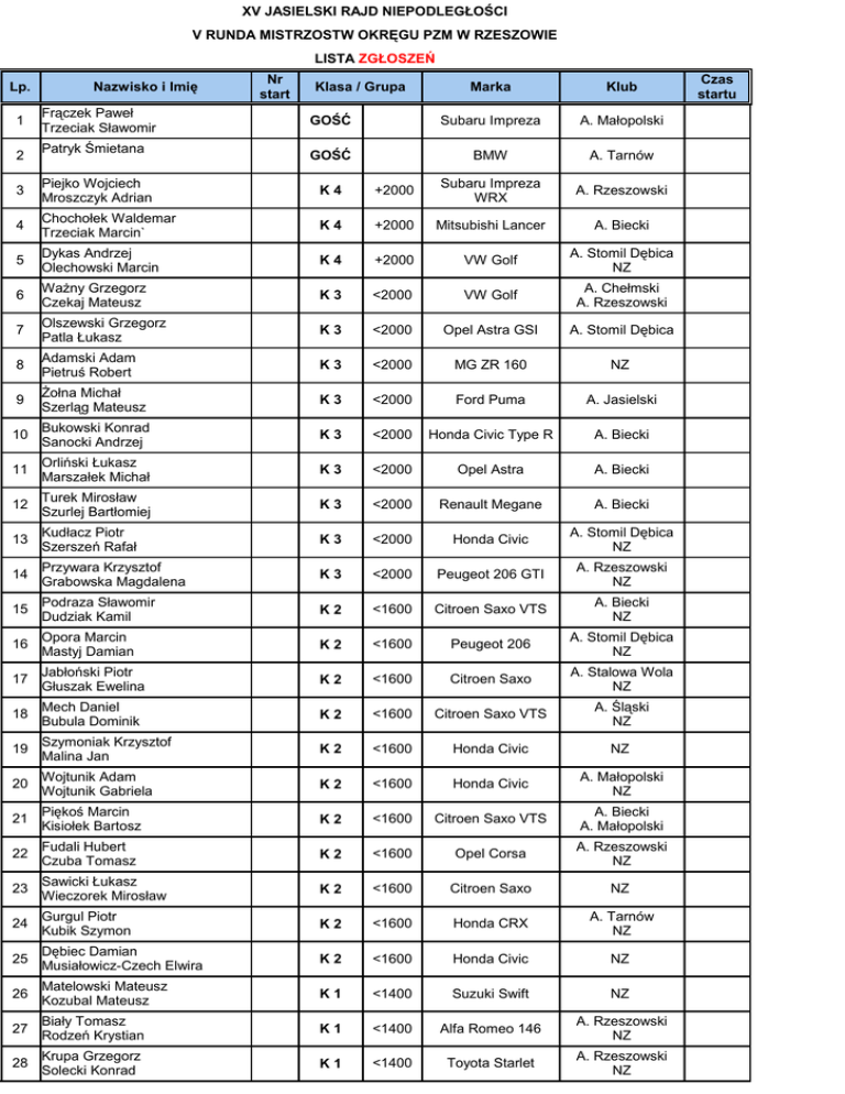 XV JASIELSKI RAJD NIEPODLEGŁOŚCI V RUNDA MISTRZOSTW OKRĘGU PZM W RZESZOWIE LISTA ZGŁOSZEŃ Lp. 1 2 Nazwisko i Imię Frączek Paweł Trzeciak Sławomir Patryk Śmietana Nr start Klasa / Grupa Marka Klub GOŚĆ Subaru Impreza A. Małopolski GOŚĆ BMW A. Tarnów 3 Piejko Wojciech Mroszczyk Adrian K4 +2000 Subaru Impreza WRX A. Rzeszowski 4 Chochołek Waldemar Trzeciak Marcin` K4 +2000 Mitsubishi Lancer A. Biecki 5 Dykas Andrzej Olechowski Marcin K4 +2000 VW Golf A. Stomil Dębica NZ 6 Ważny Grzegorz Czekaj Mateusz K3 <2000 VW Golf A. Chełmski A. Rzeszowski 7 Olszewski Grzegorz Patla Łukasz K3 <2000 Opel Astra GSI A. Stomil Dębica 8 Adamski Adam Pietruś Robert K3 <2000 MG ZR 160 NZ 9 Żołna Michał Szerląg Mateusz K3 <2000 Ford Puma A. Jasielski 10 Bukowski Konrad Sanocki Andrzej K3 <2000 Honda Civic Type R A. Biecki 11 Orliński Łukasz Marszałek Michał K3 <2000 Opel Astra A. Biecki 12 Turek Mirosław Szurlej Bartłomiej K3 <2000 Renault Megane A. Biecki 13 Kudłacz Piotr Szerszeń Rafał K3 <2000 Honda Civic A. Stomil Dębica NZ 14 Przywara Krzysztof Grabowska Magdalena K3 <2000 Peugeot 206 GTI A. Rzeszowski NZ 15 Podraza Sławomir Dudziak Kamil K2 <1600 Citroen Saxo VTS A. Biecki NZ 16 Opora Marcin Mastyj Damian K2 <1600 Peugeot 206 A. Stomil Dębica NZ 17 Jabłoński Piotr Głuszak Ewelina K2 <1600 Citroen Saxo A. Stalowa Wola NZ 18 Mech Daniel Bubula Dominik K2 <1600 Citroen Saxo VTS A. Śląski NZ 19 Szymoniak Krzysztof Malina Jan K2 <1600 Honda Civic NZ 20 Wojtunik Adam Wojtunik Gabriela K2 <1600 Honda Civic A. Małopolski NZ 21 Piękoś Marcin Kisiołek Bartosz K2 <1600 Citroen Saxo VTS A. Biecki A. Małopolski 22 Fudali Hubert Czuba Tomasz K2 <1600 Opel Corsa A. Rzeszowski NZ 23 Sawicki Łukasz Wieczorek Mirosław K2 <1600 Citroen Saxo NZ 24 Gurgul Piotr Kubik Szymon K2 <1600 Honda CRX A. Tarnów NZ 25 Dębiec Damian Musiałowicz-Czech Elwira K2 <1600 Honda Civic NZ 26 Matelowski Mateusz Kozubal Mateusz K1 <1400 Suzuki Swift NZ 27 Biały Tomasz Rodzeń Krystian K1 <1400 Alfa Romeo 146 A. Rzeszowski NZ 28 Krupa Grzegorz Solecki Konrad K1 <1400 Toyota Starlet A. Rzeszowski NZ Czas startu 29 Solecki Mariusz Turoń Patryk K1 <1400 Mazda 323 BG A. Rzeszowski 30 Pomprowicz Przemysław Sokołowski Daniel K1 <1400 Suzuki Swift A. Biecki A. Jasielski 31 Barzyk Mateusz Liana Krystian K1 <1400 Opel Corsa NZ 32 Wiszyński Arkadiusz Bodniak Mateusz K1 <1400 Peugeot 106 A. Biecki 33 Wronkowicz Jacek Orliński Wiesław K1 <1400 Peugeot 106 A Biecki 34 Skroban Marcin Wagner Jakub K1 <1400 Peugeot A. Biłgoraj 35 Potera Marcin Wojnicki Wojciech K1 <1400 Renault NZ 36 Niemiec Jerzy Saganowski Tomasz K Fiat SC A. Stalowa Wola 37 Jeziorski Olaf Jeziorski Krzysztof K Fiat SC NZ A. Stalowa Wola 38 Michałek Andrzej Rogala Magdalena K Fiat SC A. Stalowa Wola NZ 39 Bukała Mateusz Banek Joanna K Fiat SC A. Rzeszowski NZ 40 Styś Adrian Bawłowicz Grzegorz K Fiat CC Klub Motorowy Łańcut 41 Kawa Grzegorz Koba Rafał K Fiat SC A. Mielecki 42 Westrych-Krzanowski Kamil Zych Mateusz K Fiat SC A. Małopolski NZ 43 Bogusławski Aleksander Rusinek Tomasz K Fiat SC Sporting A. Chełmski NZ 44 Dunaj Ryszard Dunaj Kinga K Fiat CC A. Małopolski 45 Siedleczka Jakub Dziędziurko Tomasz K Fiat SC A. Rzeszowski 46 Florkiewicz Adam Panek Dariusz K Fiat CC A. Stomil Dębica NZ 47 Długosz Anna Mezei Martin K Fiat SC NZ 48 Sokołowski Piotr Dziok Weronika K Fiat 126 A. Jasielski 49 Niemiec Olaf Niemiec Artur K Fiat CC NZ K Fiat SC A. Rzeszowski 50 Solarz Karol Dyrektor KJS Kinga Wilczak