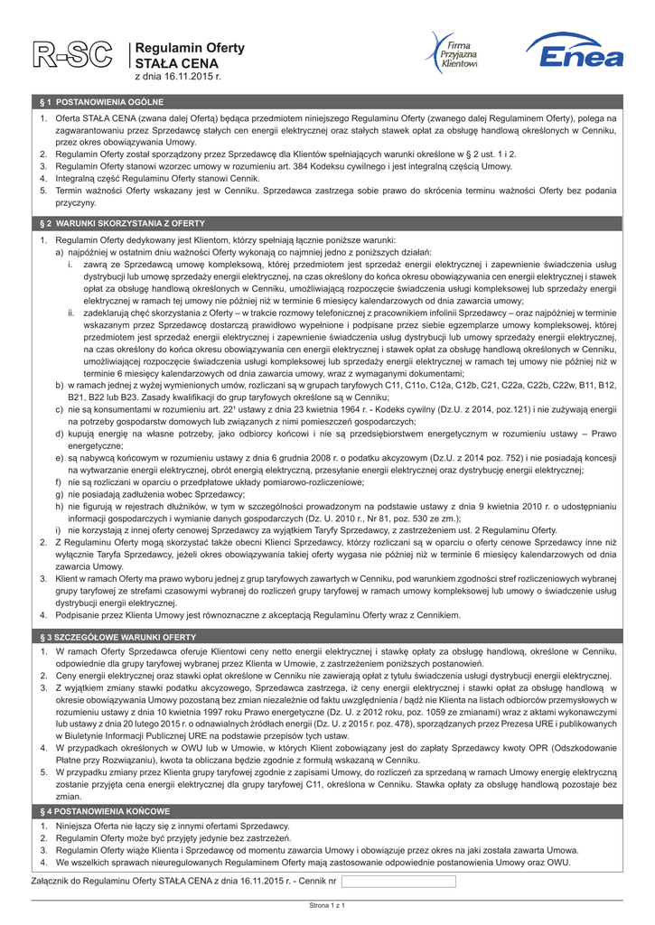 R-SC Regulamin Oferty STAŁA CENA z dnia 16.11.2015 r. § 1 POSTANOWIENIA OGÓLNE 1. Oferta STAŁA CENA (zwana dalej Ofertą) będąca przedmiotem niniejszego Regulaminu Oferty (zwanego dalej Regulaminem Oferty), polega na zagwarantowaniu przez Sprzedawcę stałych cen energii elektrycznej oraz stałych stawek opłat za obsługę handlową określonych w Cenniku, przez okres obowiązywania Umowy. 2. Regulamin Oferty został sporządzony przez Sprzedawcę dla Klientów spełniających warunki określone w § 2 ust. 1 i 2. 3. Regulamin Oferty stanowi wzorzec umowy w rozumieniu art. 384 Kodeksu cywilnego i jest integralną częścią Umowy. 4. Integralną część Regulaminu Oferty stanowi Cennik. 5. Termin ważności Oferty wskazany jest w Cenniku. Sprzedawca zastrzega sobie prawo do skrócenia terminu ważności Oferty bez podania przyczyny. § 2 WARUNKI SKORZYSTANIA Z OFERTY 1. Regulamin Oferty dedykowany jest Klientom, którzy spełniają łącznie poniższe warunki: a) najpóźniej w ostatnim dniu ważności Oferty wykonają co najmniej jedno z poniższych działań: i. zawrą ze Sprzedawcą umowę kompleksową, której przedmiotem jest sprzedaż energii elektrycznej i zapewnienie świadczenia usług dystrybucji lub umowę sprzedaży energii elektrycznej, na czas określony do końca okresu obowiązywania cen energii elektrycznej i stawek opłat za obsługę handlową określonych w Cenniku, umożliwiającą rozpoczęcie świadczenia usługi kompleksowej lub sprzedaży energii elektrycznej w ramach tej umowy nie później niż w terminie 6 miesięcy kalendarzowych od dnia zawarcia umowy; ii. zadeklarują chęć skorzystania z Oferty – w trakcie rozmowy telefonicznej z pracownikiem infolinii Sprzedawcy – oraz najpóźniej w terminie wskazanym przez Sprzedawcę dostarczą prawidłowo wypełnione i podpisane przez siebie egzemplarze umowy kompleksowej, której przedmiotem jest sprzedaż energii elektrycznej i zapewnienie świadczenia usług dystrybucji lub umowy sprzedaży energii elektrycznej, na czas określony do końca okresu obowiązywania cen energii elektrycznej i stawek opłat za obsługę handlową określonych w Cenniku, umożliwiającej rozpoczęcie świadczenia usługi kompleksowej lub sprzedaży energii elektrycznej w ramach tej umowy nie później niż w terminie 6 miesięcy kalendarzowych od dnia zawarcia umowy, wraz z wymaganymi dokumentami; b) w ramach jednej z wyżej wymienionych umów, rozliczani są w grupach taryfowych C11, C11o, C12a, C12b, C21, C22a, C22b, C22w, B11, B12, B21, B22 lub B23. Zasady kwalifikacji do grup taryfowych określone są w Cenniku; c) nie są konsumentami w rozumieniu art. 22¹ ustawy z dnia 23 kwietnia 1964 r. - Kodeks cywilny (Dz.U. z 2014, poz.121) i nie zużywają energii na potrzeby gospodarstw domowych lub związanych z nimi pomieszczeń gospodarczych; d) kupują energię na własne potrzeby, jako odbiorcy końcowi i nie są przedsiębiorstwem energetycznym w rozumieniu ustawy – Prawo energetyczne; e) są nabywcą końcowym w rozumieniu ustawy z dnia 6 grudnia 2008 r. o podatku akcyzowym (Dz.U. z 2014 poz. 752) i nie posiadają koncesji na wytwarzanie energii elektrycznej, obrót energią elektryczną, przesyłanie energii elektrycznej oraz dystrybucję energii elektrycznej; f) nie są rozliczani w oparciu o przedpłatowe układy pomiarowo-rozliczeniowe; g) nie posiadają zadłużenia wobec Sprzedawcy; h) nie figurują w rejestrach dłużników, w tym w szczególności prowadzonym na podstawie ustawy z dnia 9 kwietnia 2010 r. o udostępnianiu informacji gospodarczych i wymianie danych gospodarczych (Dz. U. 2010 r., Nr 81, poz. 530 ze zm.); i) nie korzystają z innej oferty cenowej Sprzedawcy za wyjątkiem Taryfy Sprzedawcy, z zastrzeżeniem ust. 2 Regulaminu Oferty. 2. Z Regulaminu Oferty mogą skorzystać także obecni Klienci Sprzedawcy, którzy rozliczani są w oparciu o oferty cenowe Sprzedawcy inne niż wyłącznie Taryfa Sprzedawcy, jeżeli okres obowiązywania takiej oferty wygasa nie później niż w terminie 6 miesięcy kalendarzowych od dnia zawarcia Umowy. 3. Klient w ramach Oferty ma prawo wyboru jednej z grup taryfowych zawartych w Cenniku, pod warunkiem zgodności stref rozliczeniowych wybranej grupy taryfowej ze strefami czasowymi wybranej do rozliczeń grupy taryfowej w ramach umowy kompleksowej lub umowy o świadczenie usług dystrybucji energii elektrycznej. 4. Podpisanie przez Klienta Umowy jest równoznaczne z akceptacją Regulaminu Oferty wraz z Cennikiem. § 3 SZCZEGÓŁOWE WARUNKI OFERTY 1. W ramach Oferty Sprzedawca oferuje Klientowi ceny netto energii elektrycznej i stawkę opłaty za obsługę handlową, określone w Cenniku, odpowiednie dla grupy taryfowej wybranej przez Klienta w Umowie, z zastrzeżeniem poniższych postanowień. 2. Ceny energii elektrycznej oraz stawki opłat określone w Cenniku nie zawierają opłat z tytułu świadczenia usługi dystrybucji energii elektrycznej. 3. Z wyjątkiem zmiany stawki podatku akcyzowego, Sprzedawca zastrzega, iż ceny energii elektrycznej i stawki opłat za obsługę handlową w okresie obowiązywania Umowy pozostaną bez zmian niezależnie od faktu uwzględnienia / bądź nie Klienta na listach odbiorców przemysłowych w rozumieniu ustawy z dnia 10 kwietnia 1997 roku Prawo energetyczne (Dz. U. z 2012 roku, poz. 1059 ze zmianami) wraz z aktami wykonawczymi lub ustawy z dnia 20 lutego 2015 r. o odnawialnych źródłach energii (Dz. U. z 2015 r. poz. 478), sporządzanych przez Prezesa URE i publikowanych w Biuletynie Informacji Publicznej URE na podstawie przepisów tych ustaw. 4. W przypadkach określonych w OWU lub w Umowie, w których Klient zobowiązany jest do zapłaty Sprzedawcy kwoty OPR (Odszkodowanie Płatne przy Rozwiązaniu), kwota ta obliczana będzie zgodnie z formułą wskazaną w Cenniku. 5. W przypadku zmiany przez Klienta grupy taryfowej zgodnie z zapisami Umowy, do rozliczeń za sprzedaną w ramach Umowy energię elektryczną zostanie przyjęta