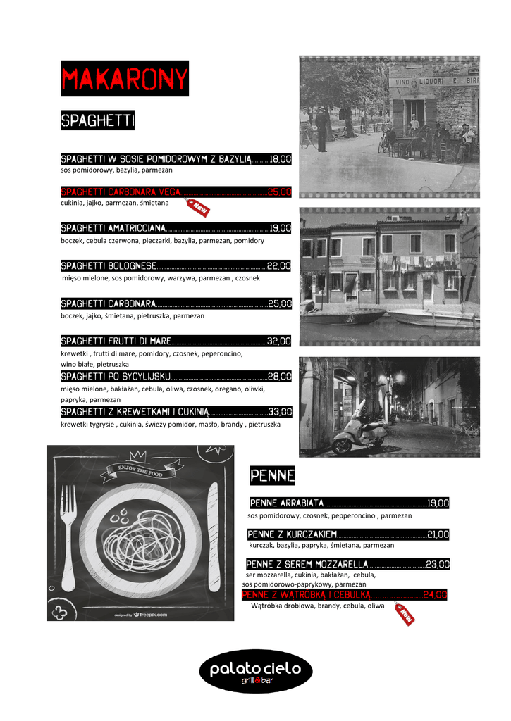 MAKARONY SPAGHETTI Spaghetti w sosie pomidorowym z bazylią...........18,00 sos pomidorowy, bazylia, parmezan Spaghetti carbonara vega.....................................................25,00 cukinia, jajko, parmezan, śmietana Spaghetti amatricciana...............................................................19,00 boczek, cebula czerwona, pieczarki, bazylia, parmezan, pomidory Spaghetti bolognese...................................................................22,00 mięso mielone, sos pomidorowy, warzywa, parmezan , czosnek Spaghetti carbonara....................................................................25,00 boczek, jajko, śmietana, pietruszka, parmezan Spaghetti frutti di mare..........................................................32,00 krewetki , frutti di mare, pomidory, czosnek, peperoncino, wino białe, pietruszka Spaghetti po sycylijsku...........................................................28,00 mięso mielone, bakłażan, cebula, oliwa, czosnek, oregano, oliwki, papryka, parmezan Spaghetti z krewetkami i cukinią....................................33,00 krewetki tygrysie , cukinia, świeży pomidor, masło, brandy , pietruszka Penne Penne arrabiata .............................................................19,00 sos pomidorowy, czosnek, pepperoncino , parmezan Penne z Kurczakiem.......................................................21,00 kurczak, bazylia, papryka, śmietana, parmezan Penne z serem mozzarella...................................23,00 ser mozzarella, cukinia, bakłażan, cebula, sos pomidorowo-paprykowy, parmezan Penne z wątróbką i cebulką……………….......24,00 Wątróbka drobiowa, brandy, cebula, oliwa TAGIATELLE Tagiatelle z szynką i pieczarkami ..........................................23,00 śmietana, szynka, cebula czerwona, pieczarki, parmezan Tagiatelle diavolo z kurczakiem............................................24,00 kurczak, czosnek, peperoncino, sos pomidorowy, parmezan Tagiatelle po wenecku.......................................................................26,00 pieczarki, kurczak, sos śmietanowo-serowy, cebula, pietruszka, czosnek, parmezan Tagiatelle ze szpinakiem...................................................................22,00 szpinak, parmezan, śmietana, gorgonzola Tagiatelle z łososiem..........................................................................28,00 łosoś, śmietana, cebula, cukinia, pietruszka Tagiatelle Palato Cielo ...................................................................29,00 polędwica wołowa, podgrzybki, cebula, czosnek, śmietana, świeży rozmaryn, wino białe PAPPARDELLE Pappardelle piccante..................................................................28,00 sos pomidorowy, salami piccante, grzyby Pappardelle truflowe.............................................................27,00 pasta truflowa, kurczak, pepperoncino Pappardelle quattro formaggi...........................................29,00 ser gorgonzola, feta, parmezan i mozzarella, śmietana Pappardelle z polędwiczką i pastą truflową..28,00 polędwiczka wieprzowina, śmietana, pasta truflowa, pieprz DANIA Z PIECA Penne zapiekane mozzarellą i sosem bolońskim sos boloński, mozzarella.........................................21 zł Penne zapiekane mozzarellą i kurczakiem pierś z kurczaka, beszamel, brokuł, mozzarella......21 zł Pierożki mięsne zapiekane mozzarellą tortellini , sos boloński, beszamel, mozzarella…….24 zł Spaghetti alla carbonara zapiekana mozzarellą boczek, jajko, śmietana, parmezan, sos śmietanowy…….21 zł Spaghetti zapiekane mozzarellą i boczkiem sos pomidorowy, boczek, bakłażan, mozzarella.....21 zł Lasagne mięsna sos boloński, beszamel, mozzarella, parmezan......19 zł