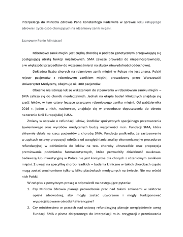 Interpelacja do Ministra Zdrowia Pana Konstantego Radziwiłła w sprawie leku ratującego zdrowie i życie osób chorujących na rdzeniowy zanik mięśni. Szanowny Panie Ministrze! Rdzeniowy zanik mięśni jest ciężką chorobą o podłożu genetycznym przejawiającą się postępującą utratą funkcji mięśniowych. SMA zawsze prowadzi do niepełnosprawności, a w większości przypadków do wczesnej śmierci na skutek niewydolności oddechowej. Dokładna liczba chorych na rdzeniowy zanik mięśni w Polsce nie jest znana. Polski rejestr pacjentów z rdzeniowym zanikiem mięśni, prowadzony przez Warszawski Uniwersytet Medyczny, obejmuje ok. 300 pacjentów. Obecnie nie istnieje lek ze wskazaniem do stosowania w rdzeniowym zaniku mięśni – SMA zalicza się do chorób nieuleczalnych. Jednak na etapie badań klinicznych znajduje się sześć leków, w tym cztery leczące przyczyny rdzeniowego zaniku mięśni. Od października 2016 r. jeden z nich, nusinersen, znajduje się w procedurze dopuszczenia do obrotu na terenie Unii Europejskiej i USA. Zmiany w ustawie o refundacji leków, środków spożywczych specjalnego przeznaczenia żywieniowego oraz wyrobów medycznych budzą wątpliwości m.in. Fundacji SMA, która aktywnie działa na rzecz pacjentów z chorobą SMA. Fundacja podkreśla, że zastosowanie w zapisach ustawy propozycji odejścia od uwzględniania analizy ekonomicznej w procedurze refundacyjnej w odniesieniu do leków na tzw. choroby ultrarzadkie oraz propozycja premiowania podmiotów farmaceutycznych, które prowadziły działalność naukowobadawczą lub inwestycyjną w Polsce nie jest korzystne dla chorych z rdzeniowym zanikiem mięśni. Z uwagi na specyfikę chorób rzadkich – badania kliniczne w takich chorobach często mogą zostać uruchomione tylko w kilku placówkach medycznych na świecie. Nie ma wśród nich Polski. W związku z powyższym proszę o odpowiedź na następujące pytania: 1. Czy Ministra Zdrowia planuje prowadzenie prac nad takimi zmianami w sektorze opieki zdrowotnej, aby mogły zostać utworzone i mogły funkcjonować wyspecjalizowane ośrodki Referencyjne? 2. Czy ministerstwo w pracach nad ustawą refundacyjną planuje uwzględnienie uwag Fundacji SMA z pisma dołączonego do interpelacji m.in. rezygnacji z premiowania uprzedniej działalności naukowo-badawczej i inwestycyjnej na terenie Rzeczypospolitej Polskiej w procedurze refundacyjnej w odniesieniu do leków na choroby rzadkie? Z poważaniem Poseł Małgorzata Zwiercan