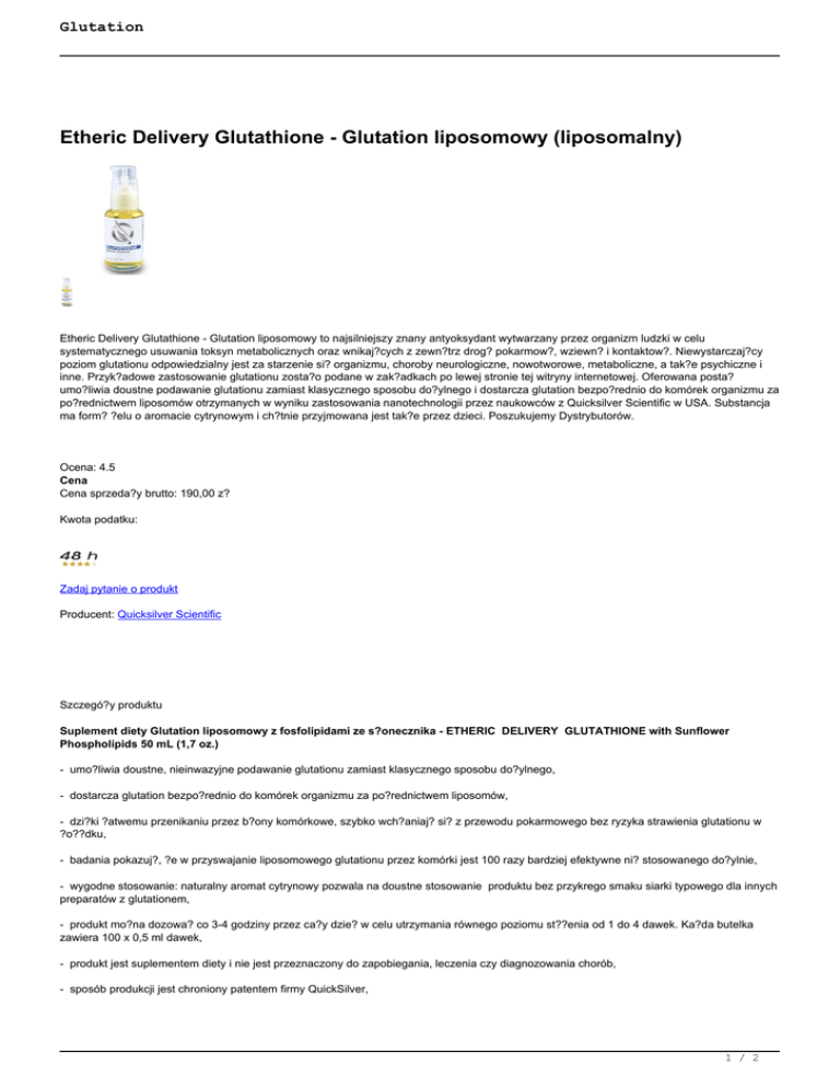 Glutation Etheric Delivery Glutathione - Glutation liposomowy (liposomalny) Etheric Delivery Glutathione - Glutation liposomowy to najsilniejszy znany antyoksydant wytwarzany przez organizm ludzki w celu systematycznego usuwania toksyn metabolicznych oraz wnikaj?cych z zewn?trz drog? pokarmow?, wziewn? i kontaktow?. Niewystarczaj?cy poziom glutationu odpowiedzialny jest za starzenie si? organizmu, choroby neurologiczne, nowotworowe, metaboliczne, a tak?e psychiczne i inne. Przyk?adowe zastosowanie glutationu zosta?o podane w zak?adkach po lewej stronie tej witryny internetowej. Oferowana posta? umo?liwia doustne podawanie glutationu zamiast klasycznego sposobu do?ylnego i dostarcza glutation bezpo?rednio do komórek organizmu za po?rednictwem liposomów otrzymanych w wyniku zastosowania nanotechnologii przez naukowców z Quicksilver Scientific w USA. Substancja ma form? ?elu o aromacie cytrynowym i ch?tnie przyjmowana jest tak?e przez dzieci. Poszukujemy Dystrybutorów. Ocena: 4.5 Cena Cena sprzeda?y brutto: 190,00 z? Kwota podatku: Zadaj pytanie o produkt Producent: Quicksilver Scientific Szczegó?y produktu Suplement diety Glutation liposomowy z fosfolipidami ze s?onecznika - ETHERIC DELIVERY GLUTATHIONE with Sunflower Phospholipids 50 mL (1,7 oz.) - umo?liwia doustne, nieinwazyjne podawanie glutationu zamiast klasycznego sposobu do?ylnego, - dostarcza glutation bezpo?rednio do komórek organizmu za po?rednictwem liposomów, - dzi?ki ?atwemu przenikaniu przez b?ony komórkowe, szybko wch?aniaj? si? z przewodu pokarmowego bez ryzyka strawienia glutationu w ?o??dku, - badania pokazuj?, ?e w przyswajanie liposomowego glutationu przez komórki jest 100 razy bardziej efektywne ni? stosowanego do?ylnie, - wygodne stosowanie: naturalny aromat cytrynowy pozwala na doustne stosowanie produktu bez przykrego smaku siarki typowego dla innych preparatów z glutationem, - produkt mo?na dozowa? co 3-4 godziny przez ca?y dzie? w celu utrzymania równego poziomu st??enia od 1 do 4 dawek. Ka?da butelka zawiera 100 x 0,5 ml dawek, - produkt jest suplementem diety i nie jest przeznaczony do zapobiegania, leczenia czy diagnozowania chorób, - sposób produkcji jest chroniony patentem firmy QuickSilver, 1 / 2 Glutation - produkt jest suplementem diety zarejestrowanym i dopuszczonym do obrotu przez Generalny Inspektorat Sanitarny w Polsce. Zalecana do spo?ycia dzienna porcja: 2 porcje dozownika bezpo?rednio do jamy ustnej 2 razy dziennie. Jedna porcja dozownika - 0,5 mL, to porcja p?ynu uzyskana po naci?ni?ciu dozownika. Ilo?? porcji dozownika w opakowaniu: 100. Preparat nale?y przetrzyma? w jamie ustnej pomi?dzy policzkiem a dzi?s?ami przez 30 sekund przed po?kni?ciem. Preparat mo?e by? rozcie?czany w wodzie. Po otwarciu preparat nale?y zu?y? w ci?gu 30 dni i przechowywa? w lodówce. Maksymalna zalecana do spo?ycia dzienna porcja: 2 mL – 4 porcje dozownika. Ilo?? porcji dziennych w opakowaniu: 25. Wykaz sk?adników % zalecanej do spo?ycia dziennego dziennej porcji spo?ycia Fosfolipidy (z oczyszczonej x lecytyny s?onecznikowej) – 240 mg Zredukowany glutation – 200 x mg Sód - 14 mg x (x – nie okre?lono dziennego spo?ycia) Dodatki: aromat cytrynowy olejek eteryczny (naturalny cytrynowy olejek eteryczny (olej ze skórki cytryny) w ilo?ci 0,002 mg/mL). Zawiera ?ladowe ilo?ci : woda, etanol i gliceryna - s?u?? do stabilizacji struktury liposomowej glutationu w procesie produkcji. Opinie sobota, 20, lipiec 2013 U?ywam Etheric Delivery glutation od trzech miesi?cy i w moim przypadku dzia?a znakomicie.Mam zasz?o?ci genetyczne,urazy mózgu, powa?ne traumy ,a od 11 lat jestem na marginesie ?ycia z powodu powa?nych problemów zdrowotnych obejmuj?cych prawie ca?y organizm :porfiria,brak odporno?ci,neuroborelioza,chlamydioza, kandydoza,autoimmunologia,schorzenia jelit,tocze? uk?adowy,znaczne os?abienie wzroku ,paso?yty, wirusy... Lekarze medycyny konwencjonalnej - bezradni,a kolejne terapie niekonwencjonalne dawa?y mierne rezultaty a? do chwili kiedy wprowadzi?am glutation,a raczej pocz?tkowo /nie by?o jeszcze liposomowego/ cystein? i inne substraty do jego syntezy w organizmie.Przynosi?o to rezultaty,ale w bardzo ograniczonym zakresie,ze wzgl?du na problemy enzymatyczne .Dopiero gdy zastosowa?am glutation liposomowy procesy w organizmie ruszy?y 'z kopyta'. Przede wszystkim detoksykacja,hamowanie stanów zapalnych i stan krwi.I g?ównie dotyczy to najbardziej uszkodzonych organów - mózg,uk.pokarmowy i oddechowy.Oczywi?cie,równocze?nie stosuj? ca?y zestaw preparatów wspomagaj?cych i regeneruj?cych organizm m.in.mikroelementy.Ale to glutation jest g?ównym rozgrywaj?cym w tej trudnej grze.Barbara B.K. ?roda, 30, listopad -0001 Chce podzieli? si? swoj? obserwacj? rewelacyjnego dzia?ania tego glutationu na zatrucie alkoholowe. Wzi??am 4 dawki przed imprez? i 4 po, a rano wsta?am w ?wietnym stanie, co, jak do tej pory, nie zdarza?o mi si?. Pisz? o tym moim eksperymencie, bo na stronie nie ma wogóle informacji o zapobieganiu kacowi przez zastosowanie glutationu. Kupi?am go na ogólne odtruwanie z toksyn, ale dopiero brak kaca udowodni? mi jego skuteczno??. Pozdrawiam. Iza. 2 / 2 Powered by TCPDF (www.tcpdf.org)