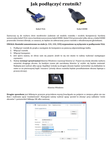 Jak podłączyć rzutnik? Kabel VGA Kabel HDMI Zazwyczaj są do wyboru dwie możliwości (zależnie od modelu rzutnika i modelu komputera): bardziej uniwersalny kabel VGA i nieco bardziej nowoczesny kabel HDMI. Kabel VGA przewodzi tylko obraz, a kabel HDMI przewodzi również dźwięk, co oznacza, że będzie on odtwarzany przez rzutniki z wbudowanymi głośnikami. UWAGA: Rzutniki zamontowane na stałe (s. 131, 132, 335) wyposażone są wyłącznie w podłączenie VGA. 1. 2. 3. 4. Podłączyć rzutnik do prądu a następnie do komputera za pomocą odpowiedniego kabla. Włączyć rzutnik. Włączyć komputer. Jest spora szansa, że obraz sam się pojawi. Jeżeli to się nie stanie to należy wykonać następujące czynności: 5. Należy wcisnąć i przytrzymać klawisz Windows i nacisnąć klawisz ‘p’. Pojawi się wtedy okienko wyboru ustawień drugiego ekranu. Za każdym razem jak naciskamy klawisz ‘p’ wybór się będzie zmieniał. Najlepiej jest wybrać albo opcję ‘duplikuj’ (wtedy na drugim ekranie będzie wyświetlać się dokładnie to samo co na pierwszym) bądź ‘rozszerz’ (wtedy ekran rzutnika będzie przedłużeniem ekranu laptopa z prawej strony). Klawisz Windows Drugim sposobem jest kliknięcie prawym przyciskiem myszy/touchpada na pulpicie w miejscu gdzie nie ma ikon i wybranie opcji ‘rozdzielczość’. Następnie należy wybrać opcję ‘powiel te ekrany’ przy zakładce ‘wiele ekranów’ i potwierdzić klikając OK albo zastosuj.