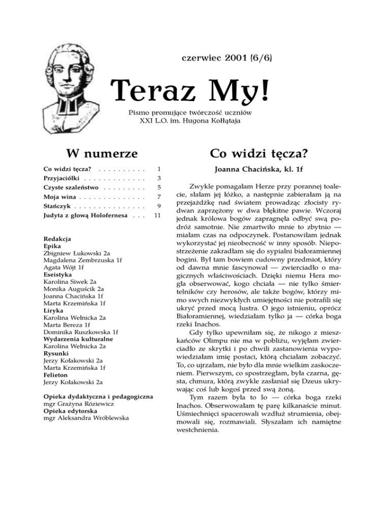 czerwiec 2001 (6/6) Teraz My! Pismo promujące twórczość uczniów XXI L.O. im. Hugona Kołłątaja W numerze Co widzi tęcza? . . . . . . . . . . 1 Przyjaciółki . . . . . . . . . . . . . 3 Czyste szaleństwo . . . . . . . . . 5 Moja wina . . . . . . . . . . . . . . 7 Stańczyk . . . . . . . . . . . . . . . 9 Judyta z głową Holofernesa . . . 11 Co widzi tęcza? Redakcja Epika Zbigniew Łukowski 2a Magdalena Zembrzuska 1f Agata Wójt 1f Eseistyka Karolina Siwek 2a Monika Auguścik 2a Joanna Chacińska 1f Marta Krzemińska 1f Liryka Karolina Wełnicka 2a Marta Bereza 1f Dominika Ruszkowska 1f Wydarzenia kulturalne Karolina Wełnicka 2a Rysunki Jerzy Kołakowski 2a Marta Krzemińska 1f Felieton Jerzy Kołakowski 2a Opieka dydaktyczna i pedagogiczna mgr Grażyna Róziewicz Opieka edytorska mgr Aleksandra Wróblewska Joanna Chacińska, kl. 1f Zwykle pomagałam Herze przy porannej toalecie, słałam jej łóżko, a następnie zabierałam ją na przejażdżkę nad światem prowadząc złocisty rydwan zaprzężony w dwa błękitne pawie. Wczoraj jednak królowa bogów zapragnęła odbyć swą podróż samotnie. Nie zmartwiło mnie to zbytnio — miałam czas na odpoczynek. Postanowiłam jednak wykorzystać jej nieobecność w inny sposób. Niepostrzeżenie zakradłam się do sypialni białoramiennej bogini. Był tam bowiem cudowny przedmiot, który od dawna mnie fascynował — zwierciadło o magicznych właściwościach. Dzięki niemu Hera mogła obserwować, kogo chciała — nie tylko śmiertelników czy herosów, ale także bogów, którzy mimo swych niezwykłych umiejętności nie potrafili się ukryć przed mocą lustra. O jego istnieniu, oprócz Białoramiennej, wiedziałam tylko ja — córka boga rzeki Inachos. Gdy tylko upewniłam się, że nikogo z mieszkańców Olimpu nie ma w pobliżu, wyjęłam zwierciadło ze skrytki i po chwili zastanowienia wypowiedziałam imię postaci, którą chciałam zobaczyć. To, co ujrzałam, nie było dla mnie wielkim zaskoczeniem. Pierwszym, co spostrzegłam, była czarna, gęsta, chmura, którą zwykle zasłaniał się Dzeus ukrywając coś lub kogoś przed swą żoną. Tym razem była to Io — córka boga rzeki Inachos. Obserwowałam tę parę kilkanaście minut. Uśmiechnięci spacerowali wzdłuż strumienia, obejmowali się, rozmawiali. Słyszałam ich namiętne westchnienia. 2 Teraz My 6/2001— Epika Wiedziałam, że król bogów odwiedzał Io już wcześniej. Hera też coś chyba podejrzewała. Gdy siedziała smętnie zamyślona, miałam wrażenie, iż obmyśla jakiś sposób na ukaranie męża. Mimo że pomiędzy Dzeusem a Io działy się coraz ciekawsze rzeczy, musiałam odłożyć lustro na miejsce, gdyż zbliżał się czas powrotu mojej pani. Do pałacu Hera weszła bardzo rozgniewana. W jej oczach widziałam wściekłość, ale i cierpienie. Posłała mnie na ziemię, bym sprowadziła Dzeusa. Rozłożyłam moje szerokie, mieniące się barwami słońca skrzydła i po krótkiej chwili znajdowałam się już w miejscu spotkania nimfy z Gromowładnym. Niestety, nie zastałam tam zakochanej pary. Pomyślałam, że pomocy w poszukiwaniach mogłyby mi udzielić driady zamieszkujące pobliski las. Nie zdawałam sobie sprawy, iż może tam na mnie czyhać niebezpieczeństwo. Przemierzając gęstwiny nie spotkałam wprawdzie żadnej z nimf leśnych, jednak nie wydało mi się to dziwne. Wreszcie spostrzegłam niewielką, cudowną polankę. Uznałam, że należy mi się chwila odpoczynku. Wsłuchując się w uroczy śpiew ptaków zamknęłam oczy i nie wiedząc kiedy, zapadłam w drzemkę. Nagle obudziły mnie dziwne odgłosy. Zobaczyłam grupę satyrów podążających w moją stronę. Fauni znani są z krnąbrności i nieustępliwości. Czasami ośmielają się napadać nawet na boginie. Ogarnął mnie strach. Starałam się jak najszybciej wzbić w powietrze, lecz satyrowie byli już bardzo blisko. Poczułam przenikliwy ból, gdy jeden z nich szarpnął mnie mocno, ale na szczęście udało mi się uciec. Z trudem powróciłam do pałacu. Dopiero w swojej komnacie zauważyłam, że z mego prawego skrzydła zostało wyrwanych kilka tęczowych piór. Zaraz potem wezwała mnie Hera. Oznajmiła mi, że wie, iż używałam jej zwierciadła. Obiecała, że mnie nie ukarze, jeśli jej pomogę. Wiem dobrze, jakie kary stosuje królowa bogów, więc od razu przystałam na jej propozycję. Białoramienna wyjaśniła mi przyczynę samotnej przejażdżki — otóż chciała się upewnić, czy rzeczywiście jest zdradzana. Od razu zrozumiałam, czego będzie ode mnie oczekiwać i nie myliłam się. Bogini wyjawiła mi plan zemsty, który opracowywała od kilku dni. Mój udział nie był zbyt wielki. Ulżyło mi, gdyż nie lubię się narażać władcom świata, a zwłaszcza — Dzeusowi. Było już późno, gdy wyruszyłam do odległej krainy po Argosa — stuokiego, nie śpiącego nigdy potwora. Przekazałam mu polecenia i wskazówki Hery, i powróciłam na Olimp. Dziś z samego rana zabrałam Białoramienną jej rydwanem nad strumień Inachos. Hera uczyniła się niewidzialną i sprawiła także, że zniknął powóz. Tu zaczęła się moja rola. Poprosiłam jedną z nimf bawiących się nad rzeką, by przekazała Io, iż czekam na nią z niezwykle ważną wiadomością od Dzeusa. Po kilku minutach kochanka Gromowładnego wybiegła z zamku swego ojca. Była szczęśliwa, na pięknej twarzy widniał uśmiech. Gdy tak na nią patrzyłam, zrobiło mi się jej żal. Chciałam ją nawet ostrzec, jednak nie zdążyłam. Hera skierowała swój lodowaty a zarazem żądny zemsty wzrok w stronę dziewczyny i ta w jednej chwili zamieniła się w jałówkę. Następnie bogini rozkazała Argosowi ukryć Io w jednej ze wskazanych mu wcześniej świątyń i strzec jej. Nie wiem, gdzie wtedy znajdował się Dzeus, ale myślę, że przyglądał się on całemu zajściu. Nie rozumiem, dlaczego nie 3 Teraz My 6/2001— Epika walczył o swą miłość i uległ Herze. Mo