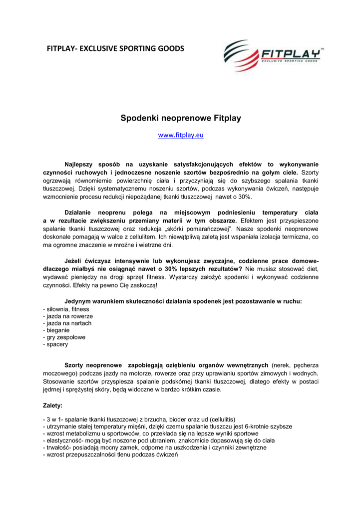 FITPLAY- EXCLUSIVE SPORTING GOODS Spodenki neoprenowe Fitplay www.fitplay.eu Najlepszy sposób na uzyskanie satysfakcjonujących efektów to wykonywanie czynności ruchowych i jednoczesne noszenie szortów bezpośrednio na gołym ciele. Szorty ogrzewają równomiernie powierzchnię ciała i przyczyniają się do szybszego spalania tkanki tłuszczowej. Dzięki systematycznemu noszeniu szortów, podczas wykonywania ćwiczeń, następuje wzmocnienie procesu redukcji niepożądanej tkanki tłuszczowej nawet o 30%. Działanie neoprenu polega na miejscowym podniesieniu temperatury ciała a w rezultacie zwiększeniu przemiany materii w tym obszarze. Efektem jest przyspieszone spalanie tkanki tłuszczowej oraz redukcja „skórki pomarańczowej”. Nasze spodenki neoprenowe doskonale pomagają w walce z cellulitem. Ich niewątpliwą zaletą jest wspaniała izolacja termiczna, co ma ogromne znaczenie w mroźne i wietrzne dni. Jeżeli ćwiczysz intensywnie lub wykonujesz zwyczajne, codzienne prace domowedlaczego miałbyś nie osiągnąć nawet o 30% lepszych rezultatów? Nie musisz stosować diet, wydawać pieniędzy na drogi sprzęt fitness. Wystarczy założyć spodenki i wykonywać codzienne czynności. Efekty na pewno Cię zaskoczą! Jedynym warunkiem skuteczności działania spodenek jest pozostawanie w ruchu: - siłownia, fitness - jazda na rowerze - jazda na nartach - bieganie - gry zespołowe - spacery Szorty neoprenowe zapobiegają oziębieniu organów wewnętrznych (nerek, pęcherza moczowego) podczas jazdy na motorze, rowerze oraz przy uprawianiu sportów zimowych i wodnych. Stosowanie szortów przyspiesza spalanie podskórnej tkanki tłuszczowej, dlatego efekty w postaci jędrnej i sprężystej skóry, będą widoczne w bardzo krótkim czasie. Zalety: - 3 w 1- spalanie tkanki tłuszczowej z brzucha, bioder oraz ud (cellulitis) - utrzymanie stałej temperatury mięśni, dzięki czemu spalanie tłuszczu jest 6-krotnie szybsze - wzrost metabolizmu u sportowców, co przekłada się na lepsze wyniki sportowe - elastyczność- mogą być noszone pod ubraniem, znakomicie dopasowują się do ciała - trwałość- posiadają mocny zamek, odporne na uszkodzenia i czynniki zewnętrzne - wzrost przepuszczalności tlenu podczas ćwiczeń Dostępne rozmiary: S M L XL XXL pas biodra długość stan 2x33cm 2x34cm 2x39cm 2x41cm 2x42cm 2x43cm 2x46cm 2x50cm 2x53cm 2x57cm 44cm 44cm 46cm 49cm 52cm 35cm 35cm 37cm 40cm 41cm Spodenki są bardzo elastyczne- nie będziesz mieć problemów z dopasowaniem odpowiedniego rozmiaru, ponieważ doskonale przylegają do ciała. WAŻNE: 1. 2. 3. 4. 5. Nie używać na wrażliwą skórę. Wyprać przed użyciem. Wziąć prysznic po użyciu produktu aby zapobiec podrażnieniu skóry. Nie zaleca się spania w spodenkach. Prać w letniej wodzie i suszyć w temperaturze pokojowej. Spodenki mogą nosić zarówno kobiety, jak mężczyźni! UWAGA: Jeżeli na ciele wystąpią podrażnienia, zaniechaj używania spodenek. PRANIE: Zalecane pranie ręczne w letniej wodzie. Nie prać w pralce, nie suszyć w suszarce! Suszyć w temperaturze pokojowej. GWARANCJA: Gwarantujemy, że produkt nie posiada żadnych wad. Gwarancja ta obowiązuje przez dwa lata od daty zakupu. 1. Gwarancja naprawy: jeżeli produkt nie działa prawidłowo w okresie objętym gwarancją i jest to spowodowane usterką materiałową, zastrzegamy sobie prawo do jego naprawy na koszt własny z uwzględnieniem poniższych ograniczeń lub wymianę na nowy. Usługa naprawy będzie zawierała wszelkie niezbędne czynności, jak również koszt części zamiennych. 2. Ograniczenia: gwarancja nie zostanie uwzględniona i będzie unieważniona, jeżeli produkt nie zostanie zapakowany w odpowiedni sposób, a w czasie transportu ulegnie uszkodzeniu. Naprawa lub wymiana produktu następuje tylko i wyłącznie na podstawie dowodu zakupu (faktura lub paragon). Nie ponosimy odpowiedzialności za zdarzenia wynikające z nieprawidłowego użytkowania produktu również w stosunku do osób trzecich. 3. W jaki sposób korzystać z usług serwisowych. W przypadku przesłania produktu do naprawy, należy zapakować go w sposób zabezpieczający przed uszkodzeniem w czasie transportu, jak również w miarę możliwości załączyć informację opisującą przyczynę reklamacji. 4. Zwrotu towaru można dokonać jedynie odsyłając towar wraz z oryginalną fakturą lub paragonem na adres: Optiner S.A. Dragany 24B 23-145 Wysokie Przed odesłaniem produktu do serwisu, skontaktuj się z gwarantem na adres: [email protected] w celu nadania numeru RMA. PACZKI ZA POBRANIEM, NA KOSZT ODBIORCY ORAZ BEZ WIDOCZNEGO NUMERU RMA NIE BĘDĄ PRZYJMOWANE.